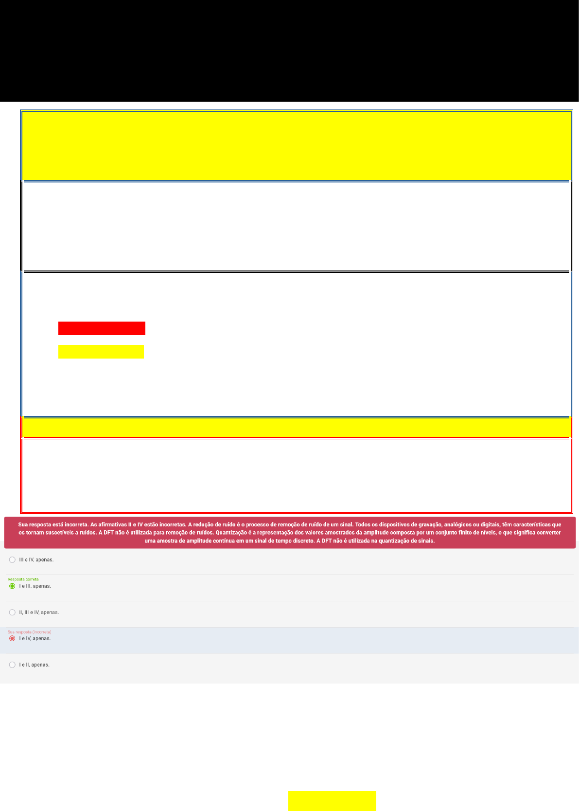 ATIVIDADE 2 (A2) 08.2 (PROCESSAMENTO DIGITAL DE SINAIS) 1) A Transformada de Fourier Discreta − tempo/frequência discreta (normalmente, conhecida apenas como Transformada Discreta de Fourier ou Discrete Fourier Transform (DFT) − é o estágio final na conversão para um sistema totalmente amostrado. Além de mostrar a forma de onda do tempo, somente pontos de frequência discretos são calculados. A respeito da Transformada Discreta de Fourier, analise as afirmativas a seguir: I. É capaz de determinar o componente de frequência do sinal. II. Consegue remover o ruído de um sinal. III. É utilizada para projetos de filtros. IV. É possível realizar a quantização de sinal. Está correto o que se afirma em: A) III e IV, apenas. B) I e III, apenas. C) I e IV, apenas. D) I e II, apenas. E) II, III e IV, apenas. Comentário da resposta: Sua resposta está incorreta. As afirmativas II e IV estão incorretas. A redução de ruído é o processo de remoção de ruído de um sinal. Todos os dispositivos de gravação, analógicos ou digitais, têm características que os tornam suscetíveis a ruídos. A DFT não é utilizada para remoção de ruídos. Quantização é a representação dos valores amostrados da amplitude composta por um conjunto finito de níveis, o que significa converter uma amostra de amplitude contínua em um sinal de tempo discreto. A DFT não é utilizada na quantização de sinais. 8 SEMESTRE DE 2023 (BLOCO 1) – 2o PROVA ATIVIDADE 2 (PROCESSAMENTO DIGITAL DE SINAIS) 2) As funções exponenciais crescem ou decrescem por fatores comuns, em intervalos iguais. Assim, as funções exponenciais são usadas para modelar uma ampla gama de situações da vida real (como populações, bactérias, substâncias radioativas, temperaturas, contas bancárias, pagamentos de crédito, juros compostos, eletricidade, medicamentos, torneios etc.). A figura a seguir apresenta uma sequência exponencial decrescente. Fonte: Elaborada pelo autor. #PraCegoVer: a figura apresenta um gráfico com um sinal exponencial real decrescente, com índice de tempo n variando entre 0, 5, 10, 15, 20, 25, 30 e 35, e a amplitude máxima fica entre 0, 2, 4, 6, 8, 10, 12, 14, 16, 18 e 20. Assinale a alternativa que apresenta, corretamente, o comprimento dessa sequência. A) 20 valores discretos. B) 36 valores discretos. C) Infinitos valores discretos. D) Nenhum valor discreto. E) 35 valores discretos. Comentário da resposta: Resposta correta. Nessa sequência, há 36 valores discretos, o que representa um comprimento igual a 36. O primeiro valor da sequência em zero tem amplitude igual a 20, e o último valor da sequência tem amplitude próxima de zero, logo, no eixo x, considerando o primeiro valor discreto com amplitude igual a 20 até o último valor discreto com amplitude próxima de zero, há 36 valores discretos no gráfico. 8 SEMESTRE DE 2023 (BLOCO 1) – 2o PROVA ATIVIDADE 2 (PROCESSAMENTO DIGITAL DE SINAIS) 3) O domínio do tempo refere-se a uma descrição do sinal em relação ao tempo. Os sistemas são classificados nas seguintes categorias: lineares e não lineares; variante no tempo e invariantes no tempo; estáticos e dinâmicos; causais e não causais; invertíveis e não invertíveis; estáveis e instáveis. Assim, um sistema é definido como não causal, quando a saída no presente: A) não depende do fator de tempo. B) depende da entrada no momento atual. C) depende da entrada em um momento anterior. D) depende de a entrada ser diferente de zero. E) depende da entrada em um instante de tempo no futuro. Comentário da resposta: Resposta correta. A alternativa está correta, pois um sistema é causal se sua saída depende de entradas presentes e passadas, e não depende de entradas futuras. Para o sistema não causal, a saída depende, também, de entradas futuras. Não causal significa que a resposta do sistema precisa começar antes da excitação, por exemplo. 8 SEMESTRE DE 2023 (BLOCO 1) – 2o PROVA ATIVIDADE 2 (PROCESSAMENTO DIGITAL DE SINAIS) 4) Um fato importante é que qualquer sinal pode ser decomposto em uma soma de dois sinais: um é par e um é ímpar. Então, qualquer sequência arbitrária de valor real x(n) pode ser decomposta em seus componentes pares e ímpares. A figura a seguir representa um sinal em sua forma original. Fonte: Elaborada pelo autor. #PraCegoVer: a figura representa um gráfico de um sinal original, sendo que o eixo x varia entre - 20, - 15, - 10, - 5, 0, 5, 10, 15 e 20, e o eixo y variando entre 0, 0,5 e 1. Na imagem, no eixo x, o sinal de - 20 a 0 está no 0; no eixo x de 0 a 20, a amplitude do sinal passa de 0 para 1. Considerando as informações apresentadas a respeito da decomposição desse sinal em seus componentes pares e ímpares, analise as afirmativas a seguir. I. O componente par varia de - 20 até 20, com amplitude igual a 0,5 e, em x igual a 0, a amplitude do sinal é 1. II. O componente par varia de - 15 até 15, com amplitude igual a 0,5 e, em x igual a 0, a amplitude do sinal é 1. III. O componente ímpar varia de - 20 até 0, com amplitude igual a - 0,5; em zero, a amplitude do sinal é igual a zero; de zero até 20, a amplitude do sinal é 0,5. IV. O componente ímpar varia de - 20 até zero, com amplitude igual a 0,5; em x zero, a amplitude do sinal é igual a 1; de zero até 20, a amplitude do sinal é 0,5. Está correto o que se afirma em: A) I, II e IV, apenas. B) I e II, apenas. C) II e IV, apenas. D) I e III, apenas. E) II e III, apenas. Comentário da resposta: Resposta correta. A alternativa está correta. Para uma sequência real ser par, é necessário que x [n] = x [– n] e, para uma sequência real ser ímpar, é necessário que x [n] = – x [– n], logo, a componente par varia de – 20 até 20, com amplitude igual a 0,5; em x igual a 0, a amplitude do sinal é 1 e a componente ímpar varia de – 20 até 0, com amplitude igual a – 0,5; em zero, a amplitude do sinal é igual a zero; de zero até 20, a amplitud