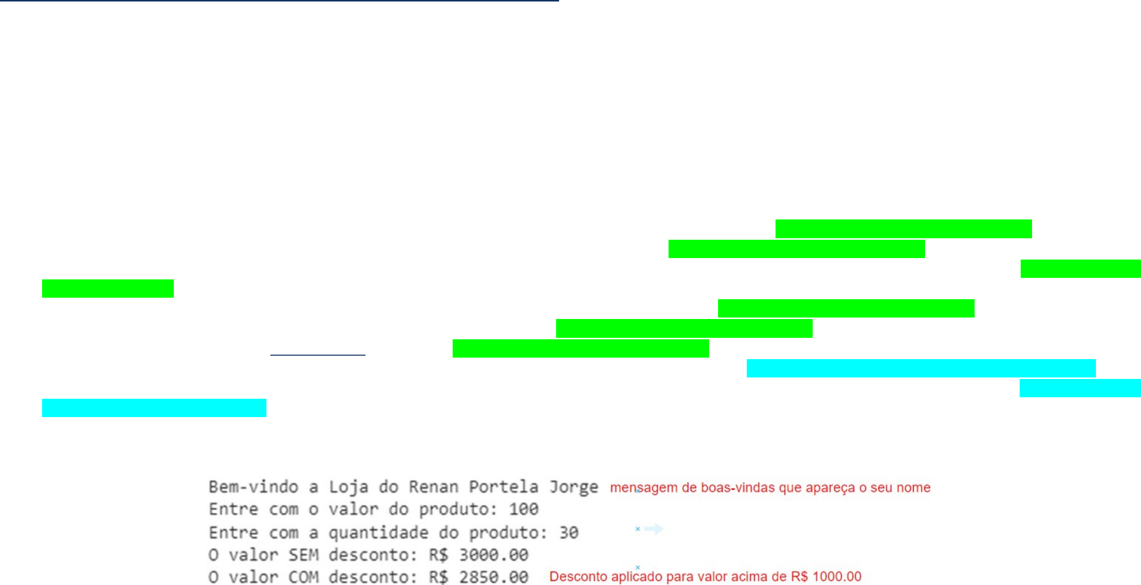 QUESTÃO 1 de 4 - Conteúdo até aula 03 Enunciado: Imagina-se que você é um dos programadores responsáveis pela construção de app de vendas para uma determinada empresa X que vende em atacado. Uma das estratégias de vendas dessa empresa X é dar desconto maiores conforme o valor da compra conforme a listagem abaixo: · Se valor for menor que 1000 o desconto será de 0%; · Se valor for igual ou maior que 1000 e menor que 3000 o desconto será de 3%; · Se valor for igual ou maior que 3000 e menor que 5000 o desconto será de 5%; · Se valor for igual ou maior que 5000 o desconto será de 8%; Elabore um programa em Python que: A. Deve-se implementar o print com uma mensagem de boas-vindas que apareça o seu nome [EXIGÊNCIA DE CÓDIGO 1 de 6]; B. Deve-se implementar o input do valor unitário e da quantidade do produto [EXIGÊNCIA DE CÓDIGO 2 de 6]; C. Deve-se implementar o desconto conforme a enunciado acima (obs.: atente-se as condições de menor, igual e maior) [EXIGÊNCIA DE CÓDIGO 3 de 6]; D. Deve-se implementar o valor total sem desconto e o valor total com desconto [EXIGÊNCIA DE CÓDIGO 4 de 6]; E. Deve-se implementar as estruturas if, elif e else (todas elas) [EXIGÊNCIA DE CÓDIGO 5 de 6]; F. Deve-se inserir comentários relevantes no código [EXIGÊNCIA DE CÓDIGO 6 de 6]; G. Deve-se apresentar na saída de console uma mensagem de boas-vindas com seu nome [EXIGÊNCIA DE SAÍDA DE CONSOLE 1 de 2]; H. Deve-se apresentar na saída de console um pedido recebendo desconto (valor total sem desconto acima de 1000 ) [EXIGÊNCIA DE SAÍDA DE CONSOLE 2 de 2]; EXEMPLO DE SAÍDA DE CONSOLE: Figura 1: Exemplo de saída de console que o aluno deve fazer. Em que se perguntar o valor do produto (pode ser qualquer valor) a quantidade (pode ser qualquer valor) o resultado da multiplicação produto pela quantidade deve ser maior que 1000 para que haja desconto. Apresentação de Código da Questão 1: SUBSTITUIR O QUE ESTÁ EM VERMELHO PELO O CÓDIGO DO EXERCÍCIO 1. NÃO ESQUECER DE CUMPRIR A(S) EXIGÊNCIA(S) SÓ SERAM ACEITOS CÓDIGOS NO FORMATO TEXTO (NADA DE IMAGEM). Apresentação de Saída do Console da Questão 1: SUBSTITUIR O QUE ESTÁ EM VERMELHO PELA A SAÍDA DO CONSOLE DO EXERCÍCIO 1 NÃO ESQUECER DE CUMPRIR O(S) EXIGÊNCIA (S) SÓ SERAM ACEITAS SAÍDAS DO CONSOLE NO FORMATO IMAGEM (NADA DE TEXTO). QUESTÃO 2 de 4 - Conteúdo até aula 04 Enunciado: Você e sua equipe de programadores foram contratados para desenvolver um app de vendas para uma loja que vende Açaí e Cupuaçu. Você ficou com a parte de desenvolver a interface do cliente para retirada do produto. A Loja possui seguinte relação: · Tamanho P de Cupuaçu (CP) custa 10 reais e o Açaí (AC) custa 12 reais; · Tamanho M de Cupuaçu (CP) custa 15 reais e o Açaí (AC) custa 17 reais; · Tamanho G de Cupuaçu (CP) custa 19 reais e o Açaí (AC) custa 21 reais; Elabore um programa em Python que: A. Deve-se implementar o print com uma mensagem de boas-vindas que apareça o seu nome [EXIGÊNCIA DE CÓDIGO 1 de 8]; B. Deve-se implementar o input do sabor (CP/AC) e o print “Sabor inválido. Tente novamente" se o usuário entra com valor diferente de CP e AC [EXIGÊNCIA DE CÓDIGO 2 de 8]; C. Deve-se implementar o input do tamanho (P/M/G) e o print “Tamanho inválido. Tente novamente" se o usuário com entra valor diferente de P,M ou G [EXIGÊNCIA DE CÓDIGO 3 de 8]; D. Deve-se implementar if/elif com cada uma das combinações de sabor e tamanho do enunciado [EXIGÊNCIA DE CÓDIGO 4 de 8]; E. Deve-se implementar um acumulador para somar os valores dos pedidos [EXIGÊNCIA DE CÓDIGO 5 de 8]; F. Deve-se implementar o input com a pergunta: “Deseja pedir mais alguma coisa?”. Se sim repetir a partir do item B, senão encerrar o programa executar o print do acumulador [EXIGÊNCIA DE CÓDIGO 6 de 8]; G. Deve-se implementar as estruturas de while, break, continue (todas elas) [EXIGÊNCIA DE CÓDIGO 7 de 8]; H. Deve-se inserir comentários relevantes no código [EXIGÊNCIA DE CÓDIGO 8 de 8]; I. Deve-se apresentar na saída de console uma mensagem de boas-vindas com o seu nome [EXIGÊNCIA DE SAÍDA DE CONSOLE 1 de 4]; J. Deve-se apresentar na saída de console um pedido em que o usuário errou o sabor [EXIGÊNCIA DE SAÍDA DE CONSOLE 2 de 4]; K. Deve-se apresentar na saída de console um pedido em que o usuário errou o tamanho [EXIGÊNCIA DE SAÍDA DE CONSOLE 3 de 4]; L. Deve-se apresentar na saída de console um pedido com duas opções sabores diferentes e com tamanhos diferentes [EXIGÊNCIA DE SAÍDA DE CONSOLE 4 de 4]; EXEMPLO DE SAÍDA DE CONSOLE: Figura 2: Exemplo de saída de console que o aluno deve fazer. Em que se perguntar o sabor ao tamanho. Há uma tentativa de pedido que se erro o sabor e outra que se errou o tamanho. Há também dois pedidos com sabores e tamanhos. Apresentação de Código da Questão 2: SUBSTITUIR O QUE ESTÁ EM VERMELHO PELO O CÓDIGO DO EXERCÍCIO 1. NÃO ESQUECER DE CUMPRIR A(S) EXIGÊNCIA(S) SÓ SERAM ACEITOS CÓDIGOS NO FORMATO TEXTO (NADA DE IMAGEM). Apresentação de Saída do Console da Questão 2: SUBSTITUIR O QUE ESTÁ EM VERMELHO PELA A SAÍDA DO CONSOLE DO EXERCÍCIO 1 NÃO ESQUECER DE CUMPRIR O(S) EXIGÊNCIA (S) SÓ SERAM ACEITAS SAÍDAS DO CONSOLE NO FORMATO IMAGEM (NADA DE TEXTO). QUESTÃO 3 de 4 - Conteúdo até aula 05 Enunciado: Você foi contratado para desenvolver um sistema de cobrança de serviços de uma copiadora. Você ficou com a parte de desenvolver a interface com o funcionário. A copiadora opera da seguinte maneira: · Serviço de Digitalização (DIG) o custo por página é de um real e dez centavos; · Serviço de Impressão Colorida (ICO) o custo por página é de um real; · Serviço de Impressão Preto e Branco (IBO) o custo por página é de quarenta centavos; · Serviço de Fotocópia (FOT) o custo por página é de vinte centavos; · Se número de páginas for menor que 10 retornar o número de página sem desconto; · Se número de páginas fo
