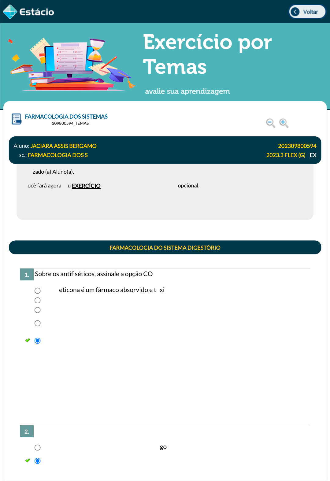 18/10/2023, 09:51 Estácio: Alunos https://simulado.estacio.br/bdq_simulados_exercicio_temas.asp?num_seq_aluno_turma=181173113&cod_hist_prova=319305050&num_seq_tur… 1/5 Exercício por Temas avalie sua aprendizagem Sobre os anti�séticos, assinale a opção CORRETA. Os fármacos cimetidina, ranitidina, omeprazol e pantoprazol: FARMACOLOGIA DOS SISTEMAS Lupa DGT1150_202309800594_TEMAS Aluno: JACIARA ASSIS BERGAMO Matr.: 202309800594 Disc.: FARMACOLOGIA DOS S 2023.3 FLEX (G) / EX Prezado (a) Aluno(a), Você fará agora seu EXERCÍCIO! Lembre-se que este exercício é opcional, mas não valerá ponto para sua avaliação. O mesmo será composto de questões de múltipla escolha. Após responde cada questão, você terá acesso ao gabarito comentado e/ou à explicação da mesma. Aproveite para se familiarizar com este modelo de questões que será usado na sua AV e AVS. FARMACOLOGIA DO SISTEMA DIGESTÓRIO 1. A simeticona é um fármaco absorvido e tóxico para o fígado A simeticona é contraindicada no tratamento de crianças Os fármacos simeticona e ondansetrona são fármacos anti�séticos. A alfa-galactosidase auxilia na digestão de açúcares complexos, auxiliando a formação de gases A simeticona pode ser utilizada em associação a fármacos antiácidos para atenuar seus efeitos adversos. Data Resp.: 17/10/2023 10:34:12 Explicação: A resposta correta é: A simeticona pode ser utilizada em associação a fármacos antiácidos para atenuar seus efeitos adversos. 2. são todos pertencentes ao grupo dos antagonistas dos receptores H2 do estômago. diminuem a secreção do ácido estomacal, alguns deles atuando como antagonistas dos receptores histamínicos H2, e outros, inibindo a bomba de prótons. javascript:voltar(); javascript:voltar(); javascript:voltar(); javascript:voltar(); javascript:diminui(); javascript:diminui(); javascript:aumenta(); javascript:aumenta(); 18/10/2023, 09:51 Estácio: Alunos https://simulado.estacio.br/bdq_simulados_exercicio_temas.asp?num_seq_aluno_turma=181173113&cod_hist_prova=319305050&num_seq_tur… 2/5 A gastrina desempenha um papel central e fundamental no processo de secreção ácida estomacal. Originando-se a partir das células G presentes principalmente na mucosa antral gástrica e em menor proporção na mucosa do duodeno. Diante disso, qual é o principal papel da gastrina no processo de secreção ácida estomacal? D.F., 35 anos, sexo feminino, foi ao posto de saúde com acidez estomacal e relatou ter comido muita fritura e ingerido refrigerante em excesso no dia anterior. O médico de plantão prescreveu 1 (um) comprimido de Omeprazol de 40mg. A ação farmacológica primária do Omeprazol consiste na redução: Por que preparações como a hidrotalcita, que contêm misturas de sais de alumínio e magnésio, são preferíveis em relação aos antiácidos que contêm apenas um desses componentes? são individualmente su�cientes para o tratamento de gastrites associadas à infecção por Helicobacter pylori. pertencem, todos ao grupo de fármacos antissecretores do ácido estomacal, cujo mecanismo de ação é inibir a bomba de prótons. são fármacos pró-cinéticos indicados para doença do re�uxo gastroesofágico e dispepsia. Data Resp.: 17/10/2023 10:35:55 Explicação: A resposta correta é: diminuem a secreção do ácido estomacal, alguns deles atuando como antagonistas dos receptores histamínicos H2, e outros, inibindo a bomba de prótons. 3. Regular o pH sanguíneo. Inibir a liberação de histamina pelas células ECL. Estimular a produção de enzimas digestivas. Modular a secreção ácida por meio da liberação de histamina. Atuar diretamente na digestão química dos alimentos. Data Resp.: 17/10/2023 10:33:55 Explicação: A gastrina estimula indiretamente a secreção ácida através da atuação sobre as células enterocroma�ns (ECL), que secretam histamina. A histamina, por sua vez, modula a secreção ácida ao agir sobre os receptores H2 na célula parietal, levando ao aumento do AMP cíclico (cAMP) intracelular e, consequentemente, ao aumento da produção ácida. 4. do volume do suco gástrico. da secreção de ácido gástrico. da secreção de pepsina. da motilidade gástrica. da liberação de serotonina gástrica Data Resp.: 17/10/2023 10:33:23 Explicação: A resposta correta é: da secreção de ácido gástrico. 5. Porque possuem um mecanismo de ação único, sem interações medicamentosas. Porque possuem um efeito mais rápido e e�caz na neutralização do pH gástrico. 18/10/2023, 09:51 Estácio: Alunos https://simulado.estacio.br/bdq_simulados_exercicio_temas.asp?num_seq_aluno_turma=181173113&cod_hist_prova=319305050&num_seq_tur… 3/5 Julgue as alternativas e marque a CORRETA: I- A loperamida é um agente antidiarreico ativo por via oral com atividade nos receptores opióides do tipo µ. II- Os agonistas do receptores α2-adrenérgicos como a clonidina agem no sistema digestivo inibindo a absorção e estimulando a secreção de líquidos e eletrólitos no lúmen intestinal. III- A octreotida é um análogo da somatostatina, e�caz para inibir a diarreia secretora grave desencadeada pelos túbulos secretores de hormônios localizados no pâncreas e no trato gastrointestinal. IV- A simeticona é um fármaco anti�atulento. Os fármacos que agem nas bombas de próton (IBP) desempenham um papel crucial no tratamento de condições relacionadas à secreção ácida excessiva no estômago. Qual é o mecanismo de ação desse tipo de fármaco? Porque são mais baratas e de fácil acesso. Porque não exigem a adição de simeticona para atenuar complicações. Porque não causam efeitos adversos como constipação ou diarreia. Data Resp.: 17/10/2023 10:34:44 Explicação: Preparações como a hidrotalcita, que contêm misturas de sais de alumínio e magnésio, são preferíveis porque mantêm uma capacidade de neutralização mais prolongada e efetiva. Além disso, como a utilização isolada de al
