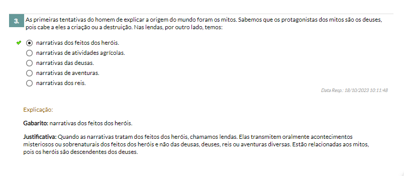 As primeiras tentativas do homem de explicar a origem do mundo foram os mitos. Sabemos que os protagonistas dos mitos são os deuses, pois cabe a eles a criação ou a destruição. Nas lendas por outro temos: narrativas dos feitos dos narrativas de atividades agrícolas. narrativas das narrativas de narrativas dos Data 18/10/2023 10:11:48 Explicação: Gabarito: narrativas dos feitos dos Justificativa: Quando as narrativas tratam dos feitos dos chamamos Elas transmitem oralmente acontecimentos misteriosos ou sobrenaturais dos feitos dos e não das deusas, reis ou aventuras Estão relacionadas aos pois os heróis são descendentes dos deuses.