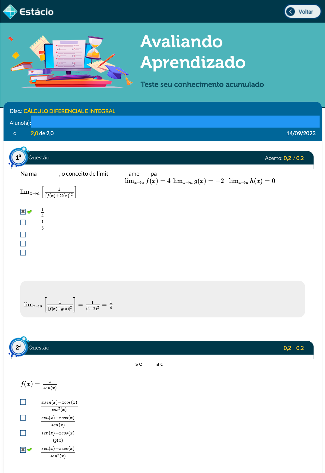 14/09/2023, 11:09 Estácio: Alunos https://simulado.estacio.br/alunos/ 1/8 Avaliando Aprendizado Teste seu conhecimento acumulado Disc.: CÁLCULO DIFERENCIAL E INTEGRAL Aluno(a): WELLINGTON CARVALHO DA SILVA 202303097395 Acertos: 2,0 de 2,0 14/09/2023 Acerto: 0,2 / 0,2 Na matemática, o conceito de limite é fundamental para o estudo do comportamento de funçöes em determinados pontos e em intervalos. Se ; e , o valor de é: . . 4. 0. 5. Respondido em 14/09/2023 10:43:10 Explicação: Acerto: 0,2 / 0,2 Sempre que houver o quociente entre funções em uma derivada, deve-se aplicar a regra do quociente. Calcule a derivada abaixo: limx→a f(x) = 4 limx→a g(x) = −2 limx→a h(x) = 0 limx→a [ ]1[f(x)+G(x)]2 1 4 1 5 limx→a [ ] = =1 [f(x)+g(x)]2 1 (4−2)2 1 4 f(x) = x sen(x) xsen(x)−xcos(x) cos2(x) sen(x)−xcos(x) sen(x) sen(x)−xcos(x) tg(x) sen(x)−xcos(x) sen2(x) Questão1 a Questão2 a https://simulado.estacio.br/alunos/inicio.asp javascript:voltar(); 14/09/2023, 11:09 Estácio: Alunos https://simulado.estacio.br/alunos/ 2/8 Respondido em 14/09/2023 11:07:50 Explicação: Pela regra do quociente: u = x v = sen(x) Acerto: 0,2 / 0,2 A capacitância equivalente de um circuito (C0) é calculada através da fórmula , com todas as capacitâncias medidas em . As capacitâncias C1 e C2 tem seus valores aumentados a uma taxa de 0,1 . A variância C3 decresce com uma taxa de ¿ 0,1 . Determine a variação da capacitância equivalente com o tempo em segundo para um instante que C1= C2 = 10 e C3 = 15 . Respondido em 14/09/2023 10:47:46 Explicação: A resposta correta é: Acerto: 0,2 / 0,2 Constantemente mais de uma técnica é empregada na resoluçäo de integrais. Dessa forma, determine o valor da equação . π. π / 3. 0. 2π. 3π / 2. Respondido em 14/09/2023 10:49:24 Explicação: xsen(x)−xcos(x) cos(x) f ′(x) = =u ′v−uv′ v2 sen(x)−xcos(x) sen2(x) C0 = C1 + C2C3 C2+C3 μF μF/s μF/s μF μF 0, 12μF/s 0, 10μF/s 0, 15μF/s 0, 11μF/s 0, 13μF/s 0, 12μF/s ∫ π/3 0 3 + cos(3x)dx ∫ π/3 0 3 + cos(3x)dx = ∫ π/3 0 3dx + ∫ π/3 0 cos(3x)dx Questão3 a Questão4 a 14/09/2023, 11:09 Estácio: Alunos https://simulado.estacio.br/alunos/ 3/8 Fica mais fácil resolver trabalhando com as derivadas de seno e cosseno ao invés de integrar diretamente: Derivando , temos: Logo E a integral Agora, juntando tudo temos: Acerto: 0,2 / 0,2 Determine o volume do sólido gerado pela rotação, em torno do eixo y, do conjunto de pontos formados pela função g(x) = 2x6 e o eixo x, para . Respondido em 14/09/2023 10:51:17 Explicação: A resposta correta é: Acerto: 0,2 / 0,2 Os limites săo utilizados para determinar valores que as funçöes se aproximam à medida que se aproxima de um determinado ponto, e podem ser utilizados em diversas áreas, como na �sica, na engenharia, na economia, entre outras. O valor do limite è: . . sen(3x)/3 sen(3x)/3 = cos(3x) ∫ cos(3x)dx = sen(3x)/3 d dx ∫ 3dx = 3x ∫ π/3 0 3 + cos(3x)dx = ∫ π/3 0 3dx + ∫ π/3 0 cos(3x)dx ∫ π/3 0 3 + cos(3x)dx = 3x + sen(3x)/3| x= x=0 = π + sen(π)/3 − sen(0)/3 = π π 2 ∫ π/3 0 3 + cos(3x)dx = π 0 ≤ x ≤ 2 76π 32π 128π 16π 64π 128π limx→4 [ ]x−4 x−√x̄−2 1 2 2 5 Questão5 a Questão6 a 14/09/2023, 11:09 Estácio: Alunos https://simulado.estacio.br/alunos/ 4/8 . . . Respondido em 14/09/2023 10:52:56 Explicação: Acerto: 0,2 / 0,2 Determinar o valor de m + 4p , reais, para que a função h(x) seja derivável em todos os pontos do seu domínio. 3 1 2 0 4 Respondido em 14/09/2023 10:53:41 Explicação: A resposta correta é: 2 Acerto: 0,2 / 0,2 Ao se analisar uma função por meio de suas derivas pode-se deduzir muitas informações acerca do comportamento desta função. A respeito de uma função analise as asserções a seguir: I. A derivada da função é da por , sendo eu se , a função é dita como crescente dentro de seu intervalo. PORQUE II. A concavidade da função será volta para cima se sua segunda deriva respeitar a condição: . Analisando as asserções realizadas acima, assinale a opção que representa a correta razão entre elas. 3 4 1 5 4 3 lim x→4 [ ] = ⋅ = = lim x→4 [ ] = = = = x − 4 x − √x − 2 x − 4 x − √x − 2 (x − 2) + √x (x − 2) + √x (x − 4)[(x − 2) + √x] x2 − 2x − 2x + 4 − x (x − 4)[(x − 2) + √x] x2 − 5x + 4 x − 4 x − √x − 2 (x − 4)[(x − 2) + √x] (x − 4)(x − 1) [(x − 2) + √x] (x − 1) [(4 − 2) + √4] (4 − 1) 4 3 y = f(x) y = f(x) y = f(x) dy dx < 0 dy dx y = f(x) y = f(x) > 0 d2y dx2 Questão7 a Questão8 a 14/09/2023, 11:09 Estácio: Alunos https://simulado.estacio.br/alunos/ 5/8 A asserção I está incorreta e a asserção II está correta. A asserção I está correta e a asserção II está incorreta. A asserção I está correta e a asserção II está correta, mas não é uma justi�cativa da asserção I. A asserção I está correta e a asserção II é uma justi�cativa da asserção I. Ambas as asserções estão incorretas. Respondido em 14/09/2023 10:55:08 Explicação: I - Incorreta: A função é crescente se sua derivada for maior que zero: II - Correta: A concavidade é positiva, isto é, voltada para cima atender a condição . Acerto: 0,2 / 0,2 A escolha da técnica de integração irá depender da complexidade da integral. Tendo isso em mente, calcule a integral inde�nida . . . . . . Respondido em 14/09/2023 10:59:02 Explicação: Resolvendo por integral por fraçenes parciais: Resolvendo o sistema resultante: y = f(x) > 0 dy dx > 0 d2y dx2 ∫ dx3e 2x2ex (ex−2)(e2x+4) ln(ex − 4) − + ln(e2x+4) 4 arct g( )e x 2 4 ln(ex − 2) − + ln(ex+1) 2 arctg( )e x x 2 ln(ex − 2) − + ln(e2x+4) 2 arct g( )e x 2 2 ln(ex − 3) − + ln(e2x+4) 3 arctg( )e x 2 3 ln(e2x − 2) − + ln(e2x+4) 2 arctg( )e x 2 2 ∫ dx ∫ = ex + du = exdx ∫ dx = ∫ exdx = ∫ du 3e2x2ex (ex − 2) (e2x + 4) 3e2x2ex (ex − 2) (e2x + 4) 3ex + 2 (ex − 2) (e2x + 4) 3u + 2 