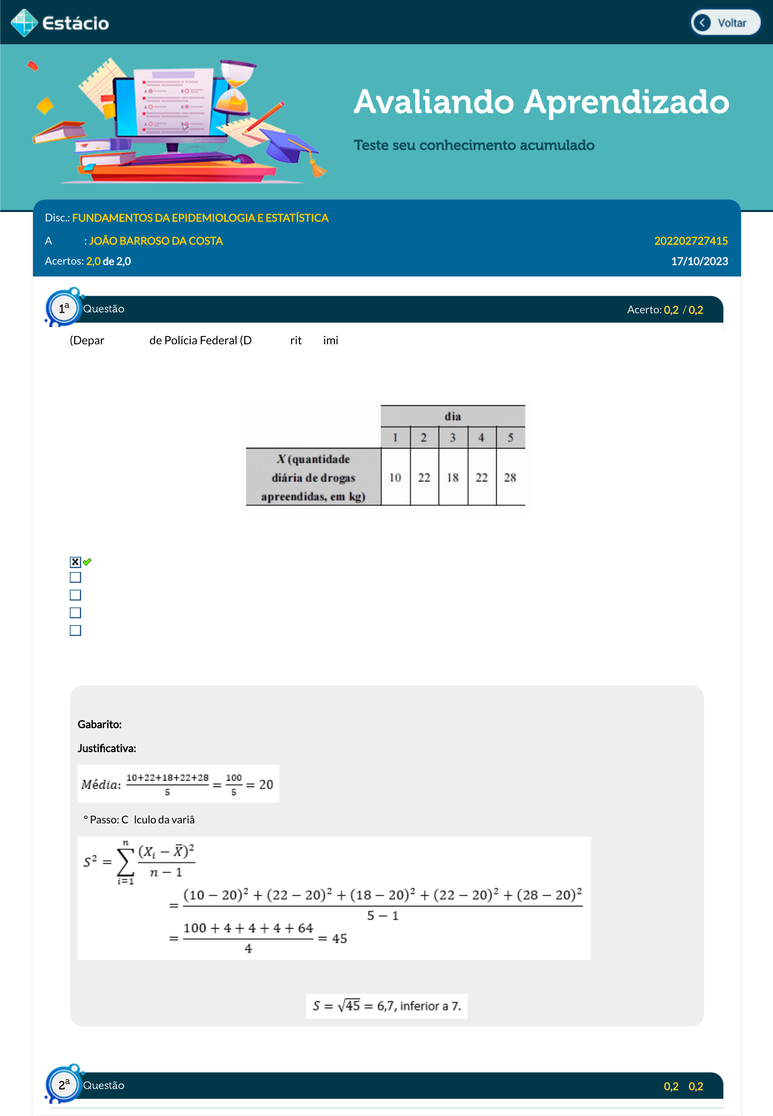 18/10/2023, 11:47 Estácio: Alunos https://simulado.estacio.br/alunos/ 1/5 Avaliando Aprendizado Teste seu conhecimento acumulado Disc.: FUNDAMENTOS DA EPIDEMIOLOGIA E ESTATÍSTICA Aluno(a): JOÃO BARROSO DA COSTA 202202727415 Acertos: 2,0 de 2,0 17/10/2023 Acerto: 0,2 / 0,2 (Departamento de Polícia Federal (DPF) - Perito Criminal / 2018 - adaptada) Tendo em vista que, diariamente, a Polícia Federal apreende uma quantidade X, em kg, de drogas em determinado aeroporto do Brasil, e considerando os dados hipotéticos da tabela a seguir, que apresenta os valores observados da variável X em uma amostra aleatória de 5 dias de apreensões no citado aeroporto. Nessa amostra, podemos dizer que o desvio padrão é inferior a: 7 4 3 6 5 Respondido em 17/10/2023 21:10:46 Explicação: Gabarito: 7 Justi�cativa: 1º Passo: Calcular a média: 2º Passo: Cálculo da variância para amostra, conforme ilustrado no enunciado da questão: Cálculo do desvio padrão: Acerto: 0,2 / 0,2 Questão1 a Questão2 a https://simulado.estacio.br/alunos/inicio.asp https://simulado.estacio.br/alunos/inicio.asp javascript:voltar(); javascript:voltar(); 18/10/2023, 11:47 Estácio: Alunos https://simulado.estacio.br/alunos/ 2/5 O IDH (Índice de Desenvolvimento Humano) foi criado pelo Programa das Nações Unidas para o Desenvolvimento (PNUD), para medir a qualidade de vida e desenvolvimento social e econômico dos países, sendo representado por um valor de 0 a 1. Para compor o IDH, alguns indicadores são calculados. A seguir estão listados alguns dos indicadores calculados. Assinale a alternativa que traz um indicador que NÃO compõem o IDH: o coe�ciente de adultos alfabetizados, ou seja, o percentual de indivíduos com idade superior a 15 anos capazes de ler e escrever em relação ao número de habitantes na mesma faixa etária. a expectativa de vida ao nascer, pois ter uma vida longa e saudável re�ete a qualidade do acesso aos serviços de saúde e a qualidade dos próprios serviços de saúde. o número de domicílios com fornecimento de agua em quantidade e qualidade satisfatórias, pois re�ete a situação de saúde e renda da população. a paridade do poder de compra, que compara o quanto a moeda de determinado país pode comprar em termos internacionais, ou seja, comparada com o dólar estadunidense. o coe�ciente bruto de frequência à escola, ou seja, o percentual de indivíduos que frequentam os cursos do ensino fundamental, médio e superior relacionado com o número de habitantes com idade entre 7 e 22 anos da localidade. Respondido em 18/10/2023 10:40:28 Explicação: Para compor o IDH os indicadores calculados são esperança de vida ao nascer, coe�ciente de adultos alfabetizados, coe�ciente bruto de frequência à escola, paridade do poder de compra e produto interno bruto per capta. O número de domicílios com água disponível de qualidade não é avaliando, assim não compõem o IDH. Acerto: 0,2 / 0,2 De maneira geral, a incidência de acidentes ofídicos aumenta nos meses correspondentes ao verão (dezembro - fevereiro) em comparação com os meses mais frios. Associa-se esse aumento, por exemplo, à maior atividade humana nos trabalhos de campo durante os períodos mais quentes, facilitando dessa forma o contato acidental entre o indivíduo e as serpentes. Marque a alternativa que apresenta o tipo de variação temporal nos agravos de saúde. Variação cíclica. Variação irregular. Variação sazonal. Variação reprodutiva. Tendência secular ou histórica. Respondido em 18/10/2023 10:41:54 Explicação: Gabarito: Variação sazonal. Justi�cativa: A sentença acima corresponde a um exemplo da in�uência sazonal em agravos de saúde. A variação sazonal é aquela em que a variação da incidência de uma doença coincide com as estações do ano e depende de um conjunto de fatores, como a radiação solar, temperatura, umidade atmosférica, chuvas etc. A tendência secular ou histórica refere-se à análise das mudanças na frequência de uma doença (incidência, mortalidade etc.) por um longo período de tempo, geralmente décadas. Variação irregular é no qual o número de casos não varia, A Variação reprodutiva está relacionado com a capacidade de reprodução da mulher, assunto não relacionado ao enunciado e a epidemiologia. Acerto: 0,2 / 0,2 Atualmente é amplamente debatido como a alimentação contribui para uma vida mais saudável. Nesse contexto destaca-se a epidemiologia nutricional é um ramo da epidemiologia que: Se mostrou com a menor in�uência na saúde da população já que a alimentação não é um fator a ser considerado. Não utiliza nenhuma ferramenta da epidemiologia por ser um ramo mais ligado a alimentação. Já chegou no seu patamar desejável de conscientização, conseguindo mostrar importância da dieta balanceada. Analisa a in�uência do tipo de alimentação no estado nutricional e na saúde da população. Não se preocupa com a qualidade do alimento desde que tenha uma baixa ingesta calórica. Respondido em 18/10/2023 10:42:42 Explicação: A epidemiologia nutricional é um importante ramo da epidemiologia que investiga o papel da alimentação na saúde da população. Além disso, vem se preocupando com questões relacionadas com a segurança dos alimentos (qualidade microbiológica, química e física), a Questão3 a Questão4 a 18/10/2023, 11:47 Estácio: Alunos https://simulado.estacio.br/alunos/ 3/5 qualidade da ingestão alimentar da população e o status nutricional. De forma muito importante, estudos vem mostrando cada vez mais a relação entre algumas doenças e a má nutrição/desnutrição. Ainda há muito o que se aprender dentro desse ramo e ainda há grande necessidade de conscientizar da importância de uma alimentação saudável e balanceada. Acerto: 0,2 / 0,2 A vigilância epidemiológica pode ser ativa ou passiva. A combinação da vigilância passiva com a busca ativa de casos pode ser utilizada em 