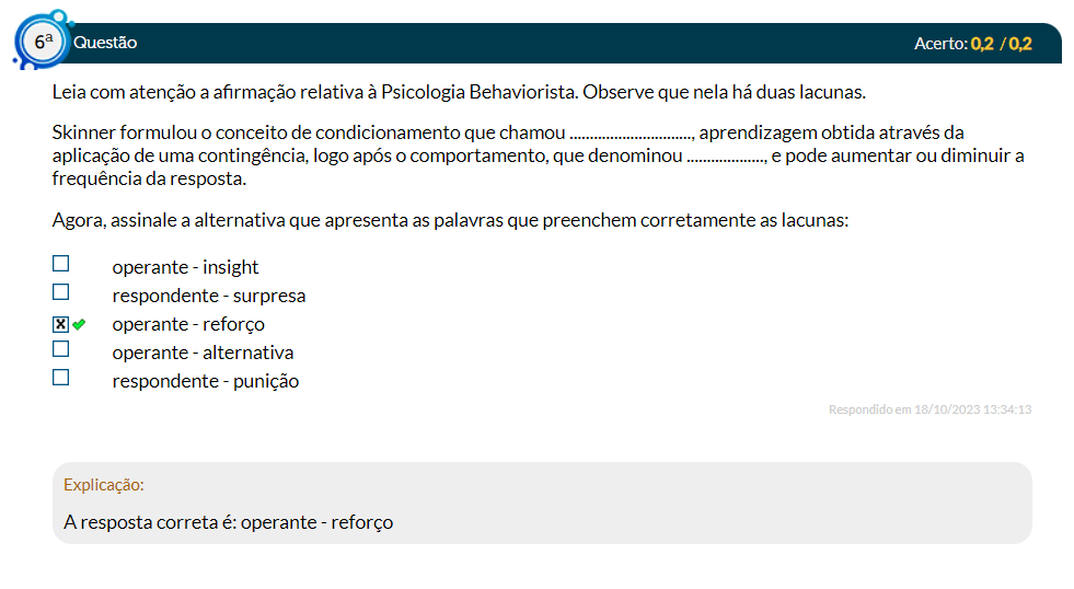Leia com atenção a afirmação relativa à Psicologia Behaviorista. Observe que nela há duas lacunas. Skinner formulou conceito de condicionamento que chamou aprendizagem obtida através da aplicação de uma contingência, logo após comportamento, que denominou e pode aumentar ou diminuir a frequência da resposta. Agora, assinale a alternativa que apresenta as palavras que preenchem corretamente as lacunas: operante - insight respondente - surpresa operante - reforço operante - alternativa respondente - punição