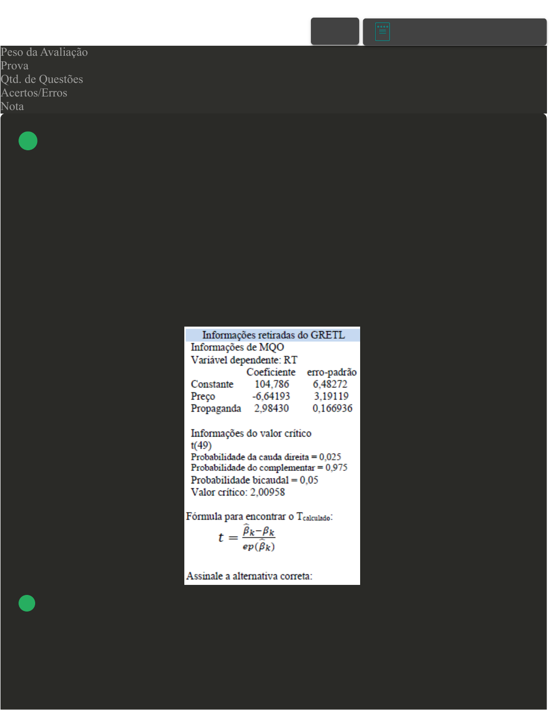 Prova Impressa GABARITO | Avaliação II - Individual (Cod.:884443) Peso da Avaliação 1,50 Prova 70526265 Qtd. de Questões 10 Acertos/Erros 6/4 Nota 6,00 Entre os testes estatísticos que permitem ao economista dar argumentação estatística sobre a robustez de seus modelos econométricos, encontra-se o teste de hipóteses, com base nas informações extraídas do GRETL para uma estimação da Receita Total (RT) de uma lanchonete explicada pela variação nos gastos com propaganda e política de preços. Com base em 52 observações e nível de significância de 5%, são feitas afirmativas a respeito de testes de significância em que se testa a hipótese nula igual a zero contra a hipótese alternativa diferente de zero para a variável explanatória "propaganda". Sobre o exposto, analise as afirmativas a seguir: I- Pode-se afirmar que se procura testar se variações na receita total estão relacionadas a variações nos gastos com propaganda. II- O t-calculado é igual a 17,88. III- Comparando o t-calculado contra o t-tabela, conclui-se que os dados apoiam a conjectura de que a receita total está relacionada aos gastos em propaganda. Assinale a alternativa CORRETA: A As afirmativas I, II e III estão corretas. B Somente a afirmativa III está correta. C Somente a afirmativa I está correta. D Somente a afirmativa II está correta. VOLTAR A+ Alterar modo de visualização 1 Suponha que uma empresa necessite de insumos de diversas regiões do país, além de matérias- primas importadas. Sob esta situação você precisa formular um modelo que explique o comportamento do preço de frete ao longo do tempo. Sobre o modelo de regressão múltiplo, assinale a alternativa CORRETA: A Os erros têm distribuição qui-quadrada. B Os erros são correlacionados. C A média condicional do termo erro é sigma ao quadrado. D O modelo é linear nos parâmetros. A análise de regressão, por meio de uma variedade de testes estatísticos, procura confirmar se os resultados obtidos na estimação dos parâmetros são confiáveis. Dentre os vários testes estatísticos possíveis, têm-se o coeficiente de determinação e o coeficiente de determinação ajustado. Sobre esses dois testes, analise as afirmativas a seguir: I- O coeficiente de determinação ajustado é um teste que mostra o poder que as variáveis explicativas têm de explicar a variável explicada, ou seja, indica o poder de explicação do modelo. II- O coeficiente de determinação é um teste utilizado para comparar o poder de explicação entre dois modelos de regressão. III- O coeficiente de determinação ajustado é "ajustado" pelo número de graus de liberdade. Assinale a alternativa CORRETA: A As afirmativas II e III estão corretas. B As afirmativas I e II são corretas. C Somente a afirmativa III está correta. D Somente a afirmativa I está correta. Uma importante medida dentre as informações estatísticas que uma regressão fornece se encontra o coeficiente de determinação. Sobre o coeficiente de determinação no modelo de regressão múltipla, com o auxílio da figura anexa para uma estimação da receita total de uma lanchonete, explicada pela variação nos gastos com propaganda e política de preços, com base em 52 observações e nível de significância de 5%, analise as sentenças a seguir: 2 3 4 I- Enquanto no modelo de regressão linear simples o coeficiente de determinação mede o quanto variações na variável dependente é explicada pela única variável explicativa do modelo, na regressão múltipla o coeficiente de determinação trata do quanto variações na variável dependente são explicadas pelo conjunto de variáveis explicativas do modelo. II- O coeficiente de determinação da regressão na figura diz que 86,7% da variação na receita total é explicada pela variação nos preços e nos gastos com propaganda. III- O coeficiente de determinação da regressão na figura é dado por “rô”, e nos diz que 4,7% da variação na receita total é explicada pela variação nos preços e nos gastos com propaganda. Assinale a alternativa CORRETA: A As sentenças I e II são corretas. B As sentenças II e III estão corretas. C Somente a sentença III está correta. D Somente a sentença I está correta. O modelo log-linear lnY = alfa + betaX significa que uma variação absoluta em X altera a variável dependente em beta percentual (beta x 100). Suponha a estimação log-linear do salário por hora de um determinado setor da economia, com base nas variáveis explicativas educ (anos de educação formal), exper (anos de experiência no mercado de trabalho) e perm (anos com o empregador atual). Suponha que ao estimar você tenha obtido a seguinte regressão Ln(salário/h) = 0,284 + 0,092educ + 0,0041exper + 0,022perm. Com base na regressão estimada, classifique V para as sentenças verdadeiras e F para as falsas: ( ) O coeficiente 0,092 significa que, tudo mais constante, um ano a mais de educação formal aumenta o valor esperado do salário hora em 9,2%. ( ) Se o indivíduo permanecer na mesma empresa por mais um ano, supondo que não houve alteração no seu nível de educação, seu salário hora deve subir 2,61% no início do próximo ano. ( ) Não é possível em uma análise de modelo múltiplo haver um ganho salarial em decorrência de duas ou mais variáveis explicativas ao mesmo tempo. Assinale a alternativa que apresenta a sequência CORRETA: A F - F - V. B V - V - F. C F - V - F. D V - F - F. A estimação dos parâmetros se dá pela análise de regressão. A análise da regressão procura, por meio de uma variedade de testes estatísticos, confirmar se os resultados obtidos na estimação dos parâmetros são confiáveis. Sobre a aplicação destes testes estatísticos, assinale a alternativa CORRETA: A O "teste F" é uma forma de verificar se cada coeficiente é individualmente significante do ponto de vista estatístico. B O "teste t" é uma forma de verificar em conjunto se os coe