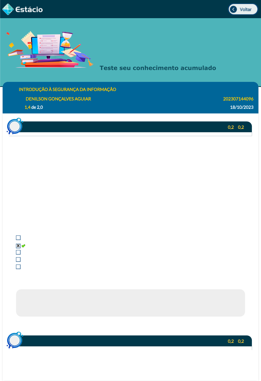 19/10/2023, 10:52 Estácio: Alunos file:///C:/Users/PC/Desktop/introdução a Segurança da informação AVA1_files/login.html 1/6 Avaliando Aprendizado Teste seu conhecimento acumulado Disc.: INTRODUÇÃO À SEGURANÇA DA INFORMAÇÃO Aluno(a): DENILSON GONÇALVES AGUIAR 202307144096 Acertos: 1,4 de 2,0 18/10/2023 Acerto: 0,2 / 0,2 Em relação à segurança da informação e aos controles de acesso físico e lógico, considere: I. Se um usuário não mais faz parte a lista de um grupo de acesso aos recursos de processamento da informação, é certo que o grupo seja extinto com a criação de um novo, contendo os usuários remanescentes. II. Direitos de acesso (físicos e lógicos) que não foram aprovados para um novo trabalho devem ser retirados ou adaptados, incluindo chaves e qualquer tipo de identi�cação que associe a pessoa ao novo projeto. III. O acesso às áreas em que são processadas ou armazenadas informações sensíveis deve ser controlado e restrito às pessoas autorizadas, preferencialmente por controles de autenticação, por exemplo, cartão de controle de acesso mais PIN (personal identi�cation number). Está correto o que se a�rma em I e III, apenas. II e III, apenas. III, apenas. I, II e III. I e II, apenas. Respondido em 18/10/2023 17:16:27 Explicação: Do ponto de vista de gerenciamento, não faz sentido excluir todos os usuários (o grupo) apenas para revogar o acesso de um único usuário que não tenha mais permissão. Acerto: 0,2 / 0,2 É um tipo de malware feito para extorquir dinheiro de sua vítima. Esse tipo de ciberataque irá criptografar os arquivos do usuário e exigir um pagamento para que seja enviada a solução de descriptogra�a dos dados da vítima. O scareware é seu tipo mais comum e usa táticas ameaçadoras ou intimidadoras para induzir as vítimas a pagar. Questão1a Questão2a https://simulado.estacio.br/alunos/inicio.asp https://simulado.estacio.br/alunos/inicio.asp javascript:voltar(); javascript:voltar(); https://simulado.estacio.br/bdq_simulados_ava1_ava2_ead_resultado.asp?cod_hist_prova=319466621&cod_prova=6740251254&f_cod_disc=# 19/10/2023, 10:52 Estácio: Alunos file:///C:/Users/PC/Desktop/introdução a Segurança da informação AVA1_files/login.html 2/6 O texto se refere ao: Botnet Spyware Ransomware DDoS Spam Respondido em 18/10/2023 17:05:56 Explicação: A resposta correta é: Ransomware Acerto: 0,0 / 0,2 Assinale a assertiva que NÃO representa um dos benefícios para a adoção da norma ABNT NBR ISO/IEC 27001:2013 por uma organização: Mecanismo para minimizar o fracasso do sistema Oportunidade de identi�car e eliminar fraquezas Participação da gerência na Segurança da Informação Isola recursos com outros sistemas de gerenciamento Fornece segurança a todas as partes interessadas Respondido em 18/10/2023 17:17:04 Explicação: A resposta correta é: Isola recursos com outros sistemas de gerenciamento. Acerto: 0,0 / 0,2 (CESGRANRIO/2012) O uso de criptogra�a simétrica no compartilhamento de informações secretas requer o compartilhamento de chave simétrica. Uma forma segura para um emissor enviar uma chave simétrica por meios de comunicação inseguros para um receptor é criptografar essa chave com a chave: privada do emissor. privada do receptor. pública do emissor. pública do emissor e a chave privada do receptor. pública do receptor. Respondido em 18/10/2023 17:24:12 Explicação: Para enviar uma chave simétrica por meios de comunicação inseguros, é necessário criptografá-la. Nesse caso, a criptogra�a deve ser realizada utilizando a chave pública do receptor. Questão3a Questão4a 19/10/2023, 10:52 Estácio: Alunos file:///C:/Users/PC/Desktop/introdução a Segurança da informação AVA1_files/login.html 3/6 Acerto: 0,2 / 0,2 Questão5 a 19/10/2023, 10:52 Estácio: Alunos file:///C:/Users/PC/Desktop/introdução a Segurança da informação AVA1_files/login.html 4/6 O sistema de monitoramento de nobreak detectou uma variação na tensão elétrica na entrada dos aparelhos, mas essa variação não foi o su�ciente para causar danos aos equipamentos de computação a eles conectados. Conforme os termos relacionados à segurança da informação, o que ocorreu pode ser classi�cado como: Eletricidade Evento Variação Tensionamento Dano Respondido em 18/10/2023 17:15:03 Explicação: A resposta correta é: Evento Acerto: 0,0 / 0,2 O Risco é um conceito importante quando se trata do Plano de Continuidade de Negócios (PCN). A respeito do Risco, selecione a opção correta: Não pode ser analisado em termos probabilísticos, uma vez que sempre está presente. Possível evento que pode causar perdas ou danos, ou di�cultar o atingimento de objetivos. Evento súbito e imprevisto que provoca grandes perdas ou danos a uma organização. Normalmente não podem ser controlados. É um conceito abstrato e com baixa chance de se transformar em um desastre. Respondido em 18/10/2023 17:20:32 Explicação: A resposta correta é: Possível evento que pode causar perdas ou danos, ou di�cultar o atingimento de objetivos. Acerto: 0,2 / 0,2 O crescimento das redes abertas fez com que surgissem vários problemas de segurança, que vão desde o roubo de senhas e interrupção de serviços até problemas de personi�cação, em que uma pessoa faz-se passar por outra para obter acesso privilegiado. Com isso, surgiu a necessidade de veri�cação da identidade tanto dos usuários quanto dos sistemas e processos. Dentro desse contexto, esse ato de veri�cação é chamado: con�abilidade. cadastro. autenticação. con�guração. acessibilidade. Respondido em 18/10/2023 17:10:09 Questão6a Questão7a 19/10/2023, 10:52 Estácio: Alunos file:///C:/Users/PC/Desktop/introdução a Segurança da informação AVA1_files/login.html 5/6 Explicação: A resposta correta é: Autenticação. Acerto: 0,2 / 0,2 Ativos são recursos econômicos controlados por uma organização que possuem valor e podem gerar bene