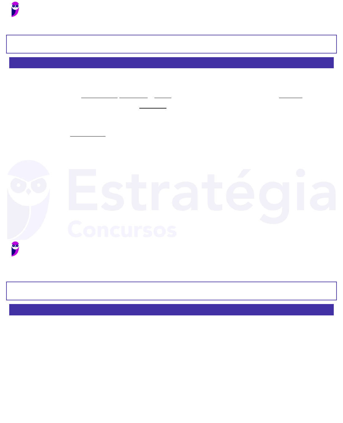 QUESTÃO 49 – 39% DE ACERTOS Órgão: Tribunal de Justiça do Ceará | Cargo: Técnico Judiciário - Área Judiciária (TJ CE) | Ano: 2019 ENUNCIADO DA QUESTÃO “O fim das penas não é atormentar, perseguir e afligir um ser sensível... Seu fim é apenas impedir que o réu cause novos danos aos seus concidadãos e dissuadir os outros de fazerem o mesmo”. Se quiséssemos nominalizar todas as ações sublinhadas, deveríamos trocar os verbos por substantivos; nesse caso, a substituição inadequada seria: A. atormentar um ser sensível / atormentação de um ser sensível; B. perseguir um ser sensível / perseguição de um ser sensível; C. afligir um ser sensível / aflição de um ser sensível; D. impedir que o réu cause novos danos / impedimento de o réu causar novos danos; E. dissuadir os outros / dissuasão dos outros. QUESTÃO 50 – 40% DE ACERTOS Órgão: Tribunal de Justiça de Santa Catarina | Cargo: Técnico Judiciário Auxiliar (TJ SC) | Ano: 2018 ENUNCIADO DA QUESTÃO Texto 2 – Os Estatutos do Homem (segmento) Artigo VIII Fica decretado que a maior dor sempre foi e será sempre não poder dar-se amor a quem se ama Clique na coruja para resolver essa questão diretamente em nosso Sistema de Questões. Clique na coruja para resolver essa questão diretamente em nosso Sistema de Questões. https://concursos.estrategiaeducacional.com.br/questoes/62128834 https://concursos.estrategiaeducacional.com.br/questoes/271348833 Ebook-100-questoes-mais-dificeis-da-FGV-Portugues.pdf EBOOK-100-MAIS-DIFICEIS-PORTUGUES-FGV.pdf ENUNCIADOS DAS QUESTÕES QUESTÃO 49 – 39% DE ACERTOS Órgão: Tribunal de Justiça do Ceará | Cargo: Técnico Judiciário - Área Judiciária (TJ CE) | Ano: 2019 QUESTÃO 50 – 40% DE ACERTOS Órgão: Tribunal de Justiça de Santa Catarina | Cargo: Técnico Judiciário Auxiliar (TJ SC) | Ano: 2018