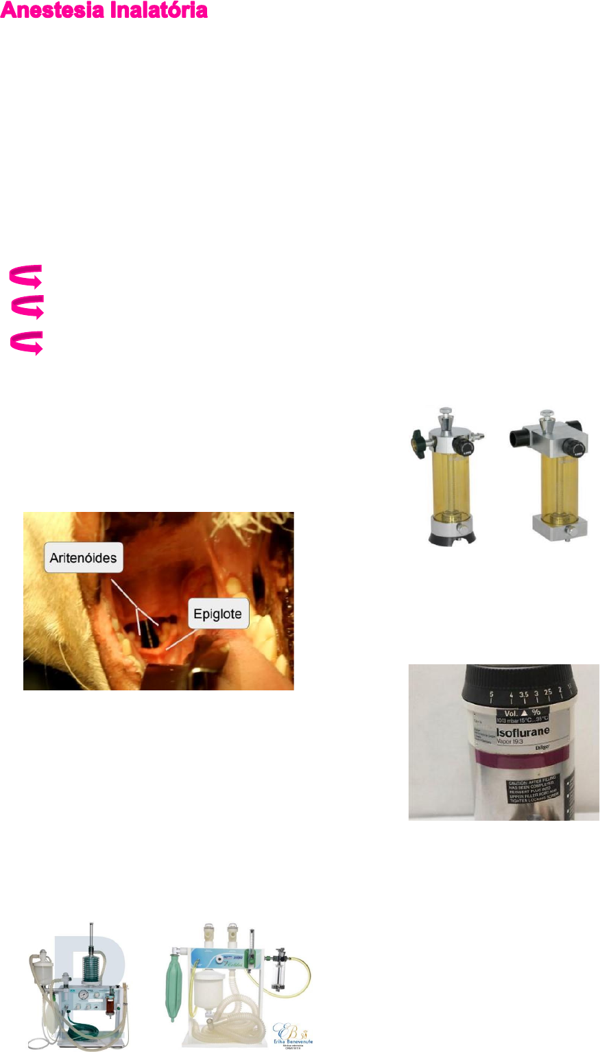 o Mais usada hoje, mais segura o Permite controle do plano anestésico o Gás é absorvido e excretado pelo pulmão o Usado para manutenção anestésica o Paciente precisa estar entubado!!! o CAM: concentração alveolar mínima (dose) Isoflurano Sevoflurano Desflurano o Para acesso de vias aéreas: - Laringoscópio - Traqueotubos com ou sem balonete (cuff): de acordo com tamanho do paciente, vai de 2 a 9 o Cuidar para não entubar esôfago!!! E sim traqueia o Entubação de felinos é mais difícil, pois possuem mais reflexos em aritenóides e glote, por isso pode usar lidocaína local (gel/líquido) Aparelho de anestesia portátil - Válvula redutora de pressão: reduz pressão do cilindro ou compressor à uma pressão adequada ao aparelho ou circuito - Chicote ou mangueira: conduz gás medicinal de sua fonte ao aparelho de anestesia em baixa pressão - Fluxômetro ou rotâmetro: define o volume de gás que irá ser percorrido pelo circuito anestésico, é individual Até 5kg: 2L de O2 De 5kg a 15kg: 4L de O2 + de 15kg: + de 5L de O2 - Vaporizadores: facilitam a mudando do anestésico de líquido para gasoso, utilizado para qualquer agente volátil, menos desflurano: universal - Vaporizador calibrado: agente específico, possui compensação de fluxo, temperatura e pressão - Cal Sodada: filtra CO2 pra não deixar ir pra paciente, é armazenado no canister Roxa: precisa trocar Branca: boa - Circuitos: balão, usado para a ventilação, tem de 500ml a 5L - Circuitos – válvulas: direcionam o fluxo de ar - Válvula pop-off ou de alívio: alivia a pressão no sistema de escape de gases, ventila o paciente melhor - Traqueia corrugada: leva o anestésico ao paciente, traqueia infantil o Avalvulares não-reinalatórios (baraka) - Sistema fácil de trabalhar, sem válvulas unidirecionais e canister - Menor resistência mecânica, perda de calor e umidade - O2 não passa no canister, animal não vai respirar novamente o ar, ou seja, CO2 sai para fora - Usado em paciente com peso igual ou menor de 6kg - Desvantagem: poluição ambientar na sala muito grande o Valvulares reinalatórios - Mais complexo - Presença de válvulas unidirecionais, maior resistência mecânica - Com canister e cal sodada - O2 e CO2 fica tudo na máquina - Gás expirado é reaproveitado (total ou parcial) - Vantagem: menor gasto O2 e menos poluição na sala - Usado para pacientes com + de 6kg Sistemas - Aberto: É considerado aberto porque todo o fluxo inspirado desse paciente (que vem do vaporizador) ao ser expirado é eliminado pelo paciente no ambiente, é considerado avalvular e não ocorre absorção de CO2 - Semi-aberto: Também é considerado avalvular e sem absorção de CO2, além de ser representado pelo circuito de T. de ayres, baraka e bain - Fechado ou semi-fechado: Esta classificação depende do fechamento ou não da válvula de eliminação do gás, e isto vai depender da forma que irei trabalhar com aquele paciente. Este circuito é considerado valvular (válvula inspiratória e expiratória) e ocorre absorção de CO2, pois possui uma estrutura denominada canister (recipiente com a presença de cal sodada)