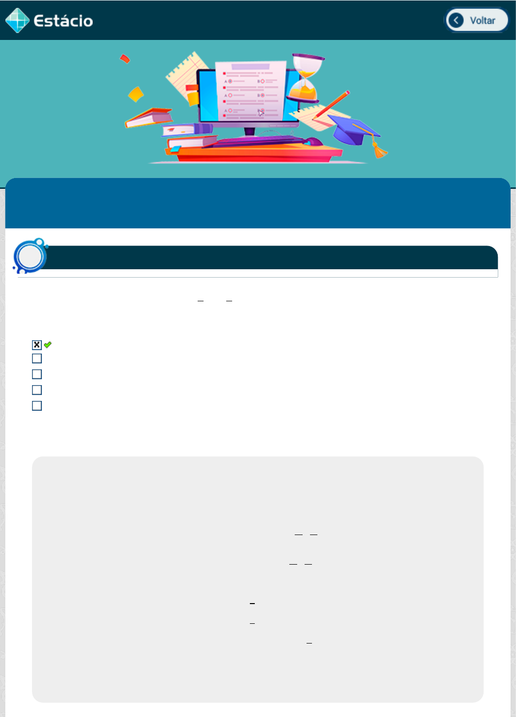 Disc.: MÉTODOS QUANTITATIVOSMÉTODOS QUANTITATIVOS Acertos: 1,41,4 de 2,0 de 2,0 19/10/202319/10/2023 Acerto: 0,20,2 / 0,20,2 Os planos podem apresentar diferentes posições relativas. Considerando os planos e , assinale o correto sobre a posiçäo relativa dos planos e . Paralelos distintos. Paralelos coincidentes. Transversais. Paralelos concorrentes. Paralelos reversos. Respondido em 19/10/2023 20:49:00 Explicação: Comparando os coeficientes: Como os très primeiros coeficientes säo proporcionais, os planos säo paralelos distintos. !1 : 2x ! y + z! 1 = 0 !2 : x ! y + z ! 9 = 0 1 2 1 2 !1 !2 !1 : (a1, b1, c1, d1) = (2, !1, 1, !1) !2 : (a2, b2, c2, d2) = (1, ! , , !9) (2, !1, 1, !1) = " (1, ! , , !9) !""""""#""""""$ 2 = 1 "# $ = 2 !1 = ! "# $ = 2 1 = "# $ = 2 !1 = !9 "# $ = 1 2 1 2 1 2 1 2 1 2 1 2 1 9 Questão11a 19/10/2023 20:10 Página 1 de 7 Acerto: 0,00,0 / 0,20,2 No contexto da economia, considera-se um mercado financeiro onde são realizadas operações de compra e venda de ativos. Nesse mercado, os valores dos ativos são representados por vetores e as operações de compra e venda são realizadas através da adição e multiplicação por um número real k. Com base nessa contextualização, assinale a alternativa correta que corresponde a uma propriedade mencionada no enunciado: A propriedade associativa na adição se aplica às transações financeiras, onde a ordem em que as operações de compra e venda são realizadas não afeta o resultado final. A propriedade existência do elemento neutro na adição está relacionada à existência de um ativo financeiro que, ao ser adicionado a qualquer outro ativo, não altera o valor total do investimento. A propriedade comutativa é válida para as oscilações dos valores dos ativos no mercado financeiro, onde a ordem das variações não altera a soma total. A propriedade distributiva por escalar é aplicável às transações financeiras, onde um investidor multiplica o valor de um ativo por um número real k para obter o valor correspondente às operações de compra e venda. A propriedade existência do elemento oposto na adição é observada quando um investidor compra e vende ações simultaneamente, compensando os ganhos e perdas e mantendo um saldo neutro. Respondido em 19/10/2023 20:51:31 Explicação: No enunciado, é mencionada a propriedade associativa na adição. No contexto da economia e do mercado financeiro, essa propriedade se aplica às transações de compra e venda de ativos, onde a ordem em que as operações são realizadas não afeta o resultado final. Por exemplo, se um investidor vende um ativo, compra outro e, em seguida, vende outro ativo, o resultado final será o mesmo, independentemente da ordem em que as transações ocorreram. Acerto: 0,20,2 / 0,20,2 Um grupo de estudantes está estudando matrizes em um curso de matemática aplicada. Durante uma aula, o professor explica a definição de matriz como um agrupamento ordenado de elementos em uma forma retangular com linhas e colunas. Ele também destaca a notação para representar os elementos individuais da matriz. Considerando a definição de matriz e sua notação, qual das seguintes alternativas corretamente descreve a representação de um elemento específico (aij) da matriz M? O elemento (aij) é a soma dos elementos das linhas i e j da matriz M. O elemento (aij) é igual à matriz M na posição (i+j). O elemento (aij) é o elemento da matriz M na posição i, j representado por (M)ij = aij. O elemento (aij) é o resultado da multiplicação entre a linha i e a coluna j da matriz M. O elemento (aij) é o resultado da divisão entre a linha i e a coluna j da matriz M. Respondido em 19/10/2023 20:52:57 Questão22a Questão33a 19/10/2023 20:10 Página 2 de 7 Explicação: De acordo com a definição apresentada, o elemento (aij) da matriz M é representado por (M)ij = aij. Isso significa que o elemento na posição i, j da matriz M é exatamente igual a aij. Acerto: 0,20,2 / 0,20,2 Dadas as equações lineares 3x + 4y = 8 e y = 2x - 1, utilize o método da substiuição para encontrar o valor de x e y. x = 12/11 e y = 13/11 x = 14 e y = 11 x = 12 e y = 13 x = 11/10 e y = 13/11 x = 14/10 e y = 11/12 Respondido em 19/10/2023 20:54:14 Explicação: Para utilizar o método da substiuição, devemos substituir uma das variáveis de uma equação pela expressão que a representa na outra equação. Primeiro, vamos substituir y na primeira equação: 3x + 4(2x - 1) = 8 3x + 8x - 4 = 8 11x - 4 = 8 11x = 12 x = 12/11 Agora, vamos substituir o valor encontrado para x na segunda equação: y = 2(12/11) - 1 y = 24/11 - 1 y = 13/11 Então, x = 12/11 e y = 13/11 Acerto: 0,20,2 / 0,20,2 (AGIRH/2022 - Adaptado) A representação gráfica de um sistema de 1º grau, cujo resultado é possível e indeterminado é dado por: Duas retas sobrepostas. Duas retas concorrentes. Duas retas paralelas. Duas retas ortogonais em R3. Questão44a Questão55a 19/10/2023 20:10 Página 3 de 7 Duas retas perpendiculares ortogonais. Respondido em 19/10/2023 20:55:21 Explicação: A resposta correta é: Duas retas sobrepostas A representação gráfica de um sistema de equações lineares de 1º grau com uma incógnita é dada por uma reta no plano cartesiano. Se o sistema tem uma única solução, a reta passa por um único ponto, que é a solução do sistema. Se o sistema não tem solução, as retas são paralelas e não se cruzam. Se o sistema tem infinitas soluções, as retas são coincidentes e se cruzam em todo o seu comprimento. Acerto: 0,00,0 / 0,20,2 No desenvolvimento de modelos de programação linear, existem classes de modelos que são considerados como "problemas típicos". Esses modelos são adaptáveis a diversas situações práticas e seguem padrões semelhantes, formando diferentes "classes" de problemas. Conhecer esses padrões e entender a lógica por trás da construção desses modelos matemáticos é crucial para a modelagem eficiente de problemas d