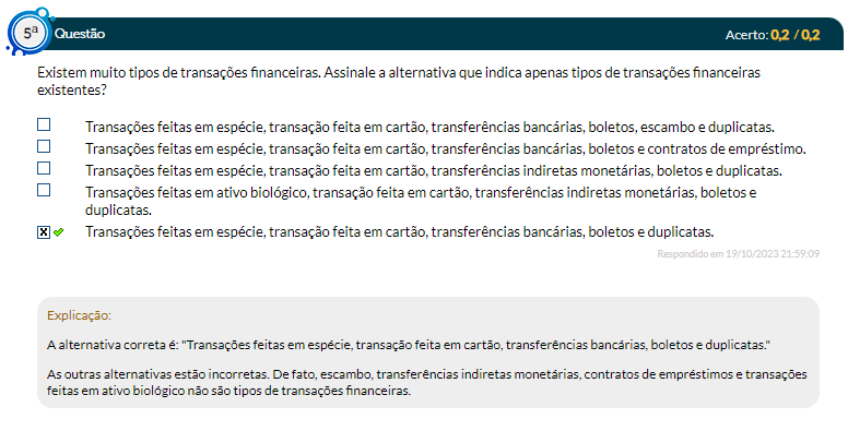 a) Transações feitas em espécie, transação feita em transferências escambo e duplicatas. b) Transações feitas em transação feita em transferências boletos e contratos de empréstimo. c) Transações feitas em transação feita em transferências indiretas boletos e duplicatas. d) Transações feitas em ativo biológico, transação feita em transferências indiretas monetárias, boletos e duplicatas. e) Transações feitas em transação feita em cartão, transferências boletos e duplicatas.