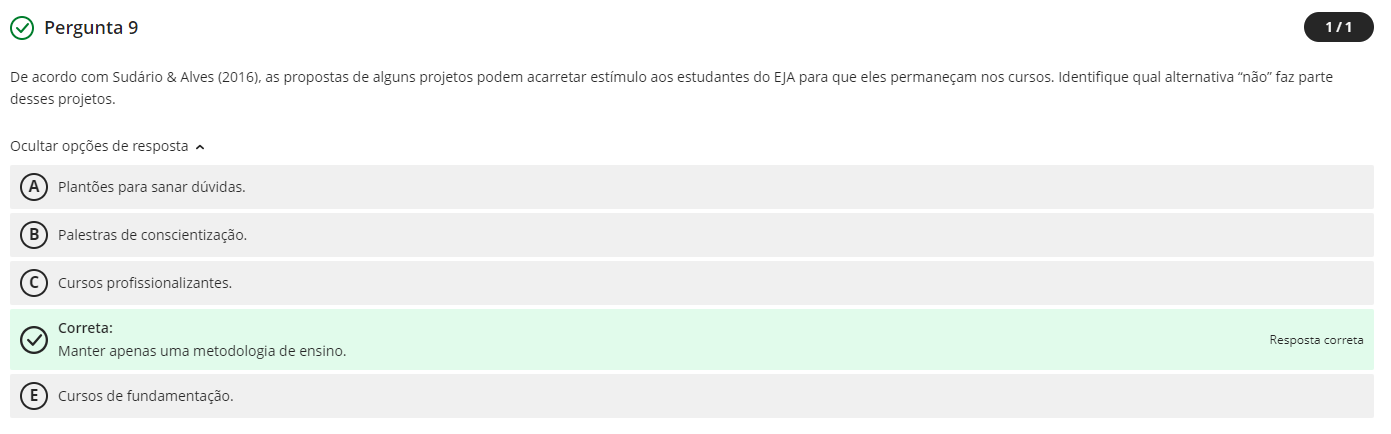De acordo com Sudário & Alves (2016), as propostas de alguns projetos podem acarretar estímulo aos estudantes do EJA para que eles permaneçam nos cursos. Identifique qual alternativa "não" faz parte desses projetos. A Plantões para sanar dúvidas. B Palestras de conscientização. C Cursos profissionalizantes. D Manter apenas uma metodologia de ensino. E Cursos de fundamentação.