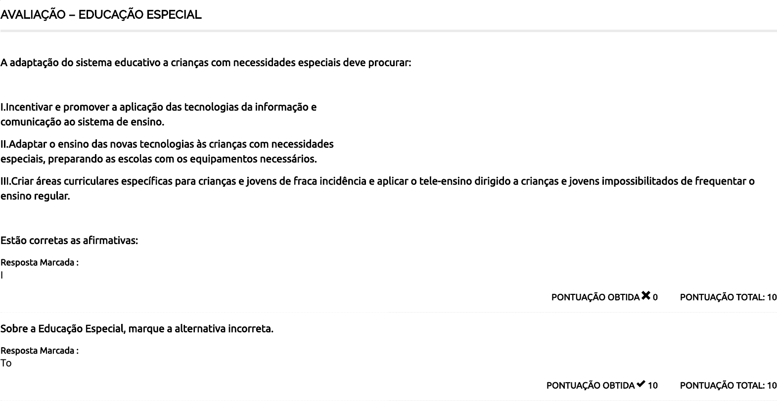 16/09/23, 11:25 Course Status – Faculdade Facuvale https://ava.faculdadefacuvale.universaeducacional.com.br/course-status/ 1/4 AVALIAÇÃO – EDUCAÇÃO ESPECIAL PONTUAÇÃO TOTAL: 10PONTUAÇÃO OBTIDA 0 A adaptação do sistema educativo a crianças com necessidades especiais deve procurar: I.Incentivar e promover a aplicação das tecnologias da informação e comunicação ao sistema de ensino. II.Adaptar o ensino das novas tecnologias às crianças com necessidades especiais, preparando as escolas com os equipamentos necessários. III.Criar áreas curriculares especí�cas para crianças e jovens de fraca incidência e aplicar o tele-ensino dirigido a crianças e jovens impossibilitados de frequentar o ensino regular. Estão corretas as a�rmativas: Resposta Marcada : II. PONTUAÇÃO TOTAL: 10PONTUAÇÃO OBTIDA 10 Sobre a Educação Especial, marque a alternativa incorreta. Resposta Marcada : Todas as escolas dedicam-se a todos os tipos de necessidades especiais. 16/09/23, 11:25 Course Status – Faculdade Facuvale https://ava.faculdadefacuvale.universaeducacional.com.br/course-status/ 2/4 PONTUAÇÃO TOTAL: 10PONTUAÇÃO OBTIDA 0 Marque a alternativa correta. O desenvolvimento histórico da educação especial no Brasil inicia-se no século: Resposta Marcada : 20. PONTUAÇÃO TOTAL: 10PONTUAÇÃO OBTIDA 10 Marque a alternativa correta que se refere ao trecho abaixo. Foi o primeiro tratado dos direitos humanos do Século XXI e é amplamente reconhecida como tendo uma participação da sociedade civil sem precedentes na história, particularmente de organizações de pessoas com de�ciência.” Resposta Marcada : Convenção da De�ciência. PONTUAÇÃO TOTAL: 10PONTUAÇÃO OBTIDA 0 Marque a alternativa correta. Em ______foi constituído pelo Ministério de Educação e Cultura – MEC o Grupo Tarefa de Educação Especial. Resposta Marcada : 1973. 16/09/23, 11:25 Course Status – Faculdade Facuvale https://ava.faculdadefacuvale.universaeducacional.com.br/course-status/ 3/4 PONTUAÇÃO TOTAL: 10PONTUAÇÃO OBTIDA 10 Marque a alternativa correta. A história da educação de pessoas com de�ciência no Brasil está dividida entre três grandes períodos. Como foi caracterizado o período de 1957 a 1993? Resposta Marcada : De�nido por ações o�ciais de âmbito nacional. PONTUAÇÃO TOTAL: 10PONTUAÇÃO OBTIDA 10 Marque a alternativa correta. O conceito de educação inclusiva ganhou maior notoriedade a partir de ________com a Declaração de Salamanca. Resposta Marcada : 1994. PONTUAÇÃO TOTAL: 10PONTUAÇÃO OBTIDA 10 São inúmeras as vantagens que advêm do uso das tecnologias no campo do ensino-aprendizagem no que diz respeito a crianças especiais. Entre as vantagens estão, exceto: Resposta Marcada : Permite que um professor ensine, em somente um local. 16/09/23, 11:25 Course Status – Faculdade Facuvale https://ava.faculdadefacuvale.universaeducacional.com.br/course-status/ 4/4 70 / 100 PONTUAÇÃO TOTAL: 10PONTUAÇÃO OBTIDA 10 Marque a alternativa correta. A Constituição Brasileira de 1988 no artigo 208 prescreve: Resposta Marcada : …o dever do Estado com a educação será efetivado mediante a garantia de: atendimento educacional especializado aos portadores de de�ciência, preferencialmente na rede regular de ensino”. PONTUAÇÃO TOTAL: 10PONTUAÇÃO OBTIDA 10 Marque a alternativa correta. Dentre os pro�ssionais que trabalham ou atuam em educação especial, estão: Resposta Marcada : Todas as alternativas estão corretas. Total