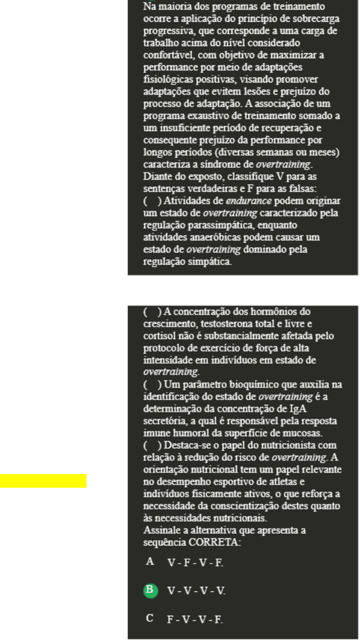 Na maioria dos programas de treinamento ocorre a aplicação do princípio de sobrecarga progressiva, que corresponde a uma carga de trabalho acima do nível considerado confortável, com objetivo de maximizar a performance por meio de adaptações fisiológicas positivas, visando promover adaptações que evitem lesões e prejuízo do processo de adaptação. A associação de um programa exaustivo de treinamento somado a um insuficiente período de recuperação e consequente prejuízo da performance por longos períodos (diversas semanas ou meses) caracteriza a síndrome de overtraining. Diante do exposto, classifique V para as sentenças verdadeiras e F para as falsas: ( ) Atividades de endurance podem originar um estado de overtraining caracterizado pela regulação parassimpática, enquanto atividades anaeróbicas podem causar um estado de overtraining dominado pela regulação simpática. ( ) A concentração dos hormônios do crescimento, testosterona total e livre e cortisol não é substancialmente afetada pelo protocolo de exercício de força de alta intensidade em indivíduos em estado de overtraining. ( ) Um parâmetro bioquímico que auxilia na identificação do estado de overtraining é a determinação da concentração de IgA secretória, a qual é responsável pela resposta imune humoral da superfície de mucosas. ( ) Destaca-se o papel do nutricionista com relação à redução do risco de overtraining. A orientação nutricional tem um papel relevante no desempenho esportivo de atletas e indivíduos fisicamente ativos, o que reforça a necessidade da conscientização destes quanto às necessidades nutricionais.Assinale a alternativa que apresenta a sequência CORRETA: A) V - F - V - F. B) F - V - V - F. C) V - F - F - V. D) V - V - V – V. Os sistemas geradores de energia em grande parte das atividades diárias é suprido pelo metabolismo aeróbio, sendo a maior parte do gasto energético muscular proveniente da oxidação mitocondrial dos ácidos graxos livres (AGL). Diante dessa afirmativa, avalie as asserções a seguir e a relação proposta entre elas: I- Embora a produção energética seja assegurada em 40% pelos carboidratos e em 60% pelos lipídeos em repouso, o cérebro é o maior consumidor de carboidratos do organismo, situação em que os AGL asseguram quase totalmente as necessidades energéticas musculares. PORQUE II- A oxidação permite a continuação do catabolismo da glicose a partir do piruvato, bem como dos ácidos graxos e dos aminoácidos, diferente da glicólise, que utiliza exclusivamente glicose.Assinale a alternativa CORRETA: A) A primeira asserção é uma proposição falsa, e a segunda é uma proposição verdadeira. B) A primeira asserção é uma proposição verdadeira, e a segunda é uma proposição falsa. C) As duas asserções são proposições verdadeiras, mas a segunda não é uma justificativa da primeira. D) As duas asserções são proposições verdadeiras, e a segunda é uma justificativa correta da primeira. Os sistemas de produção de energia podem ser divididos de acordo com seu metabolismo de utilização dos macronutrientes. Dentre esses sistemas, tem-se o sistema oxidativo, onde dá-se a produção de ATP através do metabolismo aeróbio pela quebra da glicose, dividindo-se em três etapas. Sobre elas, associe os itens, utilizando o código a seguir: I- Glicólise. II- Ciclo de Krebs. III- Cadeia respiratório. ( ) Ocorre na matriz mitocondrial, onde o ácido pirúvico é convertido em acetil-CoA, o qual é fracionado, formando 2 ATPs + 8 NADH + 2 FADH2. ( ) Ocorre na crista mitocondrial. Os 8 NADH e os 2 FADH2 liberam seus elétrons (H+) ricos em energia, produzindo 3 ATPs por cada NADH e 2 ATPs por cada FADH2. ( ) Ocorre no citoplasma, gerando 2 ATPs + 2 piruvato + 2 NADH, com oxigênio suficiente. Assinale a alternativa que apresenta a sequência CORRETA: A) I - II - III. B) II - I - III. C) II - III - I. D) I - III – II. . Com relação aos exercícios de intensidade baixa, esses correspondem a esforços de até 30% do consumo máximo de oxigênio. Nos de intensidade moderada, os esforços requerem entre 30% do consumo máximo de oxigênio e o nível correspondente ao limiar anaeróbico. Já nos exercícios de intensidade alta, a demanda excede o limiar anaeróbico. Portanto, nos exercícios prolongados, apenas os classificados como de alta intensidade teriam participação anaeróbica significativa. A respeito do exposto, avalie as asserções a seguir e a relação proposta entre elas: I- Em casos de esforços de ritmo variável, como o jogo de tênis, ocorrem grandes variações nas necessidades de ressíntese de ATP, seguindo de periódicas modificações das variáveis fisiológicas. Essas atividades tendem a usar, inicialmente, as vias anaeróbicas alática e aeróbica, sem a participação significativa da via anaeróbica lática. PORQUE II- Em séries de exercícios com grupamentos musculares localizados, como exercícios abdominais, que tendem a reduzir a qualidade na execução e fadiga quando realizados sem interrupções, pode ser proporcionado um período de um a dois minutos de repouso, quando os exercícios serão reiniciados com a mesma velocidade, qualidade de execução adequada e relativa facilidade, pois esse tempo será suficiente para regenerar estoques intracelulares de ATP e fosfocreatina.Assinale a alternativa CORRETA: A) A primeira asserção é uma proposição verdadeira, e a segunda é uma proposição falsa. B) As duas asserções são proposições verdadeiras, e a segunda é uma justificativa correta da primeira. C) As duas asserções são proposições verdadeiras, mas a segunda não é uma justificativa da primeira. D) A primeira asserção é uma proposição falsa, e a segunda é uma proposição verdadeira. Há diferentes formas de exercício físico, cada uma delas gera diferentes efeitos agudos ou crônicos, sendo importante sistematizar classificando a via metaból