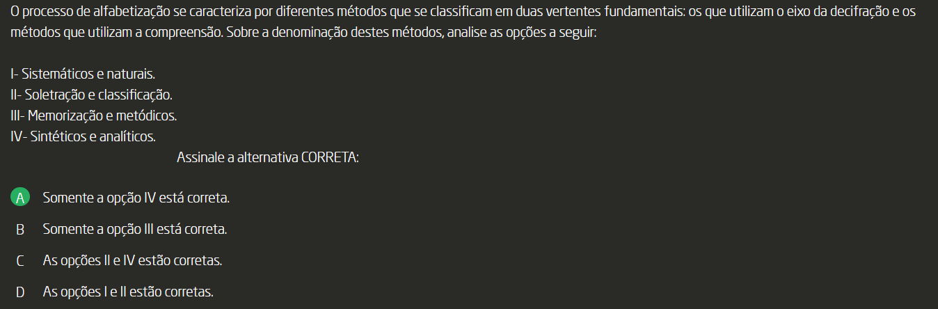 O processo de alfabetização se caracteriza por diferentes métodos que se classificam em duas vertentes fundamentais: os que utilizam eixo da decifração e os métodos que utilizam a compreensão. Sobre a denominação destes métodos, analise as opções a seguir: Sistemáticos e naturais. II- Soletração e classificação. III- Memorização e metódicos. Sintéticos e analíticos. Assinale a alternativa CORRETA: