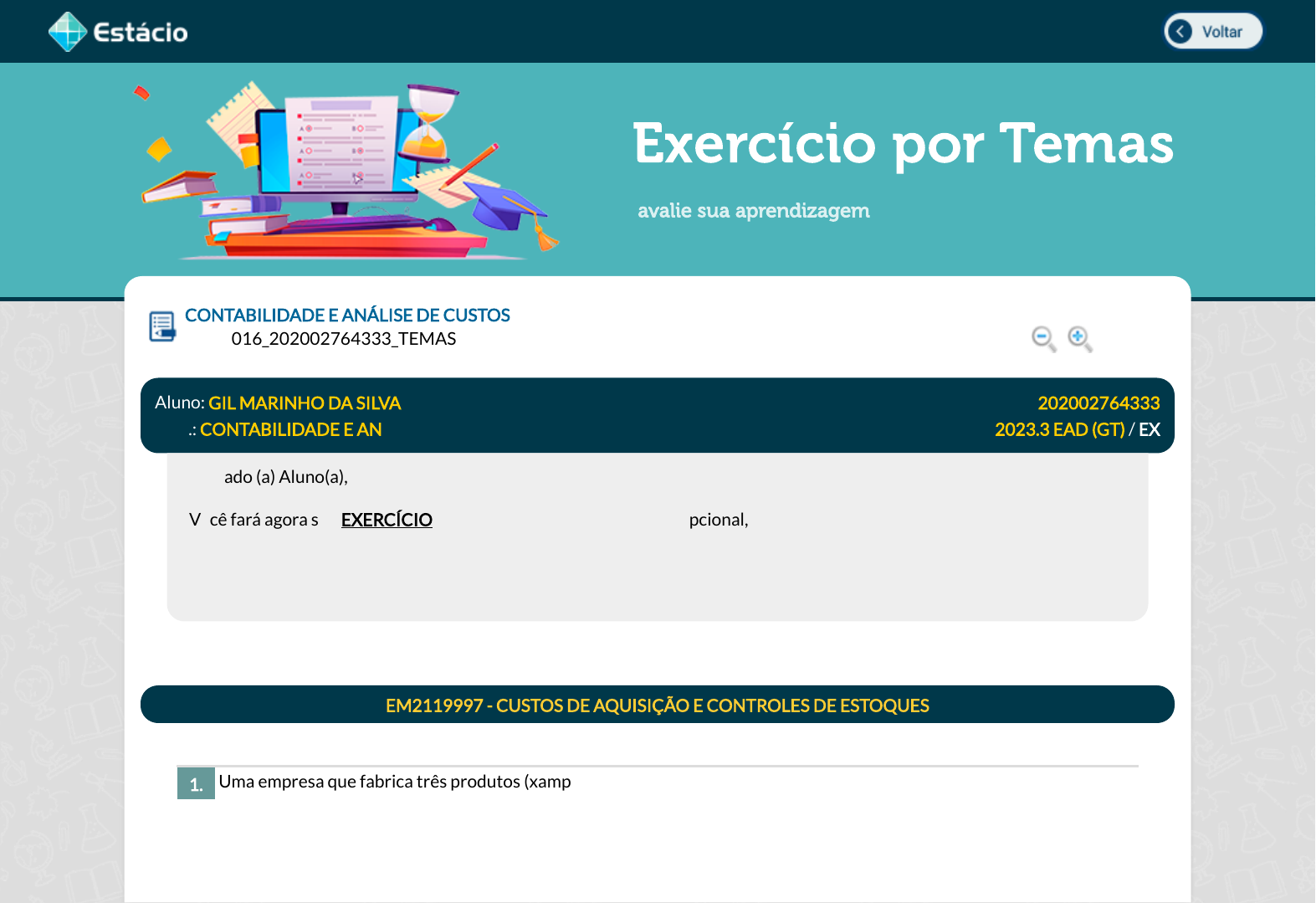 Exercício por Temas avalie sua aprendizagem Uma empresa que fabrica três produtos (xampu, condicionador e creme de pentear), todos na mesma fábrica e usando o mesmo maquinário, incorreu em R$700.000,00 de custos indiretos. Os custos primários são os seguintes: os xampus consumiram R$100.000,00 de mão de obra direta e R$100.000,00 de matéria-prima; os condicionadores, R$100.000,00 de mão de obra direta e R$150.000,00 de matéria-prima; e os cremes para pentear, R$100.000,00 de mão de obra direta e R$50.000,00 de matéria-prima. Calcule o custo primário total do xampu. CONTABILIDADE E ANÁLISE DE CUSTOS Lupa DGT0016_202002764333_TEMAS Aluno: GIL MARINHO DA SILVA Matr.: 202002764333 Disc.: CONTABILIDADE E AN 2023.3 EAD (GT) / EX Prezado (a) Aluno(a), Você fará agora seu EXERCÍCIO! Lembre-se que este exercício é opcional, mas não valerá ponto para sua avaliação. O mesmo será composto de questões de múltipla escolha. Após responde cada questão, você terá acesso ao gabarito comentado e/ou à explicação da mesma. Aproveite para se familiarizar com este modelo de questões que será usado na sua AV e AVS. EM2119997 - CUSTOS DE AQUISIÇÃO E CONTROLES DE ESTOQUES 1. javascript:voltar(); javascript:voltar(); javascript:voltar(); javascript:voltar(); javascript:diminui(); javascript:diminui(); javascript:aumenta(); javascript:aumenta(); Uma empresa incorreu nos seguintes custos: R$10.000,00 de matéria-prima, R$25.000,00 de mão de obra direta, R$13.000,00 de mão de obra indireta, R$8.000,00 de aluguel do espaço da fábrica, R$1.000,00 de aluguel de espaço da loja, R$4.000,00 de depreciação do maquinário e R$1.000,00 de energia elétrica para alimentar as máquinas de produção. Calcule o valor do custo variável para ela. É um exemplo de custo semi�xo... 200.000,00 175.000,00 300.000,00 233.333,33 350.000,00 Data Resp.: 22/10/2023 15:08:20 Explicação: A resposta correta é: 200.000,00 2. 26.000,00 11.000,00 35.000,00 1.000,00 50.000,00 Data Resp.: 22/10/2023 15:08:33 Explicação: A resposta correta é: 11.000,00 3. Outras despesas Matéria-prima Qual das seguintes alternativas não compõe a base de cálculo do custo de mercadorias? O lançamento de custos indiretos é normalmente feito com a ajuda de uma conta auxiliar. Essa conta é chamada de: Despesa �nanceira Mão de obra direta Depreciação Data Resp.: 22/10/2023 15:08:58 Explicação: A resposta correta é: Mão de obra direta 4. Valor integral Tributos recuperáveis Descontos Tributos não recuperáveis Frete Data Resp.: 22/10/2023 15:09:08 Explicação: A resposta correta é: Tributos não recuperáveis 5. Custos indiretos a apropriar Custos diretos a apropriar Despesas operacionais Custo das mercadorias vendidas Tributos a recuperar Data Resp.: 22/10/2023 15:09:22 Uma empresa que fabrica três produtos (xampu, condicionador e creme de pentear), todos na mesma fábrica e usando o mesmo maquinário, incorreu em R$700.000,00 de custos indiretos. Os custos primários são os seguintes: os xampus consumiram R$100.000,00 de mão de obra direta e R$100.000,00 de matéria-prima; os condicionadores, R$100.000,00 de mão de obra direta e R$150.000,00 de matéria-prima; e os cremes para pentear, R$100.000,00 de mão de obra direta e R$50.000,00 de matéria-prima. Calcule o rateio pelo método da mão de obra direta do xampu. Uma empresa tem no estoque 500 produtos produzidos em abril ao custo de R$5,00 cada, 1.000 produzidos em maio ao custo de R$6,00 cada e 2.000 em junho a R$5,80 cada. Sabe-se que ela possui controle especí�co de estoque e que vendeu 200 produtos produzidos em abril e 50 produzidos em maio. Calcule o custo das mercadorias vendidas pelo método do preço especí�co. Explicação: A resposta correta é: Custos indiretos a apropriar 6. 233.333,33 200.000,00 175.000,00 300.000,00 350.000,00 Data Resp.: 22/10/2023 15:09:46 Explicação: A resposta correta é: 233.333,33 7. R$1.250,00 (PEPS) R$750,00 R$1.450,00 (UEPS) R$1.435,50 (custo médio) R$1.300,00 (PE) Data Resp.: 22/10/2023 15:10:06 Constitui um exemplo de custo semivariável... Trata-se de um exemplo de custo direto... Explicação: A resposta correta é: R$1.300,00 (PE) 8. Depreciação Matéria-prima Água Despesa �nanceira Mão de obra direta Data Resp.: 22/10/2023 15:10:12 Explicação: A respsota correta é: Água 9. Mão de obra indireta Matéria-prima Depreciação Despesa �nanceira Aluguéis Data Resp.: 22/10/2023 15:10:28 Explicação: A resposta correta é: Matéria-prima Uma empresa que fabrica três produtos (xampu, condicionador e creme de pentear), todos na mesma fábrica e usando o mesmo maquinário, incorreu em R$700.000,00 de custos indiretos. Os custos primários são os seguintes: os xampus consumiram R$100.000,00 de mão de obra direta e R$100.000,00 de matéria-prima; os condicionadores, R$100.000,00 de mão de obra direta e R$150.000,00 de matéria-prima; e os cremes para pentear, R$100.000,00 de mão de obra direta e R$50.000,00 de matéria-prima. Calcule o rateio pelo método da matéria-prima do condicionador. 10. 350.000,00 233.333,33 200.000,00 175.000,00 300.000,00 Data Resp.: 22/10/2023 15:10:50 Explicação: A resposta correta é: 350.000,00 Não Respondida Não Gravada Gravada Exercício por Temas inciado em 22/10/2023 15:08:04.