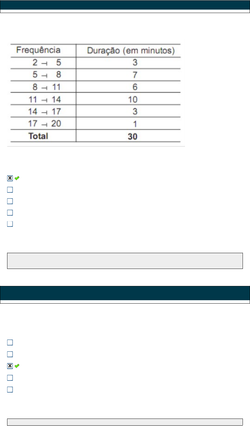 Questão Acerto: 0,2 / 0,2 A tabela a seguir apresenta a distribuição de frequências associada à duração de chamadas telefônicas, em minutos, em uma determinada região. A mediana e o terceiro quartil, calculados com base na tabela acima são, respectivamente: 10,5 e 12,95 15 e 22,5 10,5 e 13,5 11 e 13,5 11 e 14,45 Respondido em 22/10/2023 18:30:48 Explicação: Resposta correta: 10,5 e 12,95 2a Questão Acerto: 0,2 / 0,2 Um dado não viciado, com a forma de um cubo e com as faces numeradas de 1 até 6, foi lançado 3 vezes. Sabendo que a soma dos resultados obtidos foi igual a 5, qual é a probabilidade de o resultado do segundo lançamento do dado ter sido igual a 2? 1/6 1/2 1/3 1/5 1/18 Respondido em 22/10/2023 18:34:31 Explicação: A resposta correta é 1/3. 3a Questão Acerto: 0,2 / 0,2 (CESGRANRIO/2021) Os alunos de certa escola formaram um grupo de ajuda humanitária e resolveram arrecadar fundos para comprar alimentos não perecíveis. Decidiram, então, fazer uma rifa e venderam 200 tíquetes, numerados de 1 a 200. Uma funcionária da escola resolveu ajudar e comprou 5 tíquetes. Seus números eram 75, 76, 77, 78 e 79. No dia do sorteio da rifa, antes de revelarem o ganhador do prêmio, anunciaram que o número do tíquete sorteado era par. Considerando essa informação, a funcionária concluiu acertadamente que a probabilidade de ela ser a ganhadora do prêmio era de: 2,0% 5,0% 1,0% 4,0% 3,0% Respondido em 22/10/2023 18:34:55 Explicação: Foram sorteados 200 tíquetes. Logo, temos 100 números pares. A funcionária possui apenas dois tíquetes com valor par (76,78). P = 2/100 P = 2% 4a Questão Acerto: 0,2 / 0,2 Uma empresa de agricultura estuda o crescimento de suas plantações de trigo ao longo do ano em termos de altura. Eles modelaram a altura média das plantações como uma variável aleatória contínua H, com uma conhecida função de distribuição acumulada F(h) que é diferenciável ao longo do domínio. A equipe quer saber a taxa de variação da altura média das plantações em um determinado momento h0. Qual das seguintes opções melhor representa essa taxa de variação? A integral de F(h) de 0 até h0. F(h0). A média de F(h) de 0 até h0. P(H=h0). A derivada de F(h) no ponto h0. Respondido em 22/10/2023 18:35:46 Explicação: A taxa de variação da função de distribuição acumulada em um ponto específico é dada pela derivada dessa função nesse ponto. A derivada da função de distribuição acumulada é exatamente a função densidade. 5a Questão Acerto: 0,2 / 0,2 Um fabricante de brinquedos realiza testes de qualidade em seus produtos. Durante o processo de produção, há uma probabilidade de 0,2 de um brinquedo ser considerado defeituoso. Considerando a importância da distribuição binomial, qual das alternativas abaixo melhor representa a natureza dessa distribuição nesse contexto? Probabilidade de um brinquedo ser selecionado aleatoriamente para o teste de qualidade. Número total de brinquedos produzidos pela empresa. Média aritmética da quantidade de brinquedos defeituosos encontrados nos testes. Identificação única de cada brinquedo produzido. Cor da embalagem utilizada para os brinquedos. Respondido em 22/10/2023 18:36:24 Explicação: A distribuição binomial é aplicada quando há um experimento com um número fixo de tentativas independentes, cada uma com dois resultados possíveis, sucesso ou fracasso. No contexto do fabricante de brinquedos realizando testes de qualidade, a distribuição binomial é utilizada para analisar a quantidade de brinquedos defeituosos encontrados nos testes. A média aritmética dessa quantidade é um indicador importante para a qualidade dos produtos e representa a natureza dessa distribuição nesse contexto. Portanto, a alternativa "Média aritmética da quantidade de brinquedos defeituosos encontrados nos testes." é a correta, pois está relacionada à aplicação da distribuição binomial para calcular a média da quantidade de brinquedos defeituosos nos testes de qualidade, de acordo com a definição e as características dessa distribuição. 6a Questão Acerto: 0,2 / 0,2 Determine a mediana das seguintes observações: 17, 12, 9, 23, 14, 6, 3, 18, 42, 25, 18, 12, 34, 5, 17, 20, 7, 8, 21, 13, 31, 24, 9. 14,5 15,5 13,5 17 14 Respondido em 22/10/2023 18:36:51 Explicação: Resposta correta: 17 Para determinar a mediana das observações, precisamos primeiro organizar os números em ordem crescente: 3, 5, 6, 7, 8, 9, 9, 12, 12, 13, 14, 17, 17, 18, 18, 20, 21, 23, 24, 25, 31, 34, 42 Agora, para encontrar a mediana, precisamos encontrar o valor central. Como temos 23 observações, o valor central estará na posição (23 + 1) / 2 = 12. Portanto, a mediana é o 12º número na lista, que é igual a 17. Portanto, a mediana das observações fornecidas é 17 7a Questão Acerto: 0,2 / 0,2 Em uma caixa, há 3 moedas: 2 são honestas, e 1 tem 3 vezes mais probabilidade de dar cara do que de dar coroa. Uma moeda é selecionada aleatoriamente da caixa e é lançada sucessivamente 2 vezes. Qual é a probabilidade da ocorrência de duas caras? 13/32 17/48 17/54 25/64 9/17 Respondido em 22/10/2023 18:37:28 Explicação: A resposta correta é: 17/48 8a Questão Acerto: 0,2 / 0,2 Considere um conjunto de divisores positivos de 60. Escolhemos ao acaso um elemento desse conjunto. Qual a probabilidade desse elemento ser primo? 1/6 1/8 1/2 1/4 1/12 Respondido em 22/10/2023 18:38:11 Explicação: A resposta correta é: 1/4 9a Questão Acerto: 0,2 / 0,2 A companhia de ônibus "Viaje Bem" realiza viagens diárias de uma cidade A para uma cidade B. A quantidade de passageiros que chegam atrasados e perdem o ônibus é representada pela variável aleatória Z. Sua função de distribuição acumulada é definida da seguinte forma: · Fx = 0, se z < 0 · Fx = 0,2, se 0 ≤ z < 1 · Fx = 0,5, se 1 ≤ z < 2 · Fx = 0,9, se 2 ≤ z < 3 · F(x) = 1, se z ≥ 3 Dado isso, qual dos seguintes valores de z demon