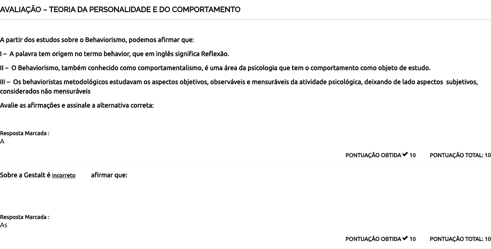 AVALIAÇÃO – TEORIA DA PERSONALIDADE E DO COMPORTAMENTO PONTUAÇÃO TOTAL: 10PONTUAÇÃO OBTIDA 10 A partir dos estudos sobre o Behaviorismo, podemos a�rmar que: I – A palavra tem origem no termo behavior, que em inglês signi�ca Re�exão. II – O Behaviorismo, também conhecido como comportamentalismo, é uma área da psicologia que tem o comportamento como objeto de estudo. III – Os behavioristas metodológicos estudavam os aspectos objetivos, observáveis e mensuráveis da atividade psicológica, deixando de lado aspectos subjetivos, considerados não mensuráveis Avalie as a�rmações e assinale a alternativa correta: Resposta Marcada : A�rmações II e III estão corretas. PONTUAÇÃO TOTAL: 10PONTUAÇÃO OBTIDA 10 Sobre a Gestalt é incorreto a�rmar que: Resposta Marcada : As características do estimulo são mais importantes que o olhar do observador. PONTUAÇÃO TOTAL: 10PONTUAÇÃO OBTIDA 10 De acordo com os estudos da apostila em relação a humanidade usamos seis dimensões como estrutura para examinar o conceito de humanidade de cada teórico. São elas: Resposta Marcada : Determinismox Livre Arbítrio, Pessimismo x Otimismo, Causalidade x Teleologia, Consciente x inconsciente, In�uencias Biológicas x Sociais, Singularidade x Semelhanças. PONTUAÇÃO TOTAL: 10PONTUAÇÃO OBTIDA 10 A palavra _____________possui a distinção dúbia de ser um dos termos mais usados indevidamente e mais pouco compreendido da __________. Conforme os estudos da apostila, assinale a alternativa que completa corretamente os espaços. Resposta Marcada : Teoria– Língua inglesa. PONTUAÇÃO TOTAL: 10PONTUAÇÃO OBTIDA 10 Considerado o pai da Filoso�a Ocidental. Desenvolveu a técnica da Maiêutica, método pelo qual a ideia nascia, era o parir das ideias, de forma semelhante a um parto. Assinale a alternativa a que se refere o teórico: Resposta Marcada : Sócrates. PONTUAÇÃO TOTAL: 10PONTUAÇÃO OBTIDA 10 Sobre a psicanálise, assinale a alternativa incorreta: Resposta Marcada : Seu principal objetivo foi o de descobrir o propósito no consciente do ser, suas necessidades, os complexos, um intérprete das necessidades humanas físicas e explicitas. PONTUAÇÃO TOTAL: 10PONTUAÇÃO OBTIDA 10 Sobre personalidade. Assinale abaixo a alternativa incorreta: Resposta Marcada : A de�nição de que os antigos usavam uma máscara (persona) para projetar um papel ou uma falsa aparência, é totalmente aceitável. PONTUAÇÃO TOTAL: 10PONTUAÇÃO OBTIDA 10 Qual é a origem do signi�cado da palavra psicologia e qual o seu signi�cado? Resposta Marcada : Grega, estudo da mente. 100 / 100 PONTUAÇÃO TOTAL: 10PONTUAÇÃO OBTIDA 10 São estágios psicossexuais da teoria de Freud: Resposta Marcada : Estágio Oral, Estágio Anal, Estágio Fálico, Período de Latência, Estágio Genital. PONTUAÇÃO TOTAL: 10PONTUAÇÃO OBTIDA 10 Segundo, alguns aspectos da personalidade são discutidos por diferentes teóricos. Resposta Marcada : A ansiedade, o senso de competência, o con�ito intrapsíquico e o nível de sociabilidade. Total