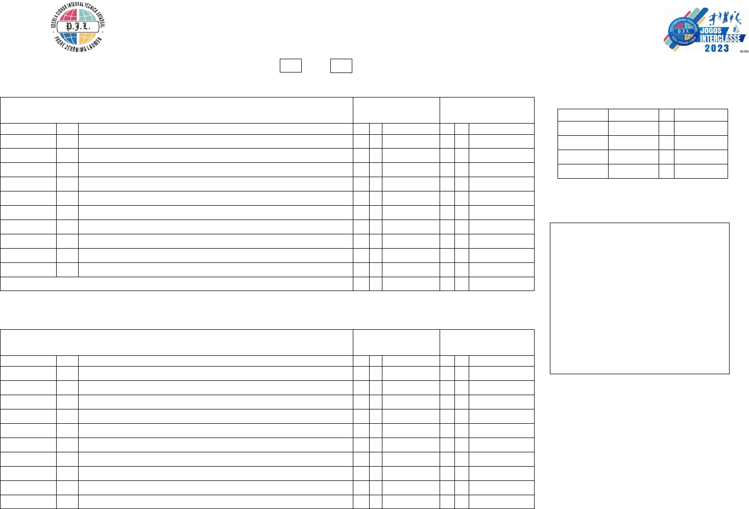 Escola Cidadã Integral Técnica Estadual Padre Jerônimo Lauwen SÚMULA DE QUEIMADA ____________________ X ____________________ LOCAL: Biscoitão DATA____/____/______ SEXO ( ) F ( ) M ( ) Misto EQUIPE A - SAÍDA 1º SET 2º SET DOC Nº NOME A V QUEIMADOS A V QUEIMADOS VIDAS DO CAPITÃO: Nº Sets Equipe A x Equipe B 1º 2º Vencedor Placar EQUIPE DE ARBITRAGEM EQUIPE DE ARBITRAGEM EQUIPE B - SAÍDA 1º SET 2º SET DOC Nº NOME A V QUEIMADOS A V QUEIMADOS VIDAS DO CAPITÃO: