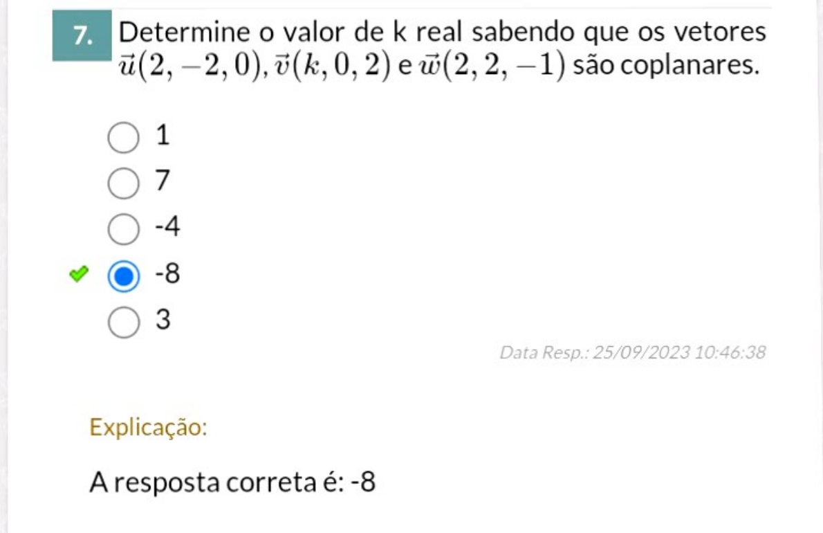 O que o produto escalar entre dois vetores determina? Questão 7Resposta Um vetor perpendicular aos dois vetores. Um número real. Um ângulo en...