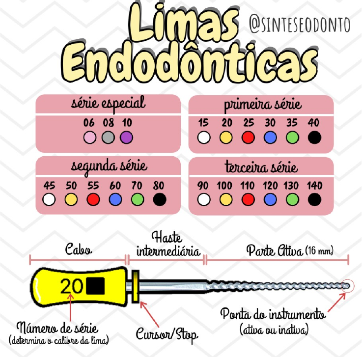 Revisão Endo · Limas Tipo K: Alargamento e limagem dos canais retos; · Lima K Flexoflie: Canais curvos e retos; · Limas Hedstroen: Remoção de resíduos, regularização das paredes, exérese das polpas em canais amplos e retos. · Padronização das limas e alargadores: · Movimento de Alargamento: Deslocamento (avanço) e de giro (rotação) do alargador no interior de um canal. Pode ser: Parcial, Alternado e Contínuo. · Exploração ou Cateterismo: Consiste no avanço progressivo de um instrumento de pequeno calibre (LK 08 ou LK 10) explorando todo o trajeto do canal. Particularmente indicado para canais atrésicos. · Grampos · Anatomia Interna Dental Classificação dos canais: · Grupos dentais. Incisivo: Terço cervical – triangular Terço médio – próx. Circular Terço apical – arredondada Incisivo lateral superior: Terço cervical – triangular Terço médio – ovalada Terço apical – circular Canino superior: Terço cervical – ovalada Terço médio – ovalada Terço apical – circular 1º Pré-molar superior: Terço cervical – 2 canais de forma elíptica Terço médio – 2 canais de forma circular Terço apical – 2 canais circulares separados 2º Pré-molar superior: Terço cervical – elíptica Terço médio – ovalada Terço apical – circular