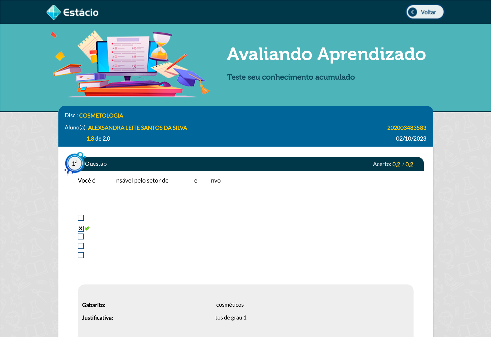 02/10/2023, 16:00 Estácio: Alunos Avaliando Aprendizado Teste seu conhecimento acumulado Disc.: COSMETOLOGIA Aluno(a): ALEXSANDRA LEITE SANTOS DA SILVA 202003483583 Acertos: 1,8 de 2,0 02/10/2023 Acerto: 0,2 / 0,2 Você é o responsável pelo setor de pesquisa e desenvolvimento de uma indústria cosmética, que pretende desenvolver uma nova linha de produtos naturais. Entretanto, a marca pretende entregar um produto com um diferencial no mercado, oferecendo produtos para a pele que agreguem a ação fotoprotetora. Baseado nessas informações, assinale a alternativa correta: Esses produtos serão considerados produtos cosméticos de grau 2, por não apresentarem restrições de uso. Esses produtos serão considerados produtos cosméticos de grau 2, por apresentarem ação fotoprotetora. Esses produtos serão considerados produtos cosméticos de grau 2, por apresentarem propriedades básicas. Esses produtos serão considerados produtos cosméticos de grau 1, pois são produtos destinados à pele. Esses produtos serão considerados produtos cosméticos de grau 1, por representarem formulações naturais. Respondido em 02/10/2023 15:49:16 Explicação: Gabarito: Esses produtos serão considerados produtos cosméticos de grau 2, por apresentarem ação fotoprotetora. Justi�cativa: Os cosméticos são classi�cados em produtos de grau 1 e grau 2, de acordo com a RDC n.º 7/2015. Produtos de grau 1 apresentam propriedades básicas, sem restrições de uso; enquanto produtos de grau 2 apresentam indicações especí�cas que requerem ensaios de segurança e e�cácia, além de serem necessários cuidados especí�cos em seu uso. Dessa forma, produtos Questão1 a https://simulado.estacio.br/alunos/inicio.asp https://simulado.estacio.br/alunos/inicio.asp javascript:voltar(); javascript:voltar(); 02/10/2023, 16:00 Estácio: Alunos cosméticos que apresentam ação fotoprotetora são classi�cados como grau 2. Em relação a formulações cosméticas naturais e produtos destinados a pele, é necessário avaliar a �nalidade do produto e as indicações especí�cas (se houver), para classi�cá-lo como grau 1 ou 2. Essas características, no entanto, não estão relacionadas diretamente à classi�cação de risco de um produto cosmético. Logo, se tivéssemos apenas a informação de que é um cosmético natural e/ou que se destina à pele e não houvesse informações adicionais, não conseguiríamos avaliar sua classi�cação. Entretanto, a presença de ação fotoprotetora em um cosmético direciona a classi�cação para o grau 2, visto que são necessários ensaios de segurança e e�cácia para con�rmar essa indicação. Acerto: 0,0 / 0,2 O uso de sistemas transdérmicos é limitado, pois os fármacos que podem ser carreados dessa maneira são restritos, devido à barreira e�ciente oferecida pela pele. Avalie como Verdadeiro (V) ou Falso (F) o que se a�rma acerca dos sistemas transdérmicos: ( ) Uma das formas efetivas de aumentar a permeação da maioria dos fármacos através da pele é promover uma oclusão no local. ( ) O uso de dimetilsufóxido (DMSO), mesmo em pequenas quantidades, é considerado tóxico, pois interage com grupamentos de cabeça na bicamada lipídica no estrato córneo, perturbando o empacotamento próximo, reduzindo assim a difusão do fármaco pela pele. ( ) A iontoforese gera um potencial elétrico através da pele, promovendo um aumento da liberação transdérmica de fármacos. ( ) A utilização de microagulhas revestidas é uma forma de aumentar a permeação cutânea de fármacos, pois promoverá a criação de poros ou caminhos transitórios através do estrato córneo. Assinale a sequência correta: F, V, F, F. V, F, V, F. F, F, V, V. V, F, V, V. F, V, F, V. Respondido em 02/10/2023 15:50:57 Explicação: Uma das formas efetivas de aumentar a permeação da maioria dos fármacos através da pele é promover uma oclusão no local. Verdadeiro. A oclusão realizada pelo adesivo transdérmico aumenta a hidratação do local melhorando a permeação do fármaco. Questão2 a 02/10/2023, 16:00 Estácio: Alunos O uso de dimetilsufóxido (DMSO), mesmo em pequenas quantidades, é considerado tóxico, pois interage com grupamentos de cabeça na bicamada lipídica no estrato córneo, perturbando o empacotamento próximo, reduzindo assim a difusão do fármaco pela pele. Errado. O DMSO é considerado seguro em pequenas concentrações. A iontoforese gera um potencial elétrico através da pele, promovendo um aumento da liberação transdérmica de fármacos. Correto. É uma técnica de liberação de compostos químicos com carga (íons) ou macromoléculas (peptídeos) através da pele utilizando um campo elétrico A utilização de microagulhas revestidas é uma forma de aumentar a permeação cutânea de fármacos, pois promoverá a criação de poros ou caminhos transitórios através do estrato córneo. Correto. Já as microagulhas ocas geralmente possuem um orifício revestido que facilita o �uxo das substâncias ativas para a pele, ocasionando velocidades de liberação de ativos mais rápidas. Acerto: 0,2 / 0,2 Joana estava com viagem marcada para passar um mês passeando pelo litoral do nordeste de carro. Durante os preparativos ela foi a farmácia comprar um protetor solar. No dia a dia ela utiliza uma base com �ltro solar com FPS 20 e como ela vai passar muitos dias com exposição solar ela comprou um FPS 40 para ter o dobro de proteção. Analisando a situação, a postura da Joana está Incorreta, pois o aumento do fator de proteção gera um pequeno aumento na proteção. Incorreta, pois como ela vai �car muito exposta ao sol deveria usar um protetor com FPS 100% que garante 100% de proteção contra os raios UV. Correta, pois o FPS determina quantas vezes mais estamos protegidos, no caso dela 20 vezes mais, ou seja, o dobro. Correta, mas para ter a proteção ela não pode entrar na água, pois os protetores solares com mais de F
