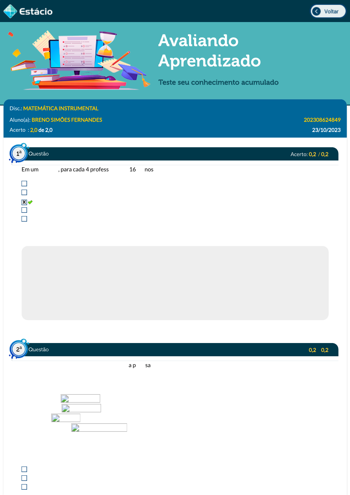 Avaliando Aprendizado Teste seu conhecimento acumulado Disc.: MATEMÁTICA INSTRUMENTAL Aluno(a): BRENO SIMÕES FERNANDES 202308624849 Acertos: 2,0 de 2,0 23/10/2023 Acerto: 0,2 / 0,2 Em uma escola, para cada 4 professores, há 16 alunos. Se a escola tem 40 professores, quantos alunos ela tem? 80 alunos. 200 alunos. 160 alunos. 240 alunos. 120 alunos. Respondido em 23/10/2023 16:46:09 Explicação: A razão entre professores e alunos é de 1 para 4, ou seja, para cada professor, há 4 alunos. Utilizando a razão dada, para 40 professores, o número de alunos será: 40 × 4 = 160 Portanto, para 40 professores, a escola tem 160 alunos. Acerto: 0,2 / 0,2 Para uma relação ser considerada função ela precisa satisfazer uma condição. Considere as seguintes relações e veri�que se elas são funções: I. fx=2x+3 . II. gx=x2+1 . III. kx=x . IV. mx=x2-4x+4 . É correto o que se a�rma em: Apenas I e II. Apenas III e IV. Apenas IV. Questão1 a Questão2 a https://simulado.estacio.br/alunos/inicio.asp https://simulado.estacio.br/alunos/inicio.asp javascript:voltar(); javascript:voltar(); Apenas I, III e IV. I, II, III e IV. Respondido em 23/10/2023 16:46:41 Explicação: Todas as relações fornecidas passam na de�nição de função, ou seja, para cada valor de x, há apenas um valor correspondente de f(x). Acerto: 0,2 / 0,2 Seja , de�nida por: , o conjunto imagem de é dado por: Respondido em 23/10/2023 16:47:14 Explicação: A resposta correta é: É possível notar que f(x) só poderá assumir valores positivos ou 0. Vamos explorar as possibilidades do enunciado. -x-1, se x <= -1 Vamos pegar como exemplo x =-2, logo, f(-2)=-(-2)-1=2-1=1 Outro exemplo x=-1, logo f(-1)=-(-1)-1=0 Note que f(x) só poderá assumir valores positivos ou 0. -x2+1, se -1 Vamos testar para x=0,5, logo f(0,5)=-(0,5)2+1=-0,25+1=0,75 Note que f(x) só poderá assumir valores positivos. x-1, se x>=1 Escolhendo x=2 temos f(2)=2-1=1 Note que f(x) só poderá assumir valores positivos. Acerto: 0,2 / 0,2 Um fazendeiro deseja fazer um galinheiro retangular encostado em um muro com um orçamento de R$ 800,00. O material da cerca do lado paralelo ao muro custa R$ 5,00 por metro e o material dos outros dois lados da cerca f : R → R f(x) = ⎧⎪ ⎨ ⎪⎩ −x − 1, se x ≤ −1 −x2 + 1, se − 1 < x < 1 x − 1, se x ≥ 1 f ]−∞, 1] ]−∞, −1] [1, +∞[ [0, +∞[ [−1, 1] [0, +∞[ Questão3 a Questão4 a custa R$ 10,00 por metro. Quais são as dimensões dos lados desse cercado para que ele possua a maior área possível com o custo de R$ 800,00? 10m, 90m e 10m 30m, 60m e 30m 40m, 40m e 40m 50m, 30m, 50m 20m, 80m e 20m Respondido em 23/10/2023 16:47:48 Explicação: A resposta correta é: 20m, 80m e 20m Acerto: 0,2 / 0,2 Sabe-se que A . X = B, sendo e . A matriz X que satisfaz as condições apresentadas é: Respondido em 23/10/2023 16:48:25 Explicação: A resposta correta é: Acerto: 0,2 / 0,2 O limite é igual a: 12 0 3 4 1 Respondido em 23/10/2023 16:49:30 Explicação: A = [ −1 1 2 − 3 ] B = [ 1 2 ] [−5 −4 ] [ 5 −4 ] [−5 4 ] [−4 −5 ] [−4 5 ] [−5 −4 ] limx→−2 x3−8 x−2 Questão5 a Questão6 a Substituindo a tendência na função �camos com (-8-8)/(-2-2) = (-16/-4) = 4 Acerto: 0,2 / 0,2 Para confeccionar um cartaz de propaganda, comprei uma folha de cartolina com 2,5m2. Se, para fazer o cartaz, eu necessito de apenas de 750cm2, quanto por cento da folha será utilizado para a confecção desse cartaz? 25% 3% 10% 6% 30% Respondido em 23/10/2023 16:49:57 Explicação: Primeiro é necessário que as duas grandezas estejam na mesma unidade. Vamos transformar 2,5m em cm . 1 m equivale a 10.000 cm , logo, 2,5 m = 25.000 cm . Agora calculando a porcentagem que 750 cm representa em 25.000 cm , temos: 750/25.000 = 0,03 = 3% Acerto: 0,2 / 0,2 Um restaurante escolar realizou uma pesquisa de qualidade das suas refeições. O resultado é observado no grá�co abaixo. Para continuar servindo refeições, é necessário que o restaurante tenha refeições aprovadas por pelo menos 70% de seus alunos. Sabendo que as aprovadas são apenas aquelas que obtiveram resultado ótimo ou excelente, pode-se a�rmar que esse restaurante escolar continuará servindo refeições? Não, pois o percentual de refeições aprovados foi, aproximadamente, 50%. Sim, pois o percentual de refeições aprovados foi, aproximadamente, 70%. Sim, pois o percentual de refeições aprovados foi, aproximadamente, 80%. 2 2 2 2 2 2 2 2 Questão7 a Questão8 a Não, pois o percentual de refeições aprovados foi, aproximadamente, 40%. Sim, pois o percentual de refeições aprovados foi, aproximadamente, 90%. Respondido em 23/10/2023 16:51:27 Explicação: O restaurante será aprovado com o maior resultado de aprovação para ótimo ou excelente. Pelo grá�co notamos que ótimo obteve 78 contagens contra 25 contagens para excelente. Vamos usar as contagens de ótimo para determinar o percentual de aprovação: % aprovação = (contagens ótimo / total de contagens) x 100 % aprovação = (78 / 191) x 100 % aprovação = 0,408 x 100 % aprovação = 40,8 %. Com essa porcentagem de aprovação o restaurante não continuará servindo refeições. A opção mais próxima é: Não, pois o percentual de refeições aprovados foi, aproximadamente, 40%. Acerto: 0,2 / 0,2 O estudo de funções é fundamental na matemática, pois as funções desempenham um papel crucial em modelar relações entre variáveis em diversos contextos. Considere uma função f:R+ →R+ que é crescente e satisfaz a seguinte condição: f(2x)=2f(x), para todo x ∈ R+. Se f(4)=8, qual é o valor de f(1). 8. 1. 16. 2. 4. Respondido em 23/10/2023 16:54:21 Explicação: f(2 x 2) = 2 x f(2) 8 = 2 x f(2) f(2) = 8/2 = 4 Determinando f(1) f(2 x 1) = 2 x f(1) f(2) = 2 x f(1) f(1) = 4/2 = 2 Acerto: 0,2 / 0,2 Assim como toda matéria existente no planeta, os átomos de um elemento químico radioativo possuem a tendência de se desintegrar. Com o passar do 