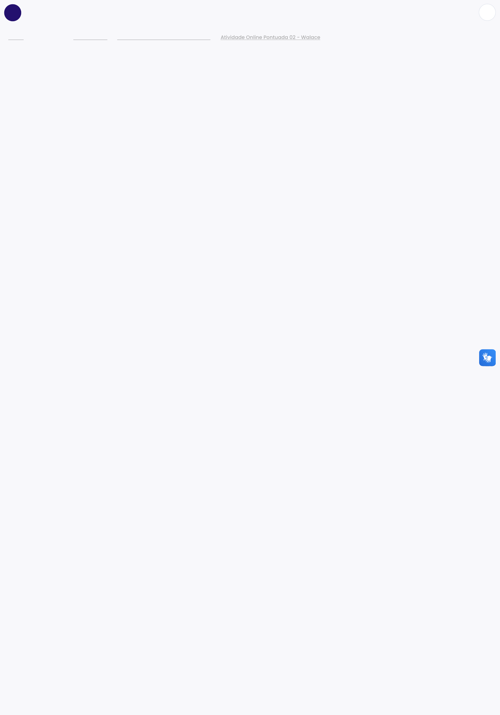 - Meus cursos - - - Painel Bioestatística Atividades Online Pontuadas e Notas Atividade Online Pontuada 02 - Walace https://ceadsaladeaula.uvv.br/my/ https://ceadsaladeaula.uvv.br/course/view.php?id=510 https://ceadsaladeaula.uvv.br/course/view.php?id=510§ion=2 https://ceadsaladeaula.uvv.br/mod/quiz/view.php?id=48054 Iniciado em segunda, 18 set 2023, 21:39 Estado Finalizada Concluída em segunda, 18 set 2023, 21:54 Tempo empregado 14 minutos 57 segundos Notas 1,14/2,00 Avaliar 1,14 de um máximo de 2,00(57%) Questão 1 Completo Atingiu 0,00 de 0,29 Com base no gráfico, o valor da parte inteira da mediana dos empregos formais surgidos no período é: Escolha uma opção: a. 212.952 b. 229.913 c. 240.621 d. 298.041 e. 255.496 Questão 2 Completo Atingiu 0,00 de 0,29 A variância e o desvio padrão são medidas que levam em consideração a totalidade dos valores da variável em estudo, o que faz delas índices de variabilidade bastante estáveis e, por isso mesmo, os mais geralmente empregados. Analise as afirmativas acerca dessas importantes estatísticas. I. Tanto o desvio padrão como a variância são usados como medidas de dispersão ou variabilidade. O uso de uma ou de outra dependerá da finalidade que se tenha em vista. II. Somando-se ou subtraindo-se uma constante “a” de todos os valores de uma variável, o desvio padrão não altera. III. Multiplicando-se todos os valores de uma variável por uma constante diferente de zero, o desvio padrão não altera. É correto o que se afirma em: Escolha uma opção: a. I e III b I e II b. I e II c. II d. III e. I Questão 3 Completo Atingiu 0,29 de 0,29 Uma amostra aleatória de tamanho n = 5 dos prontuários de uma delegacia revelou as seguintes alturas dos cidadãos constantes dos prontuários: 1,60 m, 1,65 m, 1,72 m, 1,69 m e 1,75 m. Então, a média e a mediana dos dados amostrais são, respectivamente, Escolha uma opção: a. 1,608 m e 1,75 m b. 1,682 m e 1,69 m. c. 1,725 m e 1,72 m. d. 1,725 m e 1,72 m. e. 1,654 m e 1,65 m. Questão 4 Completo Atingiu 0,29 de 0,29 Considere os seguintes resultados relativos a três distribuições de frequências e determine o tipo de assimetria de cada uma delas. Classifique as afirmativas abaixo como verdadeira (V) ou Falsa (F) Distribuição A = Simétrica Distribuição B = Assimétrica positiva Distribuição C = Assimétrica Negativa Questão 5 Completo Atingiu 0,00 de 0,29 Com a finalidade de pesquisar o comportamento do aluno em um ambiente virtual de ensino-aprendizagem, foi desenvolvido um estudo, utilizando o ambiente flexível de ensino-aprendizagem de Estatística, chamado por SEstatNet. O levantamento do tempo, para cada questão no módulo de análise de dados, em relação ao uso do ambiente está descrito no gráfico abaixo. V F F Adaptado de WILGES, Beatriz et al. Comportamento adaptativo baseado no caminho de aprendizagem do estudante em um Ambiente Virtual de Ensino Aprendizagem-AVEA. Renote-Revista Novas Tecnologias Na Educação, Porto Alegre, p. 1-10, 2007. Conforme as informações apresentadas, marque a alternativa correta. Escolha uma opção: a. Os valores do desvio-padrão, erro-padrão e coeficiente de variação, são iguais. b. A distribuição é mesocúrtica e assimétrica negativa. c. Os valores de moda, média e mediana e são respectivamente 32, 80, 100 segundos. d. Podemos concluir que a média é igual a mediana, porém, a moda é muito menor que a mediana. e. Os valores do primeiro e terceiro quartil são respectivamente, 25 e 75 segundos. Questão 6 Completo Atingiu 0,29 de 0,29 A estatística descritiva é a etapa inicial da análise dos dados e, entre as medidas empregadas nesta etapa, citam-se as medidas de posição e de ordenamento. Com relação às medidas de posição e de ordenamento, avalie as afirmativas apresentadas a seguir: I. O Quartil divide o conjunto de dados em quatro partes iguais e cada parte abrange 25% do número total de dados. II. O ponto de equilíbrio de um conjunto de dados é denominado mediana e é afetado pela presença de valores discrepantes. III. O valor que ocupa a posição central em um conjunto de dados, dividindo a amostra em dois subgrupos com o mesmo tamanho, é a média. É correto o que se afirma em: Escolha uma opção: a. II e III, apenas. b. I, II e III. c. I, apenas. d. I e III, apenas. e. I e II, apenas. Questão 7 Completo Atingiu 0 29 de 0 29 Completo Atingiu 0,29 de 0,29 O Diretor de uma empresa deseja analisar suas funcionárias do sexo feminino. Uma das análises foi sobre o número de filhos. As informações de todas as funcionárias do sexo feminino estão apresentados no gráfico a seguir: A dispersão relativa é de aproximadamente: Escolha uma opção: a. 33% b. 25% c. 60% d. 43% e. 53% Terminar revisão Atividade Online Pontuada 01 … Seguir para... Manual: Como acessar a Aula… https://ceadsaladeaula.uvv.br/mod/quiz/view.php?id=48054 https://ceadsaladeaula.uvv.br/mod/quiz/view.php?id=47873&forceview=1 https://ceadsaladeaula.uvv.br/mod/url/view.php?id=46478&forceview=1