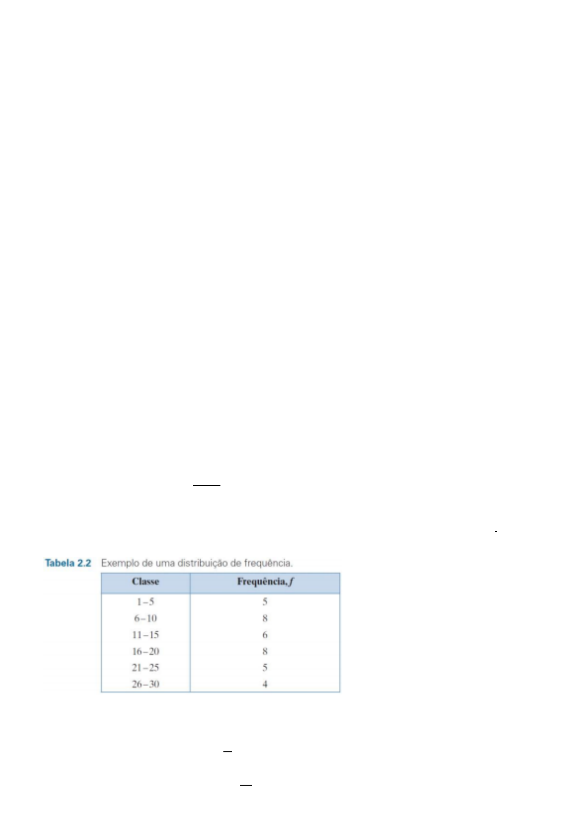 Aula 05 - Estatística Descritiva terça-feira, 8 de setembro de 2020 12:08 Distribuições de Frequência e seus Gráficos Objetivos da aula • Aprender como construir uma distribuição de frequência incluindo limites, pontos médios, frequências relativas, frequências acumuladas e limites reais ou fronteiras. • Aprender construir histogramas de frequência, polígonos de frequência, histogramas de frequência relativa e ogivas. Distribuições de frequência Sabemos que há muitas maneiras para se organizar e descrever um conjunto de dados. Algumas características importantes que devem ser consideradas quando organizamos e descrevemos um conjunto de dados são seu centro, sua variabilidade (ou dispersão) e sua forma. Quando um conjunto de dados tem muitos valores, pode ser difícil de observar padrões. A partir de agora veremos como organizar conjuntos de dados agrupando-os em intervalos chamados de classes e formando uma distribuição de frequência. Definição Uma distribuição de frequência é uma tabela que mostra classes ou intervalos dos valores com a contagem do número de ocorrências em cada classe ou intervalo. A frequência de uma classe é o número de ocorrências de dados na classe. Na distribuição de frequência mostrada na Tabela 2.2 há seis classes. As frequências para cada uma das seis classes são 5, 8, 6, 8, 5 e 4. Cada classe tem um limite inferior de classe, que é o menor número que pode pertencer à classe, e um limite superior de classe, que é o maior número que pode pertencer à classe. Na distribuição de frequência mostrada, os limites inferiores de classe são 1, 6, 11, 16, 21 e 26 e os limites superiores de classe são 5, 10, 15, 20, 25 e 30. A amplitude de classe é a distância entre os limites inferiores (ou superiores) de classes consecutivas. Por exemplo, a amplitude de classe na distribuição de frequência mostrada é 6 - 1 = 5. Note que as classes não se sobrepõem. A diferença entre os valores máximo e mínimo dos dados é chamada de amplitude. Na Tabela 2.2, suponha que o valor máximo seja 29, e o valor mínimo seja 1. A amplitude é, então, 29 - 1 = 28. Construindo uma distribuição de frequência com base em um conjunto de dados Página 1 de Probabilidade e Estatística A diferença entre os valores máximo e mínimo dos dados é chamada de amplitude. Na Tabela 2.2, suponha que o valor máximo seja 29, e o valor mínimo seja 1. A amplitude é, então, 29 - 1 = 28. Construindo uma distribuição de frequência com base em um conjunto de dados 1) Decida o número de classes para serem incluídas na distribuição de frequência. O número de classes situa-se usualmente entre 5 e 20; caso contrário, pode ser difícil detectar padrões. 2) Encontre a amplitude de classe como a seguir. Determine a amplitude dos dados, divida a amplitude pelo número de classes e arredonde para um número próximo mais conveniente. 3) Encontre os limites de classe. Você pode usar o menor valor dos dados como o limite inferior da primeira classe. Para encontrar os demais limites inferiores, adicione a amplitude de classe ao limite inferior da classe precedente. Então, encontre o limite superior da primeira classe. Lembre-se de que as classes não se sobrepõem. Encontre os limites superiores da classes restantes. 4) Faça uma marca de contagem para cada registro na linha da classe apropriada. 5) Conte as marcas para encontrar a frequência total f para cada classe. Exemplo 1 - Construindo uma distribuição de frequência com base em um conjunto de dados O conjunto de dados a seguir lista os preços (em dólares) de 30 aparelhos GPS (global positioning system) portáteis. Construa uma distribuição de frequência com sete classes. Limite inferior Limite superior 65 104 105 144 145 184 185 224 225 264 265 304 305 344 Classes Frequência 65-104 6 105-144 9 145-184 6 185-224 4 225-264 2 265-304 1 305-344 2 Página 2 de Probabilidade e Estatística 305-344 2 30 Exemplo 2 Construa uma distribuição de frequência usando as idades das 50 mulheres mais influentes listadas abaixo. Use sete classes. a) Estabeleça o número de classes. b) Encontre os valores mínimo e máximo e a amplitude das classes. c) Encontre os limites das classes. d) Faça as marcas de contagem. e) Escreva a frequência f para cada classe. Limite inferior Limite superior 26 34 35 43 44 52 53 61 62 70 71 79 80 88 Classe Frequência 26-34 2 35-43 5 44-52 12 53-61 18 62-70 11 71-79 1 80-88 1 ________________________________________________________________________________________________ ______________ Página 3 de Probabilidade e Estatística ______________________________________________________________________________________________________________ Após construirmos uma distribuição de frequência padrão tal como a dos exemplos anteriores, podemos incluir diversas características adicionais que ajudam a fornecer um melhor entendimento dos dados. Essas características: ponto médio, frequência relativa e frequência acumulada de cada classe podem ser incluídas como colunas adicionais em sua tabela. Ponto Médio O ponto médio de uma classe é a soma dos limites inferior e superior da classe dividida por dois. O ponto médio é, às vezes, chamado de marca da classe (representante da classe). A frequência relativa de uma classe é a fração, ou proporção, de dados que está nessa classe. Para calcular a frequência relativa de uma classe, divida a frequência pelo tamanho da amostra. Caso queira expressar em percentagem, basta multiplicar esse resultado por 100. A frequência acumulada de uma classe é a soma das frequências dessa classe com todas as anteriores. A frequência acumulada da última classe é igual ao tamanho n da amostra. Por exemplo, o ponto médio da primeira classe no Exemplo 1 é: Usando a amplitude de classe de 49, os pontos médios restantes são: e assim sucessivamente. Pode-se escrever a frequência relativa como uma fração, um deci