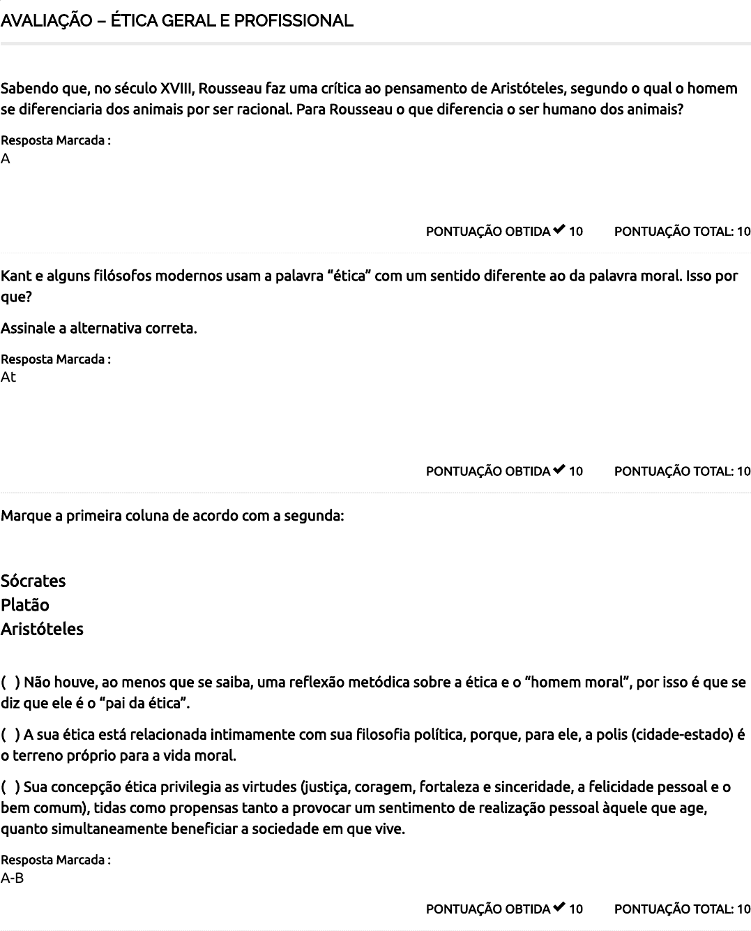 AVALIAÇÃO – ÉTICA GERAL E PROFISSIONAL PONTUAÇÃO TOTAL: 10PONTUAÇÃO OBTIDA 10 Sabendo que, no século XVIII, Rousseau faz uma crítica ao pensamento de Aristóteles, segundo o qual o homem se diferenciaria dos animais por ser racional. Para Rousseau o que diferencia o ser humano dos animais? Resposta Marcada : A capacidade de decisão por si só: a liberdade e a capacidade de aperfeiçoar-se ao longo da História. Por ser livre e por não ter nada a dirigir suas ações é que o ser humano é moral. É seu espírito crítico que vai dotar o homem de valores morais, pois o ser humano sempre busca o bem e nasce intrinsecamente bom. PONTUAÇÃO TOTAL: 10PONTUAÇÃO OBTIDA 10 Kant e alguns �lósofos modernos usam a palavra “ética” com um sentido diferente ao da palavra moral. Isso por que? Assinale a alternativa correta. Resposta Marcada : Até o século XVIII, ética e moral são sinônimos perfeitos, só modi�cados semanticamente devido às diferentes línguas de origem das duas palavras. No entanto, alguns �lósofos modernos passam a usar as duas palavras com sentido diferentes. Kant, por exemplo, de�ne como moral o conjunto de princípios gerais (valores civilizatórios) e ética sua aplicação concreta. Portanto, ética é sempre um agir ético. PONTUAÇÃO TOTAL: 10PONTUAÇÃO OBTIDA 10 Marque a primeira coluna de acordo com a segunda: Sócrates Platão Aristóteles ( ) Não houve, ao menos que se saiba, uma re�exão metódica sobre a ética e o “homem moral”, por isso é que se diz que ele é o “pai da ética”. ( ) A sua ética está relacionada intimamente com sua �loso�a política, porque, para ele, a polis (cidade-estado) é o terreno próprio para a vida moral. ( ) Sua concepção ética privilegia as virtudes (justiça, coragem, fortaleza e sinceridade, a felicidade pessoal e o bem comum), tidas como propensas tanto a provocar um sentimento de realização pessoal àquele que age, quanto simultaneamente bene�ciar a sociedade em que vive. Resposta Marcada : A-B-C PONTUAÇÃO TOTAL: 10PONTUAÇÃO OBTIDA 10 As teorias éticas gregas, entre o século IV e o século V a.C. são marcadas por dois aspectos fundamentais: a Polis e o Cosmos, sendo o primeiro, a organização politica em que os cidadãos vivem, e o segundo, as concepções cósmicas que fundamentam algumas das teorias ético-políticas. Portanto, assinale V (verdadeiro) e F (falso) para as a�rmativas abaixo: ( ) Para que os homens livres alcancem o valor supremo do bem, Platão cita duas condições a serem reunidas: Os homens devem desprezar a razão, e seguirem somente os instintos ou paixões; Evitar os excessos, seguindo sempre a via do “meio termo”. ( ) Bertrand Russell reivindicou a ideia de que os juízos morais expressam desejos individuais ou hábitos aceitos. ( ) O epicurismo identi�cava como sumo bem o prazer, principalmente o prazer intelectual e, tal como os estóicos, preconizava uma vida dedicada à contemplação. ( ) Jean-Jacques Rousseau a�rmou que a razão humana é o critério para uma conduta correta e só as necessidades e interesses do homem determinam o que pode ser considerado bom e mau, o bem e o mal. A seguir, marque a sequência correta: Resposta Marcada : F – V – V – F PONTUAÇÃO TOTAL: 10PONTUAÇÃO OBTIDA 0 Hoje a imprensa costuma usar a palavra “ética” com muita frequência, às vezes até de forma abusiva. Essa insistência com que se fala de ética hoje se deve ao fato de o capitalismo ter-se mundializado, pois sem os valores éticos é impossível a reprodução da sociedade capitalista. Tendo isso, marque V(verdadeiro) e F(falso) nas a�rmativas abaixo: ( ) O Capitalismo e a democracia nascem do pensamento liberal e portanto não podem ser dissociados. ( ) Para a mentalidade moderna, ética é entendida como algo que resulta de um poder punitivo explícito, assim como a Moral. ( ) A punição que a transgressão do agir ético traz é de consciência coletiva, formada na sociedade. ( ) Entende que a sociedade tem um conjunto de regras, normas e valores, que não se identi�ca com os princípios e normas de nenhuma moral em particular, mas com os valores formadores do núcleo da civilização, sem os quais a civilização entra na barbárie, a luta de todos contra todos em que os direitos – inclusive à propriedade e ao lucro – são destruídos, pois não há como obrigar as pessoas a cumprirem seus deveres. A seguir, marque a sequência correta: Resposta Marcada : V-F-F-V PONTUAÇÃO TOTAL: 10PONTUAÇÃO OBTIDA 10 Analise as a�rmativas abaixo: I. A �losofa contemporânea desde o século XIX se fundamenta nos conceitos da história e da �loso�a de Hegel pelas ideias de totalidade e de processo, sendo o homem um ser histórico, assim como a sociedade. Isto traz como uma das consequências a ideia de progresso e consagra a visão crítica diante das bases morais da sociedade ocidental, da religião e os abusos da própria ciência. II. De acordo com Immanuel Kant, sem liberdade, não pode haver virtude e, sem esta, não existe a moral, nem pode haver felicidade dos povos, porque também não pode haver justiça. III. Os ceticistas declaram não crer em nada, porém há uma controvérsia que é criticada por alguns �lósofos, visto que, se fossem realmente céticos, duvidariam até da própria a�rmação de que em nada creem. IV. De acordo com os teóricos defensores da ética valorativa, para ser bom, não basta apenas saber o que é a bondade, pois, só algum grau de coerção é capaz de evitar que o homem seja mau. V. Morais situacionais e relativistas são as que se recusam a construir a moral sobre um princípio absoluto, seja ele o �m último ou o dever. Todas as a�rmativas estão corretas, exceto: Resposta Marcada : Somente a IV PONTUAÇÃO TOTAL: 10PONTUAÇÃO OBTIDA 10 Marque a alternativa incorreta abaixo a respeito de Ética: Resposta Marcada : O primeiro �lósofo que escreveu sobre ética foi Ka