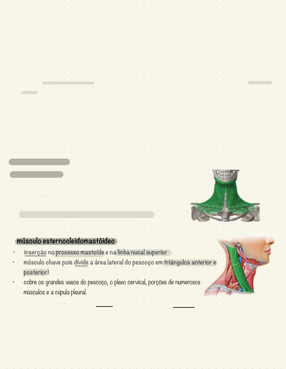 TRÍGONOS DO PESCOÇO região cervical • principal fluxo sanguíneo arterial para a cabeça e o pescoço (as artérias carótidas) e a principal drenagem venosa (as veias jugulares) ocupam posição anterolateral no pescoço. • Os vasos sanguíneos carotídeo e jugulares são as principais estruturas lesadas em feridas de pescoço por instrumentos penetrantes. • Os plexos braquiais de nervos originam-se no pescoço, seguem em sentido inferolateral, entram nas axilas e continuam até os membros superiores, os quais suprem. • inserção no processo mastoíde e na linha nucal superior • músculo chave pois divide a área lateral do pescoço em triângulos anterior e posterior) • cobre os grandes vasos do pescoço, o plexo cervical, porções de numerosos músculos e a cúpula pleural. músculo esternocleidomastóideo músculos pescoço • tem duas cabeças de origem: esternal: tendínea, arredondada / clavicular: achatada • importante na respiração quando a ventilação é elevada • contração: cabeça é inclinada lateralmente para o mesmo lado e a face é rodada para o lado oposto. • espasmo: causa torcicolo músculo platisma • é uma lâmina muscular quadrilatera, que se estende antero-lateralmente no pescoço, superficial à fáscia profunda. • insere-se na borda inferior da mandíbula. • eleva e puxa para frente a pele do pescoço e ombro. · músculo trapézio • origina-se no ⅓ medial da linha nucal superior, da protuberância occipital, dos processos espinhosos das últimas vértebras cervicais e de todas as vértebras torácicas e do ligamento supra-espinhal. • inserção: borda posterior e superfície superior do ⅓ lateral da clavícula, acrômio, espinha da escápula. TRAPÉZIO E ESTERNOCLEIDOMASTOIDEO • Inervação: • Principalmente pelo nervo acessório (XI par) • Ações: • Trapézio: eleva e roda a escápula. • Esternocelidomastóideo: flete a cabeça para a frente contra resistência. TRÍGONOS DO PESCOÇO » O quadrilátero é dividido em dois trigonos pelo músculo esternocleidomastóideo: 1. Trigono posterior; 2. Trígono anterior. Trigono posterior -é cruzado pelo ventre do músculo omo-hióideo, que divide o trigono posterior em duas partes: 1. Trigono occipital; 2. Trígono supraclavicular -conteúdo: linfonodos, nervo acessório, plexo braquial, artéria subclávia, plexo cervical e veia jugular externa obs: pode ser bloqueado com injeção de anestésico entre a primeira costela e a pele acima da clavícula. linfonodos cervicais obs: sangramento arterial mais grave inervação cervical • artéria subclávia • veia jugular externa a. subclávia v. jugular externa plexo cervical • ramos superficiais ou cutâneos: n. occipital menor, n. grande auricular, n. cervical transverso e nn. supraclaviculares. Emergem próximo ao meio da borda posterior do esternocleidomastóideo. Pode se tornar mais evidente quando o indivíduo sopra o dorso da mão. nervo acessório Nervo acessório: cruza o meio do trigono e repousa sobre o m. levantador da escapula. É parte do teto do trigono posterior. obs: soalho formado pelos músculos: • Esplênio da cabeça • Levantador da escápula • Escalenos médio e posterior • 1ª digitação do serrátil ↓ ↓ -> - - - Trígono anterior • é cruzado pelo músculo digástrico e estilo-hióideo e pelo ventre superior do omo-hióideo. , é dividido em 4 trigonos: 1. Trigono digástrico (ou submandibular) 2. Trígono submental (ou supra-hióideo) 3. Trígono carótico 4. Trígono muscular (ou carótico inferior) Ação dos músculos infra-hióideos: • Agem como um só grupo para abaixar a laringe, o osso hioide e o soalho da boca, ou para impedir sua elevação. • Osso hioide: seu nível vertical é determinado pela ação dos músculos milo-hioideo e infra-hioideos. A posição anteroposterior pelos músculos estilo-hioideo, gênio-hióideo e infra-hioídeos. • Apresentam atividade quando a boca é aberta contra resistência. Glândulas salivares • São órgãos bucais e parabucais, cujas secreções se misturam no fluido denominado saliva. • Saliva: responsável pelo umedecimento, dissolução, lubrificação do alimento e pelo início da digestão de polissacarideos por ação de enzima (ptialina). • Atendem a necessidade da presença de liquido e muco para manter a mucosa bucal sadia. • Glândulas maiores: bilaterais • Glândulas parótidas • Glândulas submandibulares • Glândulas sublinguais • Glândulas parótidas: • São as maiores • Localizadas entre o m. esternocleidomastóide o e a mandibula, interiormente ao arco zigomático, anteriormente ao meato acústico externo, justaposta ao músculo masseter e posteriormente ao ângulo da mandibula. Glândulas submandibulares: • Localizada abaixo da mandíbula • Glândulas menores • Glândulas labiais • Glândulas bucais • Glândulas palatinas • Glândulas linguais • Glândulas incisivas • Glândulas molares Glândulas sublinguais: • Situada abaixo da língua