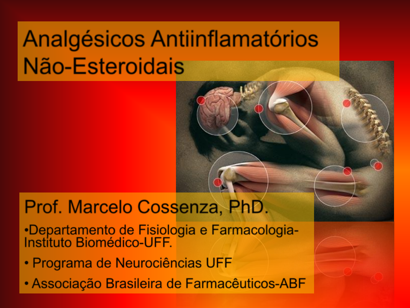 Analgésicos Antiinflamatórios Não-Esteroidais Prof. Marcelo Cossenza, PhD. •Departamento de Fisiologia e Farmacologia- Instituto Biomédico-UFF. • Programa de Neurociências UFF • Associação Brasileira de Farmacêuticos-ABF Dor: é uma experiência sensorial subjetiva e complexa, de natureza cognitiva e emocional, normalmente provocada por estímulos nocivos. Fisiopatologia da Dor Sistema Sensorial / Discriminativo Sistema Afetivo / Motivacional Sistema Cognitivo / Avaliação Dor Intensidade, Duração, Localização Perigo de implicação, Medo, Ansiedade Sofrimento, Emocional, Motivacional Estímulo nocivo ou injúria do nervo Componentes da dor: Ausência de Estímulo nocivo Dor Somática Dor Psicogênica Dor neuropática (central) Reações à dor I. Segmentares: II. Supra-segmentar: Alerta e ativação neurovegetativa. Insônia Dificuldade de concentração Palpitação, taquicardia, hipertensão Sudorese e hiperpnéia III. Cortical: Reações afetivas – emocionais Componente Afetivo Sofrimento Componente Emocional Agressividade e/ou depressão Incapacidade Física e intelectual Desconforto físico Abalos musculares Espasmo muscular Vasoconstricção local Fisiopatologia da Dor Nocicepção Fisiopatologia da Dor • Atividade do sistema Nervoso Aferente induzida por estímulos nocivos: • Exógenos (mecânicos, químicos, físicos e biológicos). • Endógenos (inflamação, isquemia tecidual). • A dor é percebida como resultado da estimulação direta dos receptores da dor- NOCICEPTORES • DOR AGUDA- Estímulo nocivo excessivo. • DOR CRÔNICA- Aberrações da via fisiológica normal. • HIPERALGESIA- Maior intensidade de dor associado a um estímulo leve. • ALODINIA- Mínimo estímulo (leve toque)-DOR • Espasmos espontâneos de dor sem qualquer estímulo desencadeante Nocicepção NOCICEPTORES Fisiopatologia da Dor Fisiopatologia da Dor Fisiopatologia da Dor Medula Mastócito Histamina S.P CGRP Edema K+ Sinal nocivo Sinal nocivo S.P CGRP PGs BK 5-HT Fibras aferentes 1árias: Fibras C e A Fisiopatologia da Dor Fisiopatologia da Dor Fisiopatologia da Dor Fisiopatologia da Dor Fisiopatologia da Dor O papel da bradicinina e prostaglandina na dor Fisiopatologia da Dor Medula Mastócito Histamina S.P CGRP Edema K+ Sinal nocivo Sinal nocivo S.P CGRP PGs BK 5-HT Fibras aferentes 1árias: Fibras C e A Fisiopatologia da Dor Mediador Fontes Efeitos primários Interleucinas 1, 2 e 3 Macrófagos, linfócitos T Ativação de linfócitos, produção de PGs TNF Macrófagos Produção de PGs Interferons Macrófagos, células endoteliais, linfócitos T Vários PDGF Macrófagos, plaquetas células endoteliais, fibroblastos, Quimiotaxia e proliferação Mediador Vasodilatação Permeabilidade vascular Quimiotaxia Dor Histamina ++ - - Serotonina +/- - - Bradicinina +++ - +++ Prostaglandinas +++ +++ + Leucotrienos - +++ - Mediadores Químicos da Inflamação: RECRUTAMENTO DE LEUCÓCITOS: Adesão mediada por selectinas e ”rooling” dos leucócitos para a superfície das células endoteliais. Imunidade e Inflamação RECRUTAMENTO DE LEUCÓCITOS: Células endoteliais ativadas por citocinas passam a expressar moléculas de adesão. MEDIADO POR SELECTINAS Imunidade e Inflamação RECRUTAMENTO DE LEUCÓCITOS: Expressão do endotélio de “Intracellular Adhesion Molecules” (ICAMS). 1. Ativação dos Neutrófilos, 2. Expressão de Selectina, 3. Integrina com baixa afinidade para ICAM, 4. Ativação celular, 5. Aumento da afinidade. Imunidade e Inflamação MIGRAÇÃO E DIAPEDESE: Adesão firme leva o neutrófilo a migrar entre as células endoteliais. O Neutrófilo migra para o sítio da infecção por detectar e seguir o gradiente de quimiocinas. Ex: IL-8, Leucotrienos, Prostaglandinas Imunidade e Inflamação RECRUTAMENTO DE LEUCÓCITOS: Depende de expressão de Moléculas de Adesão e Quimiocinas. Imunidade e Inflamação INFLAMAÇÃO – DOR, CALOR, RUBOR e EDEMA Lesão tecidual capilar extravasamento Imunidade e Inflamação Liberação do Ácido Araquidônico do Fosfolipídio Fosfatidilcolina PLA2 Ácido Araquidônico + Lisofosfocolina A fosfolipase A2 libera o ácido araquidônico da fosfatidilcolina por hidrólise da ligação entre este ácido graxo e o C2 do glicerol. - Mecrapina Quinacrina + Cálcio Liberação do Ácido Araquidônico do Fosfolipídio A histamina, a bradicinina e as citocinas podem ser os estímulos para a liberação do ácido araquidônico. Liberação do Ácido Araquidônico do Fosfolipídio cicloxigenase lipoxigenase Citocromo P450 PGG2 HPETE Epóxidos Prostaglandinas Tromboxanas Leucotrienos HETE Lipoxinas diHETE HETE O ácido araquidônico pode seguir 3 rotas metabólicas, dependendo da célula onde foi produzido. Destinos do Ácido Araquidônico Prostaciclinas Ácido Araquidônico A 5-lipoxigenase está ligada à membrana. As demais lipoxigenases estão solúveis no citosol. Membrana Citosol Formação de Leucotrienos Síntese de Leucotrienos, HETEs e Lipoxinas Formação de Leucotrienos • 15-lipoxigenase: reticulócitos, eosinófilos, linfócitos-T e céllulas do epitélio traqueal • 12-lipoxigenase: plaqueta, pâncreas, musculatura lisa vascular, células glomerulares) • 5-lipoxigenase: basófilos, leucócitos polimorfonucleares, macrófagos, e qualquer órgão que responde à inflamação. Distribuição das Isoformas da Lipoxigenase Síntese de Leucotrienos, HETEs e Lipoxinas O ácido araquidônico irá formar os derivados acíclicos, os ácidos hidroperoxieicosatetraenoicos (HPETEs). Estes originarão os ácidos hidroxieicosatatranóicos (HETEs), que medeiam quimiotaxia de eosinófilos e neutrófilos, a resposta alérgica, a inflamação e o crescimento celular. Formação de Leucotrienos 15-lipoxigenase 12-lipoxigenase 5-lipoxigenase Quimiotaxia Síntese de Leucotrienos, HETEs e Lipoxinas Formação de Leucotrienos Ou, darão origem aos leucotrienos. A maior parte dos leucotrienos é produzida pela via 5-lipoxigenase (presente nos b
