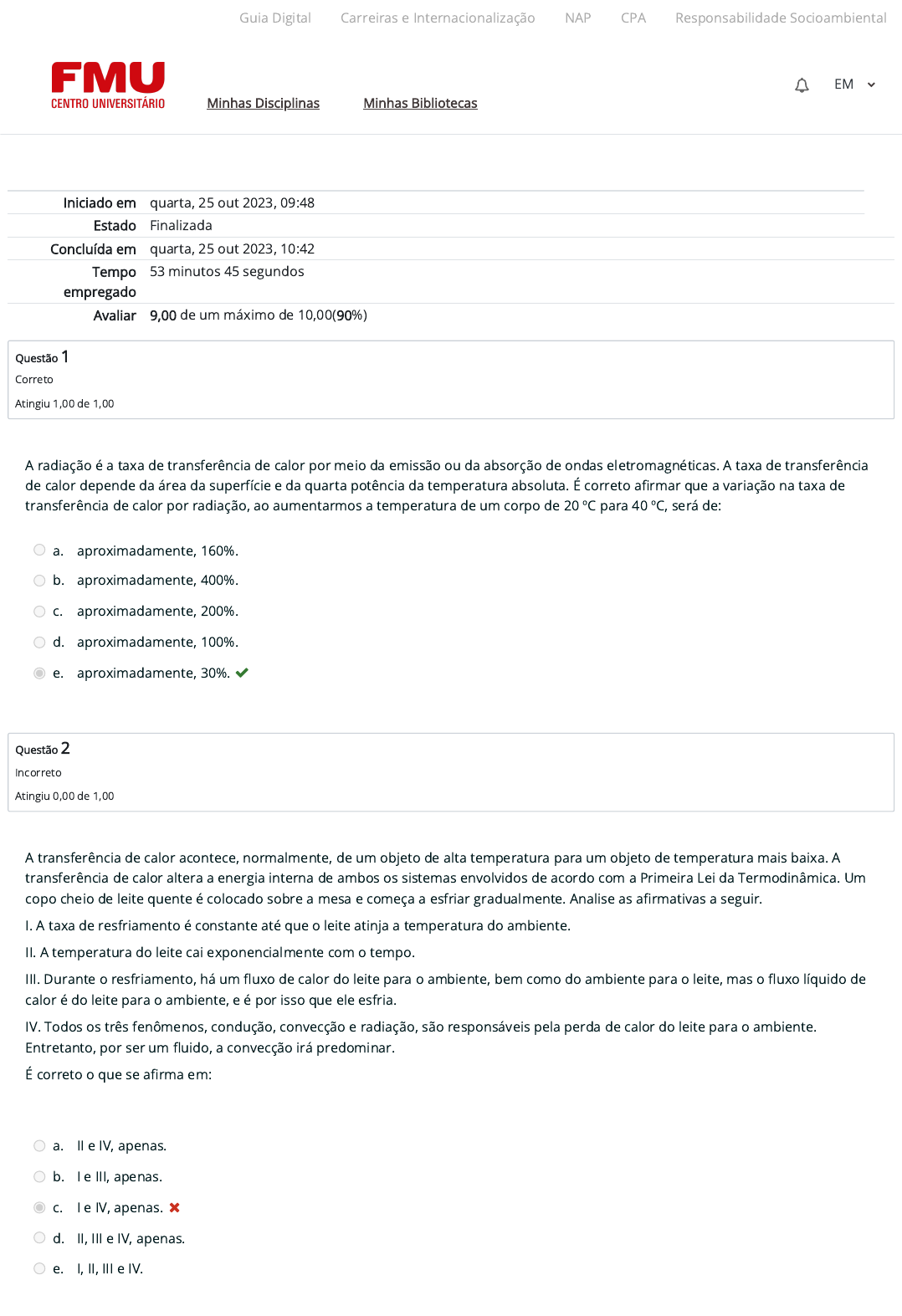25/10/2023, 10:43 Atividade 4 (A4): Revisão da tentativa https://ambienteacademico.com.br/mod/quiz/review.php?attempt=3158412&cmid=1085292 1/6 Iniciado em quarta, 25 out 2023, 09:48 Estado Finalizada Concluída em quarta, 25 out 2023, 10:42 Tempo empregado 53 minutos 45 segundos Avaliar 9,00 de um máximo de 10,00(90%) Questão 1 Correto Atingiu 1,00 de 1,00 Questão 2 Incorreto Atingiu 0,00 de 1,00 A radiação é a taxa de transferência de calor por meio da emissão ou da absorção de ondas eletromagnéticas. A taxa de transferência de calor depende da área da superfície e da quarta potência da temperatura absoluta. É correto a�rmar que a variação na taxa de transferência de calor por radiação, ao aumentarmos a temperatura de um corpo de 20 ºC para 40 ºC, será de: a. aproximadamente, 160%. b. aproximadamente, 400%. c. aproximadamente, 200%. d. aproximadamente, 100%. e. aproximadamente, 30%. A transferência de calor acontece, normalmente, de um objeto de alta temperatura para um objeto de temperatura mais baixa. A transferência de calor altera a energia interna de ambos os sistemas envolvidos de acordo com a Primeira Lei da Termodinâmica. Um copo cheio de leite quente é colocado sobre a mesa e começa a esfriar gradualmente. Analise as a�rmativas a seguir. I. A taxa de resfriamento é constante até que o leite atinja a temperatura do ambiente. II. A temperatura do leite cai exponencialmente com o tempo. III. Durante o resfriamento, há um �uxo de calor do leite para o ambiente, bem como do ambiente para o leite, mas o �uxo líquido de calor é do leite para o ambiente, e é por isso que ele esfria. IV. Todos os três fenômenos, condução, convecção e radiação, são responsáveis pela perda de calor do leite para o ambiente. Entretanto, por ser um �uido, a convecção irá predominar. É correto o que se a�rma em: a. II e IV, apenas. b. I e III, apenas. c. I e IV, apenas. d. II, III e IV, apenas. e. I, II, III e IV. Guia Digital Carreiras e Internacionalização NAP CPA Responsabilidade Socioambiental Minhas Disciplinas Minhas Bibliotecas EM https://codely-fmu-content.s3.amazonaws.com/Moodle/GuiaDigital/Guia+digital/index.html https://carreiras.fmu.br/ https://codely-fmu-content.s3.amazonaws.com/Moodle/NAP/inicial/nap/fmu/index.html https://codely-fmu-content.s3.amazonaws.com/Moodle/CPA/landing_CPA/index.html https://portal.fmu.br/sustentabilidade https://ambienteacademico.com.br/ https://ambienteacademico.com.br/ https://ambienteacademico.com.br/course/view.php?id=236 25/10/2023, 10:43 Atividade 4 (A4): Revisão da tentativa https://ambienteacademico.com.br/mod/quiz/review.php?attempt=3158412&cmid=1085292 2/6 Questão 3 Correto Atingiu 1,00 de 1,00 Questão 4 Correto Atingiu 1,00 de 1,00 Leia o trecho abaixo: Quando há combinação que possibilita a transmissão de energia por meio de condução de calor, então ocorre armazenamento de energia e misturas que ocorrem pelo movimento do �uido, acontecendo, assim, a convecção. Os processos de condução e convecção são confundidos por serem parecidos, por precisarem de um meio físico para que aconteça a transferência de calor. Entretanto a diferença é que a convecção ocorre entre �uidos. Com base nisso, sobre a Lei do Resfriamento de Newton, que embasa a convecção, analise as alternativas a seguir e marque a correta. a. Trata da igualdade de temperatura e propriedades do �uido. b. Realiza a comparação entre tipos de �uidos existentes. c. Faz a distribuição de temperatura dentro do �uido. d. Consiste na necessidade de meio físico com partículas estáticas no �uido. e. Estabelece diferença existente entre temperaturas analisadas. Leia o trecho abaixo: A transmissão de calor ou energia acontece devido à condução de calor e também ao armazenamento de energia. A convecção é a mistura que ocorre entre substâncias com temperaturas diferentes, havendo, nesse instante, a movimentação da massa em determinadas regiões de �uidos, desencadeando troca de calor entre essas regiões. De acordo com o excerto, analise as a�rmativas a seguir considerando um �uido escoando sobre uma superfície qualquer: I. Em uma superfície em contato com o �uido, primeiramente temos a condução, para depois haver a convecção. II. As partículas são conduzidas por meio de correntes de convecção até a parte da superfície que tenha temperatura menor. III. As partículas mais quentes possuem maior densidade do que as partículas menos quentes que estiverem sobre a superfície. IV. Em �uidos sobre superfícies, inexistem forças de empuxo. Tais forças existiriam caso o �uido estivesse num recipiente. É correto o que se a�rma em: a. II e III, apenas. b. I, II e III, apenas. c. I, II, III e IV. d. I e II, apenas. e. III e IV, apenas. Guia Digital Carreiras e Internacionalização NAP CPA Responsabilidade Socioambiental Minhas Disciplinas Minhas Bibliotecas EM https://codely-fmu-content.s3.amazonaws.com/Moodle/GuiaDigital/Guia+digital/index.html https://carreiras.fmu.br/ https://codely-fmu-content.s3.amazonaws.com/Moodle/NAP/inicial/nap/fmu/index.html https://codely-fmu-content.s3.amazonaws.com/Moodle/CPA/landing_CPA/index.html https://portal.fmu.br/sustentabilidade https://ambienteacademico.com.br/ https://ambienteacademico.com.br/ https://ambienteacademico.com.br/course/view.php?id=236 25/10/2023, 10:43 Atividade 4 (A4): Revisão da tentativa https://ambienteacademico.com.br/mod/quiz/review.php?attempt=3158412&cmid=1085292 3/6 Questão 5 Correto Atingiu 1,00 de 1,00 Leia o trecho abaixo: A Lei de Newton, do resfriamento, envolve h, que é o coe�ciente de transferência de calor por convecção. Tal coe�ciente refere-se a uma importante variável que possibilita a obtenção de calor entre �uidos e superfícies. Sendo assim, esse coe�ciente é utilizado para �ns de cálculos que envolvam a transferência de calor por convecção. Analise abaixo as a�rmativas e a