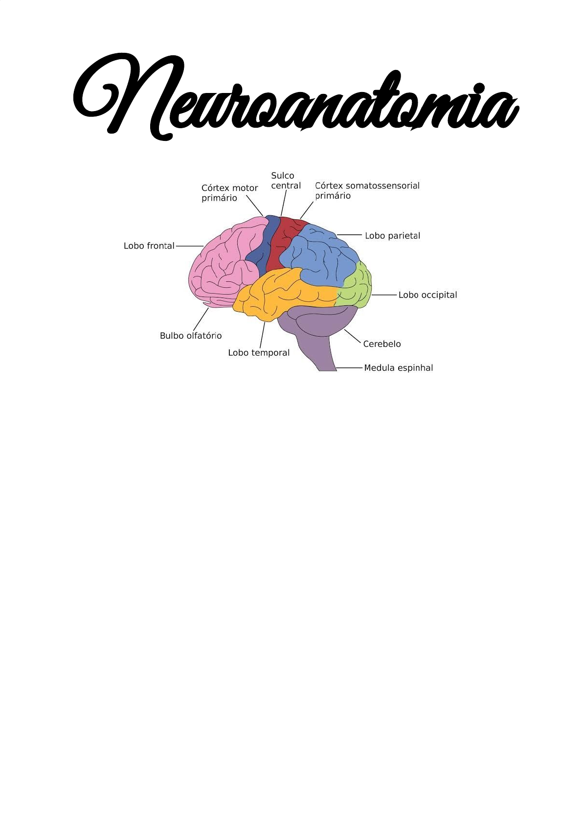 Neuroanatomia Embriologia, Divisões e Organização do SN Meninges e LCR Anatomia Macroscópica do Tronco Encefálico Nervos Cranianos Anatomia Macroscópica do Telencéfalo Núcleos da Base Sistema Nervoso Autônomo Neurônios e Sinapses Estrutura do Bulbo Vias Aferentes 1 Embriologia, Divisões e Organização do SN ❍ Divisão anatômica do SN: ❍ Encéfalo: ❍ Embriologia do SN: 2 ❍ Cristas Neurais: ✚ Dividem-se rapidamente formando a parte periférica do SN. ❍ Neurulação: ✚ O primeiro estágio é a formação de uma espessa área de células chamada placa neural. ● Placa neural: formada pelo espessamento no ectoderma (que formará no desenvolvimento cerca de 100 bilhões de neurônios). Essa placa forma-se na extremidade cranial do embrião e cresce em uma direção cranial e caudal. - Extremidade cranial = região do futuro cérebro - Extremidade caudal = região final da medula espinhal ✚ Posteriormente, a placa neural sofre uma invaginação, o sulco neural (espaço resultante das pregas nas placas neurais). ● O sulco neural se transforma na goteira neural, com duas cristas neurais presas. ✚ Ao final da 3ª. semana de vida a goteira neural se desprende do ectoderma, formando o tubo neural e, nas regiões laterais do tubo neural são formadas as cristas neurais. ● Nesse mesmo período de desenvolvimento, as bordas laterais da placa neural se elevam e se movem juntas para formar a prega neural. ✚ O Sistema Nervoso forma-se a partir da 4ª semana de vida, formando o tubo neural. ✚ As células localizadas no ectoderma, sobre a notocorda, se espessam (caracterizando o neuroectoderma – origem do sistema nervoso). ❍ Tubo Neural: ✚ Quando as pregas neurais se fundem e se transformam em tubo. ✚ É o precursor do SNC ✚ Apresenta uma luz em seu interior, o canal neural. ✚ Suas extremidades abertas são denominadas de neuróporo rostral e neuróporo caudal. ● Depois de poucos dias o fechamento dos neuroporos (junto ao estabelecimento da circulação sanguínea para o tubo neural). ✚ Dará origem a toda parte central do sistema nervoso (encéfalo e medula espinal). 3 ❍ Dilatação Do Tubo Neural: ✚ O tubo sofre três dilatações, produzindo as vesículas primitivas: prosencéfalo, mesencéfalo e rombencéfalo (neuroporo rostral) ❍ Prosencéfalo: ✚ Vesícula primordial que se dividirá em telencéfalo e diencéfalo. ● Representa as estruturas anteriores 4 ❍ Mesencéfalo: ✚ Vesícula primordial que pouco se diferencia e constitui posteriormente o próprio mesencéfalo do tronco encefálico ● Representa as estruturas do meio ● Lembra a Orelha do Mickey ❍ Rombencéfalo: ✚ A vesícula rombencefálica se diferencia posteriormente em metencéfalo e mielencéfalo. ✚ O metencéfalo originará a ponte e o cerebelo; ✚ O mielencéfalo origina o bulbo. ✚ No rombencéfalo a dilatação da luz do tubo neural forma o IVº ventrículo. ● Representa as estruturas posteriores Revisão ❍ Malformações Congênitas do SNC: 5 DESENVOLVIMENTO ANÔMALO MALFORMAÇÃO CONGÊNITA DEFEITO ESTRUTURAL MANIFESTAÇÕES CLÍNICAS Fechamento do tubo neural Anencefalia (Sem encéfalo) crânio bífido espinha bífida oculta Crânio e hemisfério cerebral ausente meningocele, meningoencefalocele, meningo – hidroencefalocele defeito do arco vertebral Natimorto variam de nenhum distúrbio a grave motor e mental com convulsões geralmente assintomático ❍ Hidrocefalia: ✚ Acúmulo de quantidades excessivas de LCS (líquido cerebroespinhal) que provocam o alargamento do ventrículo cerebral e/ou aumento da pressão intracraniana. ✚As manifestações podem incluir cabeça alargada, abaulamento da fontanela (moleira-dura), irritabilidade, letargia, vômitos e convulsões. ✚ Compressão do quiasma óptico → olhar do tipo sol poente ● Causa: congênita ou adquirida (ex: tumor no cérebro) ❍ Malformações de Chiari: ✚ 3 malformações do rombencéfalo que apresentam hidrocefalia como característica. ✚ Extensão caudal das tonsilas do cerebelo abaixo do nível do forame magno. ✚ Aproximadamente 50% dos casos tipo I estão associados a siringomielia - déficit sensitivo nos membros superiores (dormência). ● Conseguimos diagnosticar a doença pelo exame radiográfico visualizando a 1ª vértebra iniciando no bulbo. 6 Espinha bífida cística Defeito do arco vertebral com herniação das meninges (meningocele) ou meninges e medula (meningomielocele) Agenesia do corpo caloso Microcefalia Lissencefalia Diferenciação e crescimento do hemisfério cerebral ausência de corpo caloso tamanho e peso cerebral diminuídos ausência de giros corticais Varia de anestesia em sela a completa perda motora-sensitiva nas extremidades inferiores e incontinência vesical-retal varia de assintomática a retardo mental com convulsões retardo mental retardo mental e hipotonia ou espasticidade Polimicrogiria Giros corticais abundantes e de pequeno tamanho hidrocefalia (aumento de líquor no cérebro) Desenvolvimento da circulação do líquido cerebroespinhal alargamento dos ventrículos com aumento da PIC (pressão intracraniana) Retardo mental e hipotonia ou espasticidade dificuldade alimentar, vômitos, paralisia do olhar para cima, espasticidade, retardo mental, diminuição da acuidade visual ❍ Cistos Aracnóides: ✚ Contêm LCS e são formados por uma cisão anômala da aracnóide – máter. ● Possuem a mesma densidade do líquor das meninges ✚ Localização mais comum é a cisterna de sylvius (fossa craniana média) ✚ Sintomas, quando presentes, são: hipertensão intracraniana ou hidrocefalia obstrutiva. ● Locais que obstrui o líquor causa hidrocefalia → solução: cirurgia. ● Na imagem ao lado vemos a presença de cisto aracnóideo gigante presente em um paciente assintomático (devido ao volume de líquor) ❍ Espinha Bífida: ✚ Espinha Bífida Oculta: → Uma falha na coluna vertebral (ausência de uma parte) → Na região da fal