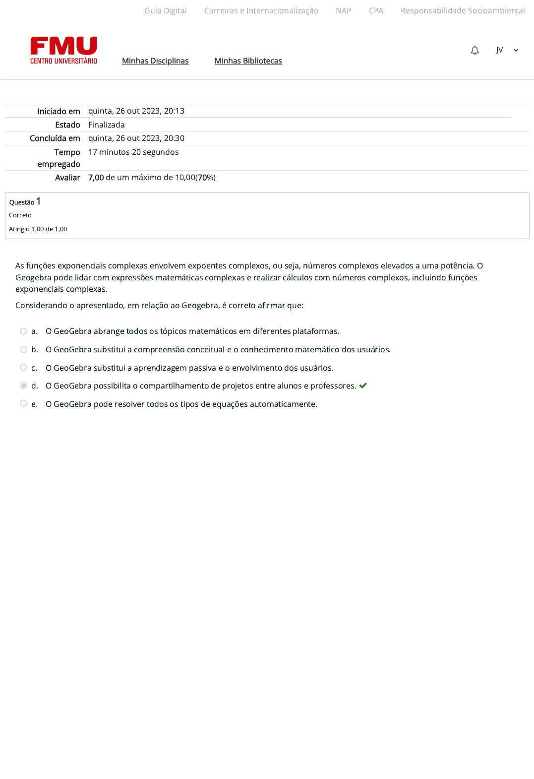 26/10/2023, 20:35 Atividade 3 (A3): Revisão da tentativa https://ambienteacademico.com.br/mod/quiz/review.php?attempt=3174975&cmid=1085436 1/6 Iniciado em quinta, 26 out 2023, 20:13 Estado Finalizada Concluída em quinta, 26 out 2023, 20:30 Tempo empregado 17 minutos 20 segundos Avaliar 7,00 de um máximo de 10,00(70%) Questão 1 Correto Atingiu 1,00 de 1,00 As funções exponenciais complexas envolvem expoentes complexos, ou seja, números complexos elevados a uma potência. O Geogebra pode lidar com expressões matemáticas complexas e realizar cálculos com números complexos, incluindo funções exponenciais complexas. Considerando o apresentado, em relação ao Geogebra, é correto a�rmar que: a. O GeoGebra abrange todos os tópicos matemáticos em diferentes plataformas. b. O GeoGebra substitui a compreensão conceitual e o conhecimento matemático dos usuários. c. O GeoGebra substitui a aprendizagem passiva e o envolvimento dos usuários. d. O GeoGebra possibilita o compartilhamento de projetos entre alunos e professores. e. O GeoGebra pode resolver todos os tipos de equações automaticamente. Guia Digital Carreiras e Internacionalização NAP CPA Responsabilidade Socioambiental Minhas Disciplinas Minhas Bibliotecas JV https://codely-fmu-content.s3.amazonaws.com/Moodle/GuiaDigital/Guia+digital/index.html https://carreiras.fmu.br/ https://codely-fmu-content.s3.amazonaws.com/Moodle/NAP/inicial/nap/fmu/index.html https://codely-fmu-content.s3.amazonaws.com/Moodle/CPA/landing_CPA/index.html https://portal.fmu.br/sustentabilidade https://ambienteacademico.com.br/ https://ambienteacademico.com.br/ https://ambienteacademico.com.br/course/view.php?id=236 26/10/2023, 20:35 Atividade 3 (A3): Revisão da tentativa https://ambienteacademico.com.br/mod/quiz/review.php?attempt=3174975&cmid=1085436 2/6 Questão 2 Incorreto Atingiu 0,00 de 1,00 Questão 3 Correto Atingiu 1,00 de 1,00 A função logarítmica desempenha um papel crucial em várias áreas da matemática e em diferentes aplicações do mundo real. Sua ausência tornaria a resolução de problemas mais complexa e limitaria nossa capacidade de modelar e compreender fenômenos com crescimento ou decaimento exponencial. Considerando o apresentado, analise as a�rmativas a seguir e assinale V para a(s) verdadeira(s) e F para a(s) Falsa(s). I. ( ) Interseção com os eixos coordenados: O grá�co de ln(x) intersecta o eixo y em (1, 0), o que signi�ca que o logaritmo natural de 1 é igual a 0. II. ( ) O grá�co da função ln(x) é simétrico em relação ao eixo y = x. Isso signi�ca que se re�etirmos o grá�co em relação a esse eixo, obteremos a mesma curva. III. ( ) À medida que x tende ao in�nito positivo, o grá�co de ln(x) cresce lentamente e se aproxima de ∞. IV. ( ) O grá�co de uma função logarítmica natural pode ser deslocado por meio de adição ou subtração de constantes dentro da função. Assinale a sequência correta: a. V, V, V, F. b. F, F, F, F. c. V, F, V, F. d. F, V, F, V. e. V, V, V, V. Nos estudos de matemática e em diversas áreas da ciência, a propriedade do logaritmo de 1 igual a zero é utilizada em aplicações práticas. Ela auxilia na modelagem de dados, na análise estatística, na resolução de problemas de engenharia, na previsão de tendências e em muitos outros campos Considerando apresentado a respeito da função logarítimica, analise as asserções a seguir e a relação proposta emntre elas: I. O logaritmo do número 1 em qualquer base é sempre igual a zero. Porque II. A propriedade nos diz que o logaritmo do número 1 é sempre igual a zero, independentemente da base do logaritmo. Matematicamente, isso pode ser expresso como logₐ(1) = 0. Assinale a alternativa correta: a. As asserções I e II são falsas. b. A asserção I é uma proposição falsa, e a II é uma proposição verdadeira. c. As asserções I e II são proposições verdadeiras, mas a II não é uma justi�cativa correta da I. d. As asserções I e II são proposições verdadeiras, e a II é uma justi�cativa correta da I. e. A asserção I é uma proposição verdadeira, e a asserção II é uma proposição falsa. Guia Digital Carreiras e Internacionalização NAP CPA Responsabilidade Socioambiental Minhas Disciplinas Minhas Bibliotecas JV https://codely-fmu-content.s3.amazonaws.com/Moodle/GuiaDigital/Guia+digital/index.html https://carreiras.fmu.br/ https://codely-fmu-content.s3.amazonaws.com/Moodle/NAP/inicial/nap/fmu/index.html https://codely-fmu-content.s3.amazonaws.com/Moodle/CPA/landing_CPA/index.html https://portal.fmu.br/sustentabilidade https://ambienteacademico.com.br/ https://ambienteacademico.com.br/ https://ambienteacademico.com.br/course/view.php?id=236 26/10/2023, 20:35 Atividade 3 (A3): Revisão da tentativa https://ambienteacademico.com.br/mod/quiz/review.php?attempt=3174975&cmid=1085436 3/6 Questão 4 Correto Atingiu 1,00 de 1,00 Questão 5 Incorreto Atingiu 0,00 de 1,00 A função logarítmica apresenta restrições quanto ao seu domínio. A base 'a' do logaritmo deve ser um número real positivo diferente de 1, ou seja, a > 0 e a ≠ 1. Essa condição é necessária porque o logaritmo de zero e de números negativos não está de�nido no conjunto dos números reais. Portanto, para garantir a existência da função logarítmica, é preciso considerar apenas valores positivos de 'x' quando 'a' é um número real positivo diferente de 1. Considere a função logarítmica f(x) = logₐ(x), em que 'a' é um número real positivo diferente de 1. Com base nas informações apresentadas, assinale a alternativa correta: a. O campo de existência da função logarítmica f(x) inclui todos os valores negativos de 'x'. b. O campo de existência da função logarítmica f(x) inclui todos os números reais. c. O logaritmo é uma função, onde o valor de zero está de�nido nos números reais. d. O logaritmo de um número negativo está de�nido nos números reais. e. O campo de ex