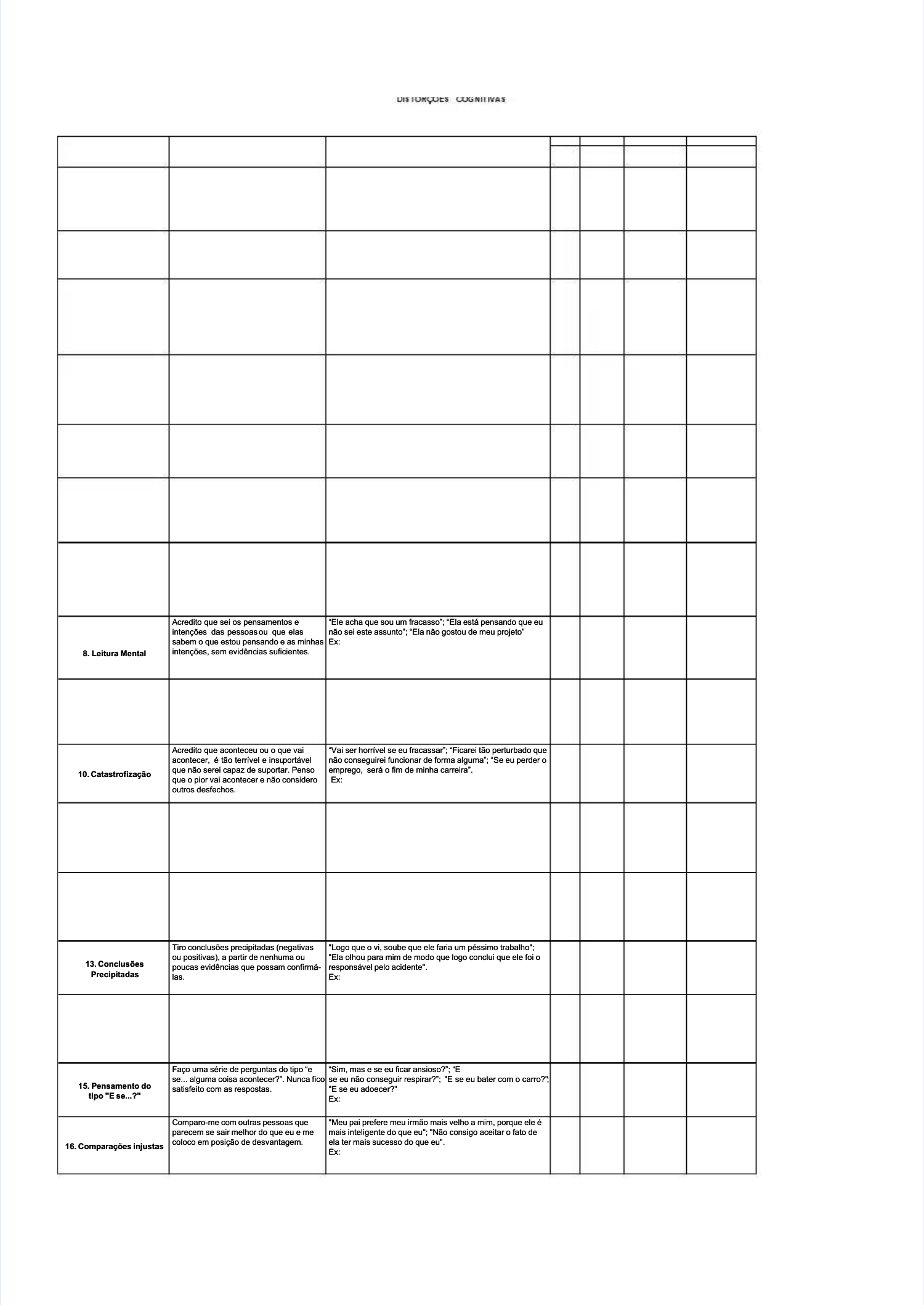 00 11 22 33 NÃNÃOO ÀS ÀS VEVEZEZESS FRFREQEQUEUENTNTEE MAIOR PARTEMAIOR PARTE DO TEMPODO TEMPO 1. Pensamento do tipo1. Pensamento do tipo "Tudo ou Nada""Tudo ou Nada" Vejo as situações, eventos ou pessoas,Vejo as situações, eventos ou pessoas, apenas em termos de "uma coisa ouapenas em termos de "uma coisa ou outra". Colocando-as apenas em duasoutra". Colocando-as apenas em duas categorias extremas. Vejo-as em termoscategorias extremas. Vejo-as em termos absolutos.absolutos. “Tudo isso foi uma perda de tempo”; “Se não sou um“Tudo isso foi uma perda de tempo”; “Se não sou um sucesso total é porque sou um fracasso”; “Ou faço istosucesso total é porque sou um fracasso”; “Ou faço isto perfeitamente, ou não vale a pena”.perfeitamente, ou não vale a pena”. Ex: No trabalho ja montei vários projetos de melhoria doEx: No trabalho ja montei vários projetos de melhoria do plano de saúde, e nada foi aprovado, já me questionei se eraplano de saúde, e nada foi aprovado, já me questionei se era realmente era capaz de está no cargo que estou hojerealmente era capaz de está no cargo que estou hoje 2. Previsão do futuro2. Previsão do futuro (adivinhação ou(adivinhação ou premunição)premunição) Eu antecipo o futuro. Penso que as coisasEu antecipo o futuro. Penso que as coisas vão piorar ou que há perigos pela frente evão piorar ou que há perigos pela frente e prevejo problemas que acabam por nãoprevejo problemas que acabam por não acontecer.acontecer. “Vou ser reprovado no exame”; “Não conseguirei “Vou ser reprovado no exame”; “Não conseguirei o emprego”;o emprego”; “Não vou gostar da festa”.“Não vou gostar da festa”. Ex:Ex: 3. Desqualificação dos3. Desqualificação dos aspectos positivosaspectos positivos Afirmo que minhas realizações são Afirmo que minhas realizações são triviais. Digo a mim mesmo que minhastriviais. Digo a mim mesmo que minhas experiências ou qualidades positivas nãoexperiências ou qualidades positivas não contam.contam. “Tirei um nota boa, mas isto não conta porque a prova foi“Tirei um nota boa, mas isto não conta porque a prova foi fácil”; fácil”; “Ter feito aquele projeto bem, não significa que e“Ter feito aquele projeto bem, não significa que euu seja competente: foi apenas sorte.”seja competente: foi apenas sorte.” Ex:Ex: 4. Raciocínio Emocional4. Raciocínio Emocional Penso que alguma coisa é verdadePenso que alguma coisa é verdade quando "sinto". quando "sinto". Acredito que minhasAcredito que minhas emoções refletem a realidade e deixo queemoções refletem a realidade e deixo que elas guiem minhas atitudes e julgamentoselas guiem minhas atitudes e julgamentos "Sinto que ela me ama, então deve ser verdade"; "Meus"Sinto que ela me ama, então deve ser verdade"; "Meus sentimentos me dizem para não acreditar nele"; sentimentos me dizem para não acreditar nele"; “Faço coisas“Faço coisas legais no trabalho, mas ainda sinto que fracassei”.legais no trabalho, mas ainda sinto que fracassei”. Ex:Ex: 5. Rotulação5. Rotulação Atribuo traços negativos a mim mesmo e Atribuo traços negativos a mim mesmo e aos outros, colocando um rótulo.aos outros, colocando um rótulo. “Ele é um mentiroso”; “Ela é “Ele é um mentiroso”; “Ela é imprestável”; “Sou um perdedor”;imprestável”; “Sou um perdedor”; “Ela é incompetente”.“Ela é incompetente”. Ex:Ex: 6. Ampliação /Minimização6. Ampliação /Minimização Avalio a mim mesmo, os outros e as Avalio a mim mesmo, os outros e as situações ampliando os aspectossituações ampliando os aspectos negativos e/ou minimizando os aspectosnegativos e/ou minimizando os aspectos positivos.positivos. “Consegui uma nota 8, isto demonstra o quanto o meu“Consegui uma nota 8, isto demonstra o quanto o meu desempenho foi ruim”; “Consegui uma nota 10, isto significadesempenho foi ruim”; “Consegui uma nota 10, isto significa que o teste foi muito fácil".que o teste foi muito fácil". Ex:Ex: 7.Abstração Seletiva (Filtro7.Abstração Seletiva (Filtro Mental ou Visão de Túnel)Mental ou Visão de Túnel) Presto atenção, quase exclusivamente,Presto atenção, quase exclusivamente, aos detalhes negativos. Raramente, notoaos detalhes negativos. Raramente, noto os detalhes positivos ou a situação comoos detalhes positivos ou a situação como um todo.um todo. “Miguel apontou um erro no meu trabalho, posso ser “Miguel apontou um erro no meu trabalho, posso ser demitido”(não considerou o feedback positivo do demitido”(não considerou o feedback positivo do Miguel);Miguel); "Não esqueço a informação que dei errada ao apresentar o"Não esqueço a informação que dei errada ao apresentar o projeto" (não considerou os aplausos dos projeto" (não considerou os aplausos dos colegas).colegas). Ex:Ex: 8. Leitura Mental8. Leitura Mental Acredito que sei os pensamentos e Acredito que sei os pensamentos e intenções intenções das pessoas das pessoas ou ou que elasque elas sabem o que estou pensando e as minhassabem o que estou pensando e as minhas intenções, sem evidências suficientes.intenções, sem evidências suficientes. “Ele acha que sou um fracasso”; “Ela está pensando que eu“Ele acha que sou um fracasso”; “Ela está pensando que eu não sei este assunto”; “Ela não gostou de meu projeto”não sei este assunto”; “Ela não gostou de meu projeto” Ex:Ex: 9. Supergeneralização9. Supergeneralização Percebo um padrão global de aspectosPercebo um padrão global de aspectos negativos com base em um úniconegativos com base em um único incidente. Assim, tomo casos negativosincidente. Assim, tomo casos negativos isolados e generalizo. Uso de formaisolados e generalizo. Uso de forma repetida as palavras: sempre, nunca, todo,repetida as palavras: sempre, nunca, todo, etc.etc. “Isso sempre me acontece. Parece que eu fracasso em“Isso se