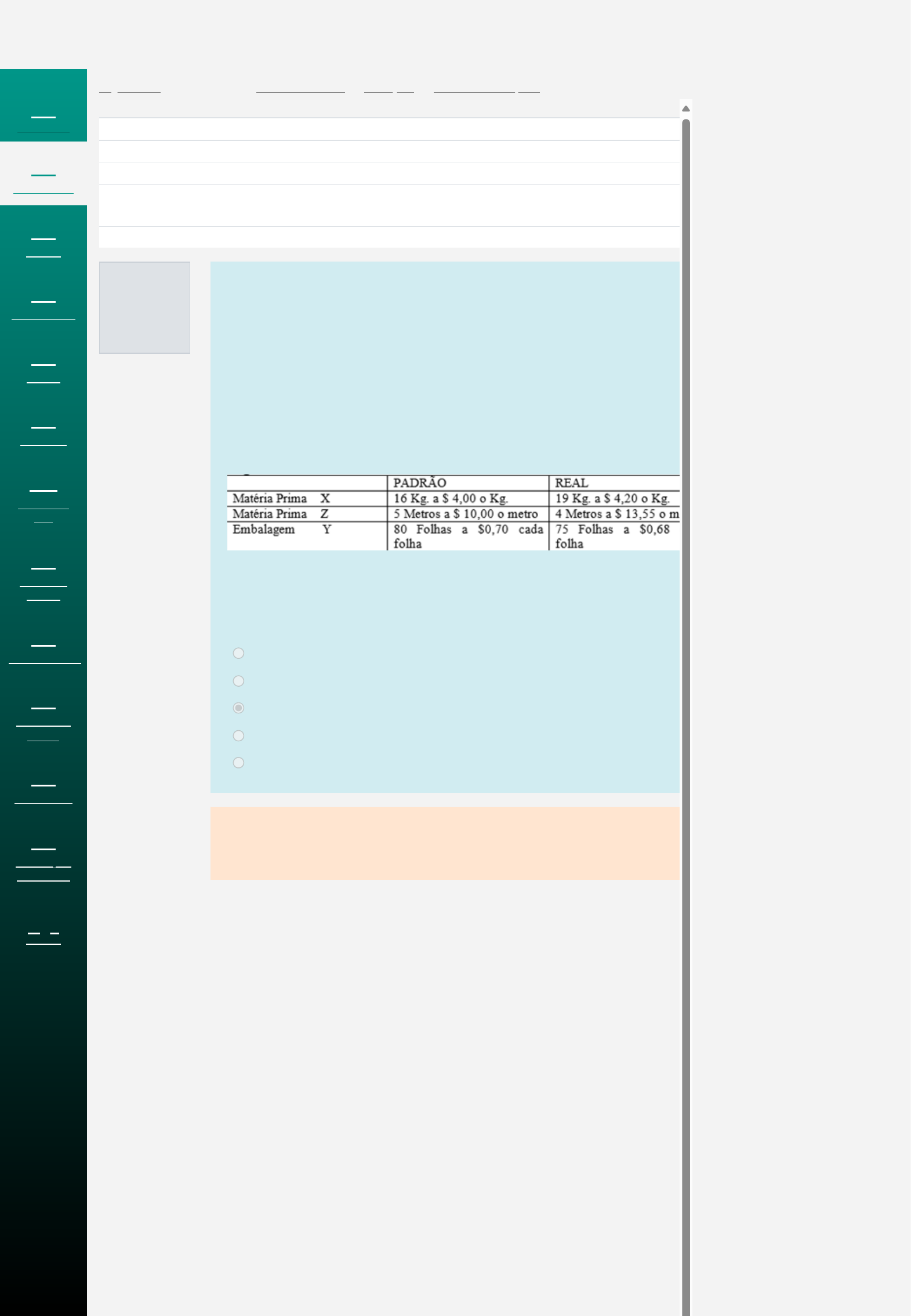 Página inicial / Meus cursos / EAD232087-85881 / Avaliações / PROVA ONLINE | AV1 Questão 1 Incorreto Atingiu 0,00 de 1,00 Iniciado em segunda, 9 Out 2023, 10:02 Estado Finalizada Concluída em segunda, 9 Out 2023, 10:58 Tempo empregado 55 minutos 45 segundos Avaliar 7,00 de um máximo de 10,00(70%) O custo-padrão é um custo pré-atribuído, tomado como base para o registro da produção antes da determinação do custo efetivo. Em sua concepção gerencial, o custo-padrão indica um “custo ideal” que deverá ser perseguido, servindo de base para a administração mediar e eficiência da produção e conhecer as variações de custo. Esse custo ideal seria aquele que deveria ser obtido pela indústria nas condições de plena eficiência e máximo rendimento A Empresa Níquel, fabricante de um único produto, tem os seguintes dados de custos: Pede-se calcular Custo padrão do material por unidade produzida Escolha uma opção: a. 213,00 b. 170,00 c. 120,00 d. 68,00 e. 87,00 Sua resposta está incorreta. A resposta correta é: 170,00 DISCIPLINAS PAINEL CALENDÁRIO BUSCA SUPORTE TUTORIAIS AVA APOIO AO ALUNO COMUNIDADES CULTURA E LAZER BIBLIOTECA PRODUÇÃO CIENTÍFICA PAINEL https://ava.unicarioca.edu.br/ead/ https://ava.unicarioca.edu.br/ead/course/view.php?id=3858 https://ava.unicarioca.edu.br/ead/course/view.php?id=3858§ionid=66556 https://ava.unicarioca.edu.br/ead/mod/quiz/view.php?id=381934 https://ava.unicarioca.edu.br/ead/ https://ava.unicarioca.edu.br/ead/my/ https://ava.unicarioca.edu.br/ead/calendar/view.php?view=month https://ava.unicarioca.edu.br/ead/search/ https://ava.unicarioca.edu.br/ead/local/support/ https://ava.unicarioca.edu.br/ead/course/view.php?id=437 https://ava.unicarioca.edu.br/ead/course/view.php?id=4058 https://ava.unicarioca.edu.br/ead/mod/page/view.php?id=11 https://ava.unicarioca.edu.br/ead/mod/page/view.php?id=12 https://ava.unicarioca.edu.br/ead/mod/page/view.php?id=13 https://ava.unicarioca.edu.br/ead/mod/page/view.php?id=14 https://ava.unicarioca.edu.br/ead/local/smt_dashboard/area-aluno.php Questão 2 Correto Atingiu 1,00 de 1,00 Questão 3 Correto Atingiu 1,00 de 1,00 As informações a seguir são relativas ao sistema de custos, produção e despesas de uma empresa que fabrica um único produto. unidades produzidas....................100.000 unidades vendidas.......................80.000 preço de venda unitário...............R$ 55,00 custos variáveis produção unit........R$ 25,00 Desp variáveis adm/venda unitárias..R$ 5,00 custos fixos produçãototais...$ 1.000.000,00 Despesas fixas de adm/venda $ 300.000,00 A partir desses dados, qual o GAO? Escolha uma opção: a. 0,57 b. 1,24 c. 2,86 d. 3,55 e. 1,69 Sua resposta está correta. A resposta correta é: 2,86 (Anulada)A Cia. Camisaria produz e vende dois tipos de camisas, com dois botões e com cinco botões. O preço de venda (PV), o custo variável (CV) e a demanda anual, por cada tipo de camisa, são os seguintes: Além disso, a Cia. Camisaria incorre em custos fixos anuais no valor de R$ 30.000. Em 2017, a empresa que fornecia botões com exclusividade para a Cia. Camisaria teve problemas e só forneceu 5.000 unidades. A Cia. Camisaria não possuía botões em estoque e visava obter o maior resultado possível com os botões disponíveis. Assinale a opção que indica a margem de contribuição da Cia. Camisaria, em 2017. Escolha uma opção: a. R$ 130.000 b. R$ 92.000 c. R$ 90.000 d. R$ 40.000 e. R$ 50.000 Sua resposta está correta. As respostas corretas são: R$ 130.000 , R$ 50.000, R$ 90.000, R$ 92.000, R$ 40.000 DISCIPLINAS PAINEL CALENDÁRIO BUSCA SUPORTE TUTORIAIS AVA APOIO AO ALUNO COMUNIDADES CULTURA E LAZER BIBLIOTECA PRODUÇÃO CIENTÍFICA PAINEL https://ava.unicarioca.edu.br/ead/ https://ava.unicarioca.edu.br/ead/my/ https://ava.unicarioca.edu.br/ead/calendar/view.php?view=month https://ava.unicarioca.edu.br/ead/search/ https://ava.unicarioca.edu.br/ead/local/support/ https://ava.unicarioca.edu.br/ead/course/view.php?id=437 https://ava.unicarioca.edu.br/ead/course/view.php?id=4058 https://ava.unicarioca.edu.br/ead/mod/page/view.php?id=11 https://ava.unicarioca.edu.br/ead/mod/page/view.php?id=12 https://ava.unicarioca.edu.br/ead/mod/page/view.php?id=13 https://ava.unicarioca.edu.br/ead/mod/page/view.php?id=14 https://ava.unicarioca.edu.br/ead/local/smt_dashboard/area-aluno.php Questão 4 Correto Atingiu 1,00 de 1,00 Questão 5 Incorreto Atingiu 0,00 de 1,00 Os custos de uma companhia representam todos os seus gastos. Portanto, ao analisá-los, o gestor pode identificar excessos e oportunidades de melhorar a aplicação de recursos. Essa gestão dos custos permite também entender como está a situação da empresa e se o negócio está lucrativo. O Custo Padrão é um critério de custo planejado para os produtos que observa eventuais modificações nas condições ambientais, empresariais e de mercado. Nesse contexto, um dos objetivos ou finalidades do Custo Padrão é? Escolha uma opção: a. avaliar alternativas de alocação de custos para maximizar ganhos nas restrições b. contribuir para a formação do custo final do estoque e respectiva avaliação c. atribuir o custo aos produtos, mediante aplicação de rateios sucessivos d. alocar os custos fixos aos produtos, mediante direcionadores de custos e. permitir aos gestores controlar e avaliar a eficiência do processo produtivo Sua resposta está correta. A resposta correta é: permitir aos gestores controlar e avaliar a eficiência do processo produtivo O grau de alavancagem (GAF) é um indicador que mostra a exposição de uma empresa ao capital de terceiros. Ou seja, a partir do momento em que uma companhia pediu um empréstimo, está alavancada, e quanto mais dívidas houver na operação, maior é o grau de alavancagem. Supondo que uma empresa apresenta um LAJIR = 30.000,00 e possui despesas financeiras (juros) no valor de 10.000,00 o LAIR = 20.000,00 ( 30.000,00 – 10.000,00). Qual seria o GAF? Escolha uma 