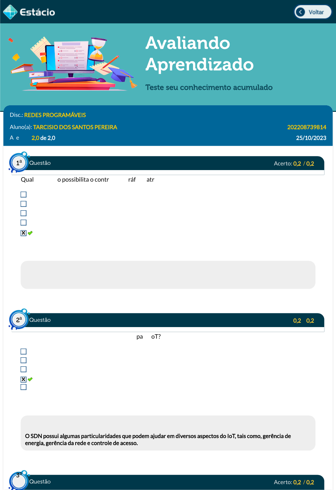 25/10/23, 18:23 Estácio: Alunos https://simulado.estacio.br/alunos/ 1/4 Avaliando Aprendizado Teste seu conhecimento acumulado Disc.: REDES PROGRAMÁVEIS Aluno(a): TARCISIO DOS SANTOS PEREIRA 202208739814 Acertos: 2,0 de 2,0 25/10/2023 Acerto: 0,2 / 0,2 Qual protocolo possibilita o controle de tráfego atribuindo um label (rótulo) a cada pacote? SSD HTTP STD OSPF MPLS Respondido em 25/10/2023 18:11:49 Explicação: O MPLS possibilita o controle de tráfego atribuindo um label (rótulo) a cada pacote Acerto: 0,2 / 0,2 Que caraterísticas tornam SDN tão atrativa para IoT? Utilizar o protocolo OpenFlow. Ter a qualidade de segurança mais apurada que outras tecnologias. Ser aplicada a qualquer equipamento. Podemos citar: gerência de energia, gerência da rede e controle de acesso. Gastar pouca energia, frente as outras tecnologias. Respondido em 25/10/2023 18:13:13 Explicação: O SDN possui algumas particularidades que podem ajudar em diversos aspectos do IoT, tais como, gerência de energia, gerência da rede e controle de acesso. Acerto: 0,2 / 0,2 Questão1 a Questão2 a Questão 3 a https://simulado.estacio.br/alunos/inicio.asp https://simulado.estacio.br/alunos/inicio.asp javascript:voltar(); javascript:voltar(); 25/10/23, 18:23 Estácio: Alunos https://simulado.estacio.br/alunos/ 2/4 Explique como ocorre o encaminhamento de pacotes no protocolo OpenFlow. Funciona a partir a da análise dos �uxos. Funciona exclusivamente por ordens da aplicação. Nenhuma das anteriores. Funciona exclusivamente pela análise do endereço de destino. Funciona por ordens exclusivas dos dispositivos. Respondido em 25/10/2023 18:14:03 Explicação: O protocolo OpenFlow se baseia no conceito de �uxos, onde o modelo de encaminhamento de dados é baseado na tomada de decisão fundamentada em algum valor, ou combinação de valores, dos campos de cabeçalho dos pacotes. Dependendo de como está con�gurado o controlador uma série de ações podem ser tomadas. Acerto: 0,2 / 0,2 Do ponto de vista da arquitetura, os controladores SDN podem ser: Nenhuma das anteriores. Centralizados ou distribuídos. Apenas distribuídos. Distribuídos ou hierárquicos. Apenas centralizados. Respondido em 25/10/2023 18:15:34 Explicação: Existe um conjunto muito diversificado de controladores e plataformas de controle, com diferentes opções de arquiteturas e de design. Assim, os controladores existentes podem ser categorizados com base em muitos aspectos. Do ponto de vista da arquitetura, um dos pontos mais relevantes é se eles são centralizados ou distribuídos. Acerto: 0,2 / 0,2 O que ocorre quando dois dispositivos NÃO possuem versões do OpenFlow compatíveis? O switch descarta todos os pacotes e não faz parte da rede. Ambos adotam a versão 0.2.0 que é a versão mais básica possível. A conexão entre os dispositivos é encerrada. O controlador exclui de sua rede o switch em questão. O switch passa a operar normalmente como se não fosse um OpenFlow enabled. Respondido em 25/10/2023 18:16:44 Explicação: Questão4 a Questão5 a 25/10/23, 18:23 Estácio: Alunos https://simulado.estacio.br/alunos/ 3/4 Quando dois dispositivos não possuem versões do OpenFlow compatíveis, uma mensagem de ERRO é gerada e a conexão entre eles é encerrada. Acerto: 0,2 / 0,2 Dentre as opções abaixo qual NÃO corresponde a um software de virtualização disponível no mercado? Vmware Fusion Mozila VirtualBox KVM Vmware Workstation Respondido em 25/10/2023 18:17:31 Explicação: O mozila não corresponde a um software de virtualização disponível no mercado Acerto: 0,2 / 0,2 O iperf é uma ferramenta amplamente usada para que? Para ligar a rede Para projeto de rede Para ampliar o sistema Para medição e ajuste de desempenho de rede Para alocação de vetores Respondido em 25/10/2023 18:18:35 Explicação: O iperf é utilizado para medição e ajuste de desempenho de rede Acerto: 0,2 / 0,2 Com o comando interessante é o dump podemos: Enviar dados Receber entradas digitais Abrir saídas digitais Receber informações complementares Ver outras informações dos componentes da topologia Respondido em 25/10/2023 18:19:52 Explicação: Ver outras informações dos componentes da topologia Questão6 a Questão7 a Questão8 a 25/10/23, 18:23 Estácio: Alunos https://simulado.estacio.br/alunos/ 4/4 Acerto: 0,2 / 0,2 Como o NFV garante �exibilidade e reduz custos operacionais das redes tradicionais? Na melhor utilização dos equipamentos pela orquestração no encaminhamento de mensagens. Através do desacoplamento entre hardware e software, para isso embracando uma VM com a função apropriada. Oferendo equipamentos especí�cos porém mais baratos. Realizando a virtualização de rede e facilitando o encaminhamento de pacotes. Não promovendo o compartilhamento de hardware, e assim fazendo-o ser dedicado a uma função. Respondido em 25/10/2023 18:20:33 Explicação: O NFV garante �exibilidade e reduz custos operacionais das redes tradicionais, através da virtualização de funções de rede e consiste no uso de equipamentos genéricos, servidores comuns e baratos para executar funções virtuais de rede. Eele realiza o desacoplamento entre hardware e software embarcando a uma VM a função de rede necessária. Acerto: 0,2 / 0,2 A arquitetura chamada de Very Simple Switch tem um único analisador, chamado: P3 PNN Packets Drop Parser Respondido em 25/10/2023 18:21:20 Explicação: Parser Questão9 a Questão10 a