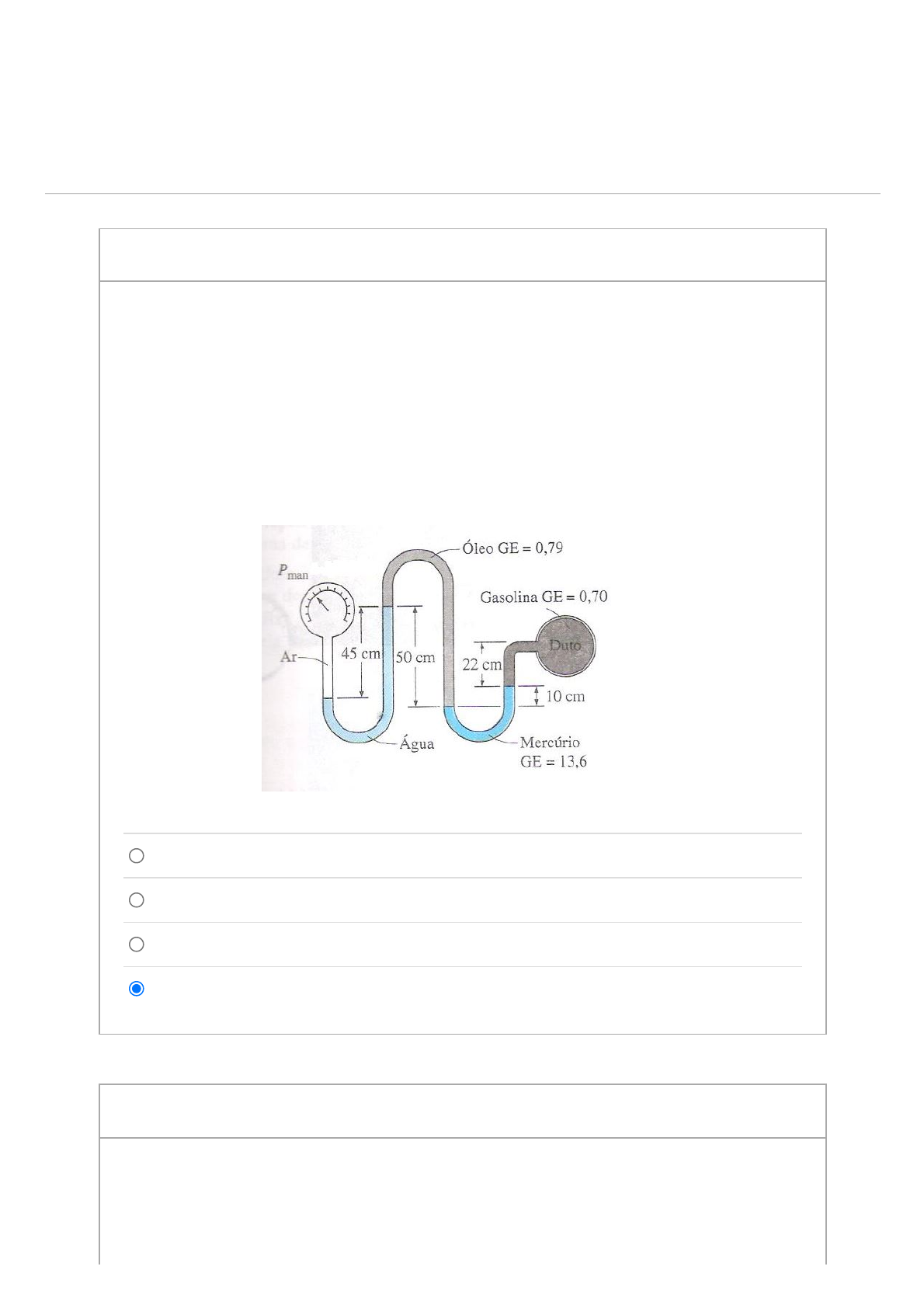 19/03/2022 18:19 Teste: UNIDADE II_parte 1_SEMI PRESENCIAL_1_2022 https://pucminas.instructure.com/courses/88671/quizzes/295483/take 1/4 UNIDADE II_parte 1_SEMI PRESENCIAL_1_2022 Iniciado: 19 mar em 16:26 Instruções do teste 1 ptsPergunta 1 225 kPa; 254 kPa; 326 kPa. 355 kPa; ÇENGEL, Yunus A.; CIMBALA, John M. Mecânica dos Fluidos - Fundamentos e aplicações. SP: McGraw-Hill, 2007 Uma linha de gasolina está conectada a um medidor de pressão através de um manômetro duplo em U, como mostra a figura. Se a leitura da pressão manométrica for de 370 kPa, determinar a pressão manométrica na linha de gasolina em (kPa). 1 ptsPergunta 2 Um manômetro diferencial é usado para a medição da pressão causada por uma diminuição da seção reta ao longo do escoamento. Determinar diferença de 19/03/2022 18:19 Teste: UNIDADE II_parte 1_SEMI PRESENCIAL_1_2022 https://pucminas.instructure.com/courses/88671/quizzes/295483/take 2/4 274,42 kPa; 375,72 kPa; 37,57 kPa; 27,42 kPa; pressão entre os pontos A e B, em (kPa). Densidade do mercúrio igual a 13,6. 1 ptsPergunta 3 ÇENGEL, Yunus A.; CIMBALA, John M. Mecânica dos Fluidos - Fundamentos e aplicações. SP: McGraw-Hill, 2007. A pressão da água escoando através de um duto é medida pelo dispositivo mostrado na figura abaixo. Para os valores indicados, determinar a pressão no duto em (kPa). 19/03/2022 18:19 Teste: UNIDADE II_parte 1_SEMI PRESENCIAL_1_2022 https://pucminas.instructure.com/courses/88671/quizzes/295483/take 3/4 124,9 kPa 134,9 kPa 33,6 kPa 23,6 kPa 1 ptsPergunta 4 A pressão exercida por um fluido em equilíbrio é proporcional à sua viscosidade; A pressão em um fluido homogêneo em equilíbrio estático varia linearmente com a profundidade; A pressão que um fluido exerce no fundo de um vaso é sempre igual ao quociente do peso do fluido pela área do fundo; Superfície de nível é uma superfície de cota nula. Assinalar a (s) frase (s) corretas: 19/03/2022 18:19 Teste: UNIDADE II_parte 1_SEMI PRESENCIAL_1_2022 https://pucminas.instructure.com/courses/88671/quizzes/295483/take 4/4 Salvo em 18:19 1 ptsPergunta 5 8,64 kPa, o escoamento ocorre de B para C. 86,4 kPa, o escoamento ocorre de B para C; 8,64 kPa, o escoamento ocorre de C para B; 86,4 kPa, o escoamento ocorre de C para B; Determinar a diferença de pressão entre os pontos B e C, em (kPa), e o sentido do escoamento na figura abaixo, considerando h = 10 cm e h = 3 cm. Densidade do mercúrio igual a 13,6. 1 2 1 ptsPergunta 6 apenas as pressões nulas e negativas; as pressões absolutas; apenas as pressões negativas. as pressões efetivas negativas, positivas e nulas; O vacuômetro indica: Enviar teste
