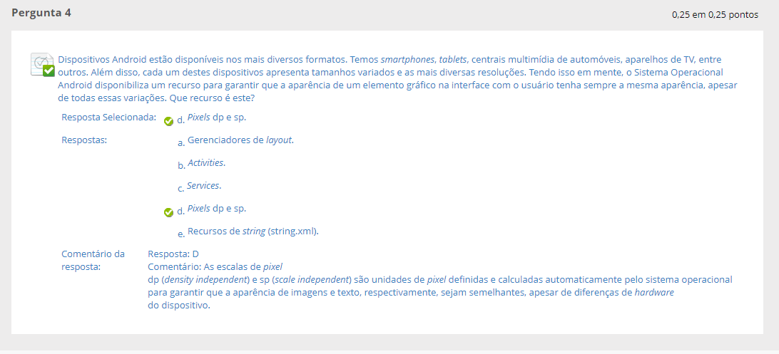 Dispositivos Android estão disponíveis nos mais diversos formatos. Temos tablets, centrais multimídia de automóveis, aparelhos de TV, entre outros. Além disso, cada um destes dispositivos apresenta tamanhos variados e as mais diversas resoluções. Tendo isso em mente, Sistema Operacional Android disponibiliza um recurso para garantir que a aparência de um elemento gráfico na interface com tenha sempre a mesma apesar de todas essas variações. Que recurso é este?