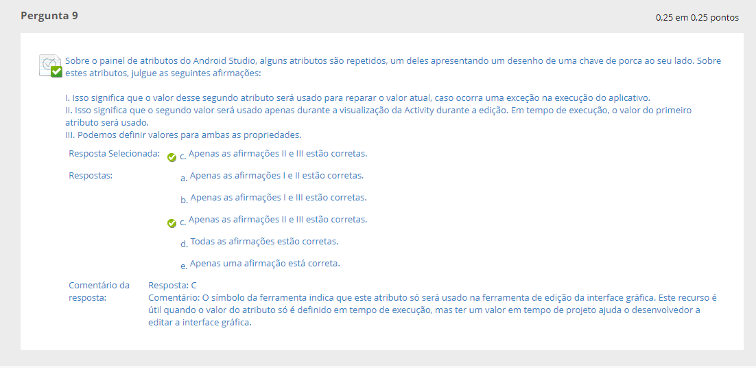 Sobre painel de atributos do Android Studio, alguns atributos são repetidos, um deles apresentando um desenho de uma chave de porca ao seu lado. Sobre estes julgue as seguintes: I. Isso significa que valor desse segundo atributo será usado para reparar valor atual, caso ocorra uma exceção na execução do aplicativo. II. Isso significa que segundo valor será usado apenas durante a visualização da Activity durante a edição. Em tempo de execução, valor do primeiro atributo será usado. III. Podemos definir valores para ambas as propriedades.