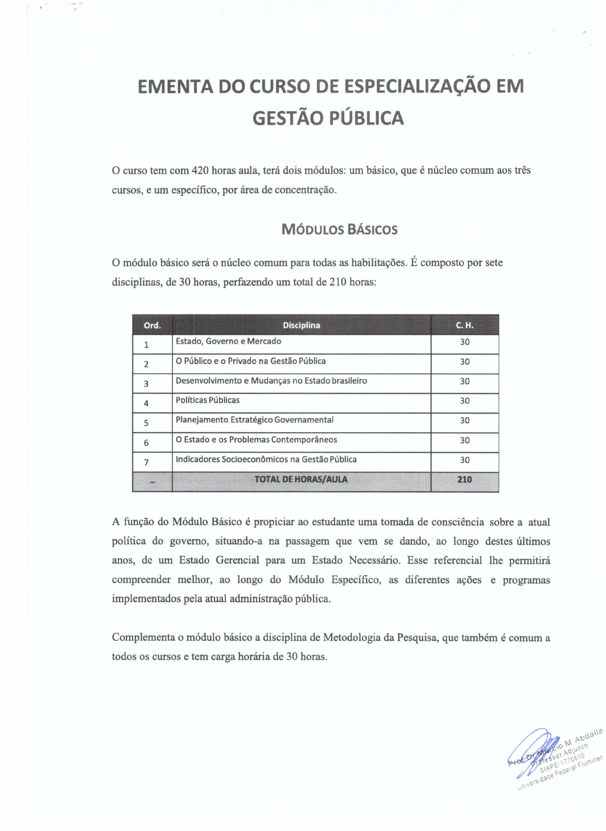 EMENTA DO CURSO DE ESPECIALIZAÇÃO EM GESTÃO PÚBLICA o curso tem com 420 horas aula, terá dois módulos: um básico, que é núcleo comum aos três cursos, e um específico, por área de concentração. MÓDULOS BÁSICOS o módulo básico será o núcleo comum para todas as habilitações. É composto por sete disciplinas, de 30 horas, perfazendo um total de 210 horas: Ord. Disciplina C.H. 1 Estado, Governo e Mercado 30 2 O Público e o Privado na Gestão Pública 30 3 Desenvolvimento e Mudanças no Estado brasileiro 30 4 Políticas Públicas 30 5 Planejamento Estratégico Governamental 30 6 O Estado e os Problemas Contemporâneos 30 7 Indicadores Socioeconômicos na Gestão Pública 30 - TOTAL DE HORAS/AULA 210 ,;;c, A função do Módulo Básico é propiciar ao estudante uma tomada de consciência sobre a atual política do governo, situando-a na passagem que vem se dando, ao longo destes últimos anos, de um Estado Gerencial para um Estado Necessário. Esse referencial lhe permitirá compreender melhor, ao longo do Módulo Específico, as diferentes ações e programas implementados pela atual administração pública. Complementa o módulo básico a disciplina de Metodologia da Pesquisa, que também é comum a todos os cursos e tem carga horária de 30 horas. Disciplina 1 - Estado, Governo e Mercado Objetivo Essa disciplina enfoca as complexas relações entre Estado, governo e mercado nas sociedades capitalistas contemporâneas. Partindo das duas matrizes teóricas que explicam as relações entre Estado e sociedade no sistema capitalista - a liberal e a marxista -, a disciplina analisa criticamente as diversas interpretações concorrentes e/ou sucessivas sobre as sempre tensas e dinâmicas relações entre Estado, governo e mercado. Ementa Os atores envolvidos na esfera pública, sejam eles governantes, funcionários, fornecedores, clientes, beneficiários, usuários de serviços públicos ou agentes objetos da regulação estatal, movem-se e posicionam-se no espaço público orientados por uma ou mais concepções teóricas concorrentes sobre as relações entre Estado, governo e mercado nas modernas sociedades capitalistas. Por essa razão, é fundamental aos gestores públicos, em exercício ou em formação - independentemente da esfera de governo em que atuem ou venham a atuar -, conhecer os diferentes fundamentos e lógicas que orientam a ação dos agentes envolvidos (stakeholders). • Relações entre Estado, governo e mercado na sociedade contemporânea, segundo as principais concepções e teorias: marxistas (PRZWORSKY, 1995) e liberais (SARTORI, 1997). • Desafios teóricos e políticos colocados aos analistas e atores políticos pelas mudanças produzidas sob o capitalismo contemporâneo (BOBBIO, 1983; GUIDDENS, 1996; ANDERSON, 1996). Referências Básicas ANDERSON, Perry. Balanço do neoliberalismo. In: SADER, Emir (Org.) Pós- neoliberalismo: as políticas sociais e o estado democrático. São Paulo: Paz e Terra, 1996. p. 9-23. BOBBIO, Norberto. Estado, governo, sociedade: para uma teoria geral da política. São Paulo: Paz e Terra, 2007. ___ o Qual socialismo? São Paulo: Paz e Terra, 1983. "Quais as alternativas à democracia representativa?", p. 55-74. GIDDENS, Anthony. Para além de esquerda e direita. São Paulo: UNESP, 1996. "Introdução", p. 9-30. RAM, Cristopher; HILL Michael. O processo de elaboração de políticas no Estado capitalista moderno. Campinas, 1996. (tradução para o português de The the modem capitalist state. Londres, 1993, sob a responsabilidade de Renato Dagnino para uso exclusivo dos alunos do Departamento de Política Científica e Tecnológica da Unicamp). Capítulos 2 e 3 (p. 39-91). O'DONNELL, Guillermo. Anotações para uma teoria do Estado. In: Revista de Cultura e Política, n. 4, 1981. OSZLAK, Oscar. Estado y sociedad:l,nuevas regIas de juego? Reforma Y Democracia. Revista dei CLAD. n. 9 (Oct. 1997), p. 7-61 PRZWORSKY, Adam. Estado e economia no capitalismo. Rio de Janeiro: Relume- Dumará, 1995. Parte 3, "O governo do capital", p. 87-115. SARTORl, Giovanni. A teoria da democracia revisitada. São Paulo: Ática, 1997. Capo6, "A democracia vertical", p.181-245. Referências Complementares BOBBIO, Norberto; BOVERO, Miche1angelo. Sociedade e Estado na fIlosofia política moderna. São Paulo: Brasiliense, 1987. CASTELLS, Manuel. A sociedade em rede. São Paulo: paz e Terra, 1999. DAHL, Robert. Um prefácio à teoria democrática. Rio de Janeiro: Jorge Zahar Editor, 1989. Capo3 - A democracia poliárquica. GIDDENS, Anthony. O Mundo na Era da Globalização. Lisboa: Editorial Presença, 2000. OFFE, Claus. Problemas estruturais do Estado capitalista. Rio de Janeiro: Tempo brasileiro, 1984. POULANTZAS, Nicos. O Estado, o poder, o socialismo. Rio de Janeiro: Graal, 1980. SANTOS, Wanderley G. Ordem burguesa e liberalismo político. São Paulo: Duas Cidades, 1978. "A práxis liberal no Brasil: propostas para reflexão e pesquisa", pp. 67- 117. SARTORl, Giovanni. Teoria democrática. São Paulo: Fundo de Cultura, 1965. CapoXV, "Liberalismo e democracia", p. 366-393. SCHUMPETER, Joseph. Capitalismo, socialismo e democracia. Rio de Janeiro: Zahar Editora, 1984. WEBER, Max. Economia e Sociedade. Rio de Janeiro, LCT, 1998. Disciplina 2 - O Público e o Privado na Gestão Pública Objetivo Essa disciplina tem por objetivo delimitar com clareza para o aluno as diferenças entre a esfera privada, que é o âmbito de atuação por excelência do administrador de empresas, e a esfera pública, na qual se situa a Administração pública e age o gestor público. Ementa Tradicionalmente, os poucos cursos de administração pública oferecidos no país partem do núcleo duro das teorias e disciplinas que compõem os currículos de administração de empresas, a ele acrescentando alguns outros temas e matérias mais diretamente ligados à gestão dos negócios públicos pelo Estado. Esse ponto de partida deixa de pôr suficientemente em relevo a di