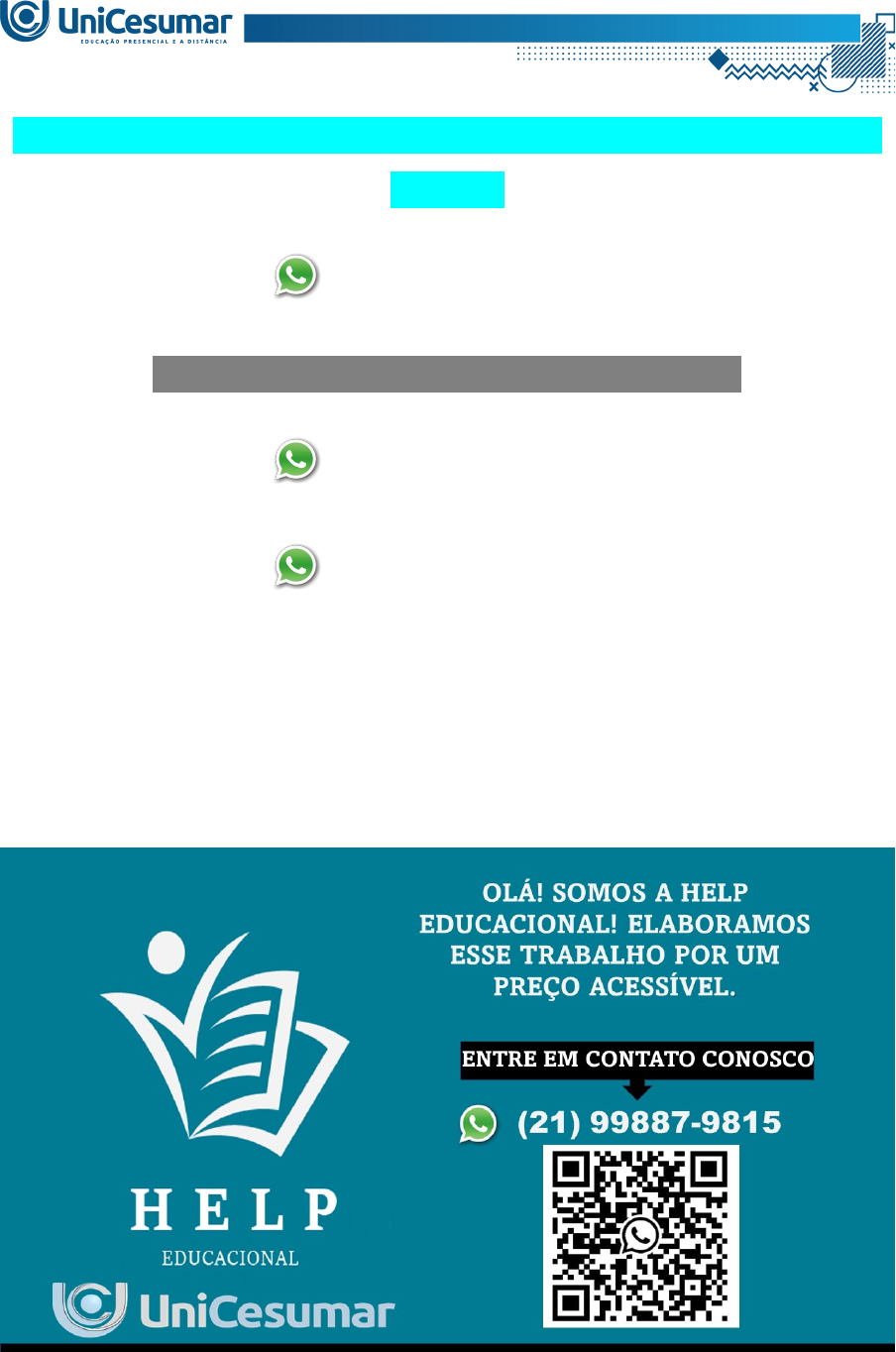 MAPA – PSICO - NEUROFISIOLOGIA E APRENDIZAGEM - 54/2023 (21) 99887-9815 ASSESSORIA NOS SEUS TRABALHOS (21) 99887-9815 (21) 99887-9815 “[...] é a partir das experiências e trocas sociais que gradualmente os sujeitos se apropriam da linguagem, tornando-a base fundamental das estruturas do pensamento.” “[...] o papel da interação verbal é central para a constituição do sujeito e para a construção de suas funções mentais, compreendendo esses processos a partir do entrelaçamento entre linguagem e cognição.” “[...] enfatizar a importância do trabalho pedagógico com os conceitos científicos para o desenvolvimento do pensamento da criança que ganha sistematicidade a partir das instruções escolares, concebendo que o desenvolvimento cria as possibilidades e a instrução as realiza.” Fonte: PINTO, G.U. Estudo de conceitos e dificuldades de aprendizagem. Journal of Research in Special Educational Needs, v. 16, p. 487-491, 2016 “[...] há relação entre o feedback do processo avaliativo e a aprendizagem dos estudantes. O termo muito utilizado na educação é proveniente da língua inglesa e pressupõe um processo de dar respostas e de realimentar determinadas situações.” “[...] o feedback é a informação que o estudante recebe sobre seu desenvolvimento na escola, o nível em que se encontra e qual ele precisa alcançar para atingir os objetivos educacionais propostos para a etapa de ensino que está cursando. De acordo com o estudo de caso realizado com uma turma do 5º ano de uma escola pública do Distrito Federal, os pesquisadores obtiveram as seguintes respostas: [...] os estudantes alegaram gostar da prática avaliativa [...] e da forma como ele retornava os seus resultados.” “[...] as recompensas - medalha e certificado - são motivações para os alunos, é uma forma de retornar a eles informações sobre seus desempenhos [...] estar associado à ideia de recompensar o esforço, melhorando a autoestima dos alunos que, por sua vez, conduz a mais esforço e, normalmente, a melhor aprendizagem.” PEREIRA, L. R. et al. Avaliação da aprendizagem: a contribuição do feedback para a aprendizagem do estudante. In: CONGRESSO NACIONAL DE EDUCAÇÃO, 7., 2020, Campina Grande. Anais [...]. Campina Grande: Realize, 2020. Disponível em: https://editorarealize.com.br/artigo/visualizar/68098. Acesso em: 1 set. 2023. A leitura dos trechos dos artigos permite perceber a complexidade do processo de aprendizagem e as inúmeras condições que o influenciam. Durante as aulas, você foi conduzido a pensar sobre como ocorre o desenvolvimento fisiológico do sistema nervoso, órgão essencial à aprendizagem. E também pode compreender o que influencia a formação das memórias e o papel do professor, fundamentais ao processo de aprendizagem. Assim, imagine-se como psicopedagogo atuando em uma sala de aula. Você está desenvolvendo uma atividade com seus alunos e deseja que o conteúdo abordado resulte em aprendizado. Para a realização desse MAPA, elabore um texto dissertativo respondendo às perguntas a seguir. Lembrando que seu texto deve conter fundamentação teórica, referência, com limite de no mínimo 20 e no máximo 25 linhas. a) Qual é a composição celular do sistema nervoso? b) Como ocorre a formação da memória de longa duração? c) Quais são as áreas cerebrais responsáveis pela coordenação da linguagem e sua localização? d) Pensando na sua atuação em sala, qual a importância do feedback na aprendizagem do seu aluno? Bons estudos! OLÁ! SOMOS A HELP EDUCACIONAL! ELABORAMOS ESSE TRABALHO POR UM PREÇO ACESSÍVEL. ENTRE EM CONTATO CONOSCO (21) 99887-9815