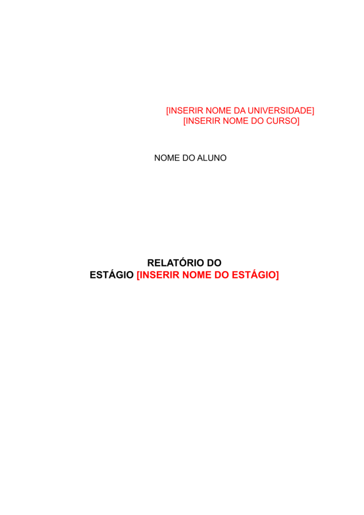 SUMÁRIO 1 LEITURAS OBRIGATÓRIAS 4 2 PROJETO POLÍTICO PEDAGÓGICO (PPP) 5 3 PLANEJAMENTO ANUAL 6 4 ABORDAGEM DOS TEMAS TRANSVERSAIS CONTEMPORÂNEOS DA BNCC 7 5 PROPOSTA DE ATIVIDADE PARA ABORDAGEM DOS TEMAS CONTEMPORÂNEOS TRANSVERSAIS DA BNCC 8 6 ATUAÇÃO DO PROFESSOR E SUA INTER-RELAÇÃO COM A EQUIPE ADMINISTRATIVA E PEDAGÓGICA 9 7 CONHECER METODOLOGIAS ATIVAS COM USO DE TECNOLOGIAS DIGITAIS 10 8 O PROCESSO DE GESTÃO ESCOLAR 11 9 ATUAÇÃO DA EQUIPE PEDAGÓGICA NO ACOMPANHAMENTO DO DESENVOLVIMENTO DA DISCIPLINA 12 10 PLANOS DE AULA 13 11 REGIMENTO ESCOLAR 14 12 ATUAÇÃO DA EQUIPE DIRETIVA 15 13 PLANO DE AÇÃO 16 CONSIDERAÇÕES FINAIS 17 REFERÊNCIAS 18 Observações: ● Deverão ser mantidos no Relatório apenas os itens correspondentes ao estágio realizado no semestre, conforme Plano de Trabalho disponível no AVA. ● Após concluir o seu relatório, será necessário atualizar o sumário. Para isso, clique sobre algum dos itens acima, com o botão direito do mouse, selecione a opção “atualizar campo” e, depois, “atualizar o índice inteiro”. 3 INTRODUÇÃO Neste item, você deve apresentar, de forma clara, o objetivo do material, ou seja, a apresentação dos resultados do estágio realizado no semestre, conforme Plano de Trabalho. Neste espaço, deve constar uma apresentação detalhada dos resultados obtidos pelo acadêmico. Observações: ● Componente do Relatório dos Estágios de Regência. ● Componente do Relatório dos Estágios de Gestão. 4 1 LEITURAS OBRIGATÓRIAS Incluir o texto elaborado com base nas leituras obrigatórias, conforme estipulado Plano de Trabalho. Observações: ● Componente do Relatório dos Estágios de Regência. ● Componente do Relatório dos Estágios de Gestão. 5 2 PROJETO POLÍTICO PEDAGÓGICO (PPP) Incluir as perguntas e respostas com base no Projeto Político Pedagógico (PPP), conforme estipulado no Plano de Trabalho. Observação: ● Componente exclusivo do Relatório dos Estágios de Regência. 6 3 PLANEJAMENTO ANUAL Incluir as perguntas e respostas com base na análise do planejamento anual da disciplina, conforme estipulado no Plano de Trabalho. Observação: ● Componente exclusivo do Relatório dos Estágios de Regência no Ensino Médio. 7 4 ABORDAGEM DOS TEMAS TRANSVERSAIS CONTEMPORÂNEOS DA BNCC Incluir as perguntas e respostas com base na análise do Guia Prático dos Temas Contemporâneos Transversais - TCTs, conforme estipulado no Plano de Trabalho. Observação: ● Componente exclusivo do Relatório dos Estágios de Regência na Educação Infantil e no Fundamental (Anos Iniciais e Anos Finais). 8 5 PROPOSTA DE ATIVIDADE PARA ABORDAGEM DOS TEMAS CONTEMPORÂNEOS TRANSVERSAIS DA BNCC Incluir a proposta de atividade para abordagem dos temas contemporâneos transversais da BNCC, conforme estipulado no Plano de Trabalho. Observação: ● Componente exclusivo do Relatório dos Estágios de Regência no Ensino Médio. 9 6 ATUAÇÃO DO PROFESSOR E SUA INTER-RELAÇÃO COM A EQUIPE ADMINISTRATIVA E PEDAGÓGICA Incluir as perguntas e respostas com base nos vídeos, conforme estipulado no Plano de Trabalho. Observação. ● Componente exclusivo do Relatório dos Estágios de Regência na Educação Infantil e no Fundamental (Anos Iniciais e Anos Finais). 10 7 CONHECER METODOLOGIAS ATIVAS COM USO DE TECNOLOGIAS DIGITAIS Incluir o texto com a solução da situação-problema com base em metodologias ativas e uso de tecnologias digitais, conforme estipulado no Plano de Trabalho. Observação: ● Componente exclusivo do Relatório dos Estágios de Regência. 11 8 O PROCESSO DE GESTÃO ESCOLAR Incluir as perguntas e respostas com base no vídeo sobre o processo de gestão escolar, conforme estipulado no Plano de Trabalho. Observação: ● Componente exclusivo do Relatório dos Estágios de Regência no Ensino Médio. 12 9 ATUAÇÃO DA EQUIPE PEDAGÓGICA NO ACOMPANHAMENTO DO DESENVOLVIMENTO DA DISCIPLINA Incluir as perguntas e respostas com base no vídeo sobre a atuação da equipe pedagógica no acompanhamento do desenvolvimento da disciplina, conforme estipulado no Plano de Trabalho. Observação: ● Componente exclusivo do Relatório dos Estágios de Regência no Ensino Médio. 13 10 PLANOS DE AULA Incluir os 2 (dois) planos de aula elaborados para as atividades de regência, conforme estipulado no Plano de Trabalho. Observação: ● Componente exclusivo do Relatório dos Estágios de Regência. 14 11 REGIMENTO ESCOLAR Incluir as perguntas e respostas com base no vídeo sobre a função do regimento escolar, conforme estipulado no Plano de Trabalho. Observação: ● Componente exclusivo do Relatório dos Estágios de Gestão. 15 12 ATUAÇÃO DA EQUIPE DIRETIVA Incluir as perguntas e respostas com base no vídeo sobre a atuação da equipe diretiva, conforme estipulado no Plano de Trabalho. Observação: ● Componente exclusivo do Relatório dos Estágios de Gestão. 16 13 PLANO DE AÇÃO Incluir o Plano de Ação elaborado, conforme estipulado no Plano de Trabalho. Observação: ● Componente exclusivo do Relatório dos Estágios de Gestão. 17 CONSIDERAÇÕES FINAIS Apresentar as considerações finais, com comentários decorrentes de reflexões acerca das atividades do estágio realizado no semestre, conforme Plano de Trabalho disponível no Plano de Trabalho. Relatar as contribuições do estágio para você, estagiário (pessoal e profissionalmente). A conclusão é o momento em que você descreve as suas impressões fundamentadas nas atividades realizadas. Dessa forma, deve-se expressar com clareza e precisão as conclusões observadas no decorrer de todas as etapas do estágio. Observações: ● Componente do Relatório dos Estágios de Regência. ● Componente do Relatório dos Estágios de Gestão. 18 REFERÊNCIAS Apresentar as referências citadas nos textos construídos para o relatório. Citar apenas as referências utilizadas, seguindo, por exemplo, os modelos a seguir: SOBRENOME, Nome do aut