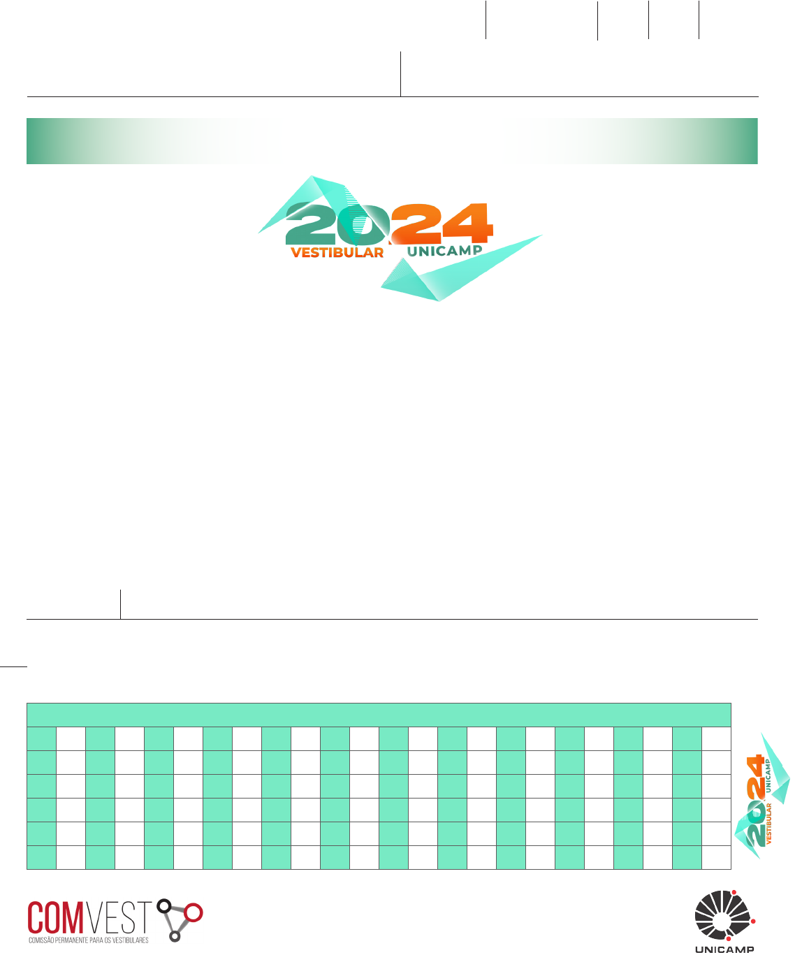 Instruções para a realização da prova — A prova de Conhecimentos Gerais é composta de 72 questões de múltipla escolha. Para cada questão, há 4 alternativas, devendo ser marcada apenas uma. — Assine, com caneta esferográfica preta, a folha de respostas. Transcreva para aquela folha as respostas escolhidas. — Ao marcar o item correto, preencha completamente o campo correspondente, utilizando caneta esferográfica preta. — Na folha de respostas, não deixe em branco nenhuma das 72 questões. — A duração total da prova é de 5 horas. NÃO haverá tempo adicional para transcrição de gabarito. — Você só poderá deixar a sala – levando APENAS o Controle de Respostas do Candidato e a Declaração de Presença (abai- xo) – 2 horas após o início da prova. INSCRIÇÃO ESCOLA SALA LUGAR NA SALA ASSINATURA DO CANDIDATONOME UNICAMP VESTIBULAR 2024 – 1ª FASE CONHECIMENTOS GERAIS CONTROLE DE RESPOSTAS DO CANDIDATO / PROVA S e W 1 7 13 19 25 31 37 43 49 55 61 67 2 8 14 20 26 32 38 44 50 56 62 68 3 9 15 21 27 33 39 45 51 57 63 69 4 10 16 22 28 34 40 46 52 58 64 70 5 11 17 23 29 35 41 47 53 59 65 71 6 12 18 24 30 36 42 48 54 60 66 72 NOME: INSCRIÇÃO: S e W CONHECIMENTOS GERAIS RASCUNHO 1 O texto a seguir será usado para responder às questões 1 e 2. QUESTÃO 1 ‘Nevou’ no Rio Em pleno verão, o fenômeno que vem chamando atenção nas ruas do Rio é conhecido como “nevada carioca”, ou apenas “nevou”. Trata-se da mania de descolorir, platinando os cabelos até os fios ficarem completamente brancos, que tomou conta das cabeças dos jovens de Norte a Sul e virou a febre do mo- mento. A onda começou às vésperas do Natal, ganhou força no réveillon e entrou em janeiro lotando os salões. Nascida nas comunidades e nos subúrbios, a tendência ultrapassou frontei- ras geográficas e sociais da cidade, principalmente depois de ganhar as redes e de ter conquistado artistas e atletas. Cabe- leireiros e donos de salão apostam que o modismo resiste com força até os dias de folia. (Adaptado de: https://oglobo.globo.com/rio/noticia/2023/01/nevou-no-rio-mania-de- -descolorir-o-cabelo-ate-ficar-quase-branco-vira-moda-entre-os-cariocas.ghtml. Acesso em 22/06/2023.) No texto, o verbo nevar apresenta sentido a) literal e é sinônimo de descolorir. b) figurado e quer dizer embranquecer. c) metafórico e é antônimo de escurecer. d) metonímico e significa cabelos brancos. QUESTÃO 2 Assinale a alternativa em que todas as palavras listadas têm um mesmo referente dentro do texto. a) fenômeno – onda – tendência – modismo b) mania – onda – febre – força c) fenômeno – momento – mania – febre d) modismo – tendência – força – momento QUESTÃO 3 Texto 1 Vivemos no limiar de uma transição, em que a automação ocu- pará cada vez mais espaços na sociedade. Neste novo cenário, há um componente atuando com desenvoltura entre nós. Suas ações e decisões, invisíveis e muitas vezes autônomas, estão cada vez mais presentes no dia a dia da vida contemporânea. Seu comportamento, no entanto, é opaco e pouco compreen- dido. Trata-se dos algoritmos. São eles que, muitas vezes, deci- dem se você é contratado ou demitido, se você vai ter acesso a um benefício social, se seu visto de imigração vai ser concedido ou negado, quais notícias você vai ver nas redes sociais, qual o melhor trajeto do trabalho para casa ou qual o parceiro mais apropriado para um relacionamento. (Adaptado de: MENDONÇA, R.F.; FIGUEIRAS, F.; ALMEIDA, V. Algoritmos controlam socie- dade e tomam decisões de vida ou morte. Folha de S. Paulo, 7 abr. 2021.) Texto 2 (Quadrinhos com o personagem laranja e amarelo, que representa um algoritmo, da sé- rie criada por André Dahmer. Disponível em: https://diplomatique.org.br/novas-tirinhas- -de-andre-dahmer-transformam-algoritmo-em-personagem-intrometido/. Acesso em 28/07/2023.) A partir do texto 1, é possível afirmar que o texto 2 explora o fato de que os algoritmos a) definem o que é melhor ou mais apropriado para cada pes- soa. b) são opacos porque aleatoriamente expõem às pessoas pro- dutos para compra. c) se servem dos nossos dados para nos oferecer continua- mente produtos a serem consumidos. d) controlam a vida humana para aperfeiçoar as nossas toma- das de decisão. QUESTÃO 4 O anúncio (Texto 1) reproduzido a seguir foi postado nas redes sociais da Portela, escola de samba carioca, para divulgar uma festa literária. A escola, que traz a águia como símbolo em to- dos os seus desfiles (Texto 2), completou 100 anos em 2023. Texto 1 Texto 2 (D isp on ív el e m : h ttp s: //w w w .in st ag ra m .c om /p /C rlV A_ tO m AW /. Ac es so e m 24 /0 6/ 20 23 .) (Á gu ia d a Po rte la n o de sfi le d e 20 17 . Fo to : R ica rd o M or ae s/ Re ut er s. 20 17 .) 2 Considerando a imagem no texto 2, podemos afirmar que o texto 1 promove uma a) fusão entre o símbolo da escola e o produto da expressão literária, que aparece materializado no desenho das asas da águia. b) relação entre a festa literária, mencionada em segundo pla- no, e o desenho do símbolo da escola, que passa a personi- ficar a literatura. c) associação das asas da águia com o título atribuído à fes- ta literária, que mostra o nome da escola antecedido pelo prefixo fli. d) ressignificação do símbolo da Portela, cujo desenho faz re- ferência direta à arte literária, para destacar o centenário da escola como tema da festa. QUESTÃO 5 O texto a seguir é um trecho da canção Pantanal, que foi tema de abertura da novela com o mesmo nome, exibida original- mente pela TV Manchete em 1990 e regravada pela TV Globo em 2022. Lendas de raças, cidades perdidas nas selvas do coração do Bra- sil. Contam os índios de deuses que descem do espaço no coração do Brasil. Redescobrindo as Américas quinhentos anos depois, Lutar com unhas e dentes pra termos direito a um depois. Fim do milênio, resgate da vida, do sonho, do bem. A terra é t