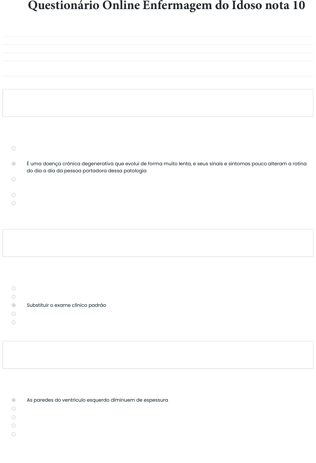 Avaliar 10,00 de um máximo de 10,00(100%) Questão 1 Completo Atingiu 1,00 de 1,00 Questão 2 Completo Atingiu 1,00 de 1,00 Questão 3 Completo Atingiu 1,00 de 1,00 Quanto à doença de Parkinson, é INCORRETO afirmar: a. Com o surgimento de medicamentos como o levodopa aumentou a expectativa de vida das pessoas portadoras do mal de Parkinson b. É uma doença crônica degenerativa que evolui de forma muito lenta, e seus sinais e sintomas pouco alteram a rotina do dia a dia da pessoa portadora dessa patologia c. Tremores dos membros superiores, alterações na marcha e no equilíbrio, rigidez muscular, micrografia, alterações sensoriais são sinais e sintomas de Parkinson d. É um distúrbio neurológico progressivo e irreversível causado pela degeneração dos neurônios e. É uma das doenças degenerativas do sistema nervoso, cujos sintomas podem ser amenizados com uso de medicamentos Os benefícios e utilidades da Avaliação Geriátrica Ampla (AGA) são todos descritos abaixo, EXCETO: a. Identificar populações de risco b. Determinar o grau e a extensão da incapacidade (motora, mental, psíquica) c. Substituir o exame clínico padrão d. Identificar fatores que predispõem à iatrogenia e permitir estabelecer medidas para sua prevenção e. Estabelecer critérios para a indicação de internação hospitalar ou em instituição de longa permanência (asilo) O envelhecimento provoca alterações cardiovasculares, está excluída a possibilidade: a. As paredes do ventrículo esquerdo diminuem de espessura b. Substituição do tecido muscular por tecido conjuntivo c. Calcificação do anel valvar d. Aumento de gordura e. Espessamento fibroso Questionário Online Enfermagem do Idoso nota 10 Brunna Realce Brunna Realce Brunna Realce Brunna Realce Questão 4 Completo Atingiu 1,00 de 1,00 Questão 5 Completo Atingiu 1,00 de 1,00 Questão 6 Completo Atingiu 1,00 de 1,00 Espera-se que, com a implementação de políticas de envelhecimento ativo (Envelhecimento ativo: uma política de saúde, OMS, 2002), haja: a. Menor qualidade de vida à medida que envelhecem b. Mais mortes prematuras em estágios da vida produtivos c. Envolvimento maior dos gerontologistas d. Menos incapacidades associadas às doenças crônicas e. Maior gasto com serviços de saúde e assistência médica O envelhecimento é um processo demográfico real no Brasil, em que em 2025 o país tende a ser a sexta maior população do mundo de idosos. Nesse contexto, temos que lembrar que essa população é a que apresenta maior gasto financeiro hospitalar, medicamentos e de cuidados. O enfermeiro é o profissional de saúde que deve avaliar e acompanhar o paciente idoso em todo o seu processo de envelhecimento, tanto na promoção da saúde quanto no processo de cura e reabilitação. Assinale abaixo a alternativa que compõe o papel do enfermeiro no contexto de promoção da saúde e prevenção de agravos aos idosos. a. Orientações sobre valores normais de glicemia em jejum, utilização do índex de Katz e comunicação terapêutica. b. Avaliação funcional, orientações sobre adesão ao tratamento para HA ou DM, realizar diálise peritoneal. c. Realizar hidratação da pele do idoso, incentivar ingesta hídrica, orientar sobre riscos de desidratação no idoso e das demais doenças. d. Avaliação funcional, gerenciamento de doentes crônicos e instalação de soroterapia. e. Avaliação funcional, incentivar ingesta hídrica, incentivar o autocuidado. O crescimento do número de idosos observado em todo mundo reflete no aumento de doenças crônicas e degenerativas responsáveis por danos às habilidades físicas, piora da qualidade de vida e sofrimento emocional do idoso. São consideradas doenças cognitivas e neurológias de idosos: a. Doença de Alzheimer e Doença de Parkinson. b. Doença de Alzheimer e Hipertensão. c. Doença de Parkinson e arterosclerose. d. Acidente Vascular Encefálico e Doença de Alzheimer. e. Osteoartrose e hipercolesterolemia. Brunna Realce Brunna Realce Brunna Realce Questão 7 Completo Atingiu 1,00 de 1,00 Questão 8 Completo Atingiu 1,00 de 1,00 Questão 9 Completo Atingiu 1,00 de 1,00 A polifarmácia está relacionada ao uso de pelo menos uma medicação sem prescrição médica num rol de prescrições supostamente necessárias. A iatrogenia medicamentosa configura o efeito patogênico de um fármaco ou da interação de vários fármacos. Referente à polifarmácia podemos afirmar que, exceto: a. Em pacientes hospitalizados, verifica-se que a frequência de reações medicamentosas iatrogênicas é três a sete vezes mais observadas nos idosos em relação aos mais jovens. b. Iatrogênico diz-se de um distúrbio ou de uma doença que é provocado pelo profissional de saúde. c. Esses fatores acabam levando a uma consequente intoxicação medicamentosa. d. Na dúvida, a conduta adequada é a manutenção da medicação. e. O diagnóstico das complicações medicamentosas nem sempre é fácil, pois a sintomatologia pode ser inespecífica. O crescimento benigno da próstata (HBP) é o crescimento tumoral mais comum do homem. Sobre a nictúria é correto afirmar: a. Está relacionada com o aumento da micção noturna b. Está relacionada com a diminuição da micção diurna c. Está relacionada com a dificuldade da micção noturna d. Está relacionada com o aumento da micção diurna e. Está relacionada com a diminuição da micção noturna Historicamente, as sociedades percebiam os idosos de formas diferentes. De acordo com as crenças e os costumes de cada civilização, é correto afirmar que: a. Os egípcios adoravam envelhecer, tentaram várias poções e providências para manter a juventude. b. Os romanos demostravam muito respeito por idosos. c. Os índios tinham nos idosos a referência de sabedoria e potencial de caça. d. Os chineses acreditavam que chegar à velhice era um evento maravilhoso que merecia a maior honra. e. Na Inglaterra, as Leis dos Pobres previam pe