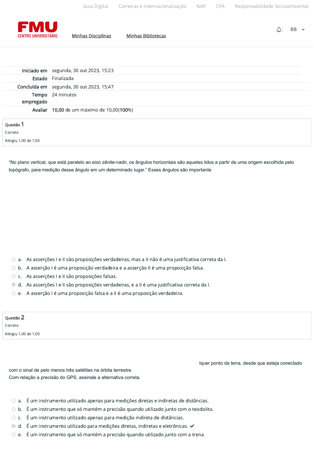 Iniciado em segunda, 30 out 2023, 15:23 Estado Finalizada Concluída em segunda, 30 out 2023, 15:47 Tempo empregado 24 minutos Avaliar 10,00 de um máximo de 10,00(100%) Questão 1 Correto Atingiu 1,00 de 1,00 Questão 2 Correto Atingiu 1,00 de 1,00 “No plano vertical, que está paralelo ao eixo zênite-nadir, os ângulos horizontais são aqueles lidos a partir de uma origem escolhida pelo topógrafo, para medição desse ângulo em um determinado lugar.” Esses ângulos são importantes para a determinação de pontos em uma locação de obra, por isso, é importante manter a precisão quando da obtenção destes valores. COELHO JUNIOR J. M. et. al. Topografia Geral. Recife: UFRPE, 2014. p. 40 Sobre esta questão, analise as asserções a seguir e a relação proposta entre elas. I. Para determinar o ângulo horizontal de um ponto deve-se manter a baliza na vertical. Pois: II. Este procedimento evita a ocorrência de erros. a. As asserções I e II são proposições verdadeiras, mas a II não é uma justi�cativa correta da I. b. A asserção I é uma proposição verdadeira e a asserção II é uma proposição falsa. c. As asserções I e II são proposições falsas. d. As asserções I e II são proposições verdadeiras, e a II é uma justi�cativa correta da I. e. A asserção I é uma proposição falsa e a II é uma proposição verdadeira. Além da estação total e do teodolito, utiliza-se, para a realização de levantamentos topográficos, os receptores GPS, cuja sigla em inglês significa Global Positioning System. Seu princípio de funcionamento é a localização de qualquer ponto da terra, desde que esteja conectado com o sinal de pelo menos três satélites na órbita terrestre. Com relação a precisão do GPS, assinale a alternativa correta. a. É um instrumento utilizado apenas para medições diretas e indiretas de distâncias. b. É um instrumento que só mantém a precisão quando utilizado junto com o teodolito. c. É um instrumento utilizado apenas para medição indireta de distâncias. d. É um instrumento utilizado para medições diretas, indiretas e eletrônicas. e. É um instrumento que só mantém a precisão quando utilizado junto com a trena Guia Digital Carreiras e Internacionalização NAP CPA Responsabilidade Socioambiental Minhas Disciplinas Minhas Bibliotecas 1 BB https://codely-fmu-content.s3.amazonaws.com/Moodle/GuiaDigital/Guia+digital/index.html https://carreiras.fmu.br/ https://codely-fmu-content.s3.amazonaws.com/Moodle/NAP/inicial/nap/fmu/index.html https://codely-fmu-content.s3.amazonaws.com/Moodle/CPA/landing_CPA/index.html https://portal.fmu.br/sustentabilidade https://ambienteacademico.com.br/ https://ambienteacademico.com.br/ https://ambienteacademico.com.br/course/view.php?id=236 Questão 3 Correto Atingiu 1,00 de 1,00 Questão 4 Correto Atingiu 1,00 de 1,00 A estrutura interna da terra é dividida em camadas: superfície terrestre, astenosfera, manto, núcleo externo e núcleo interno. Éa partir da característica líquida do núcleo externo que se associa a formação do campo magnético da terra. Esse campo surge com o movimento de rotação terrestre, que geram correntes elétricas nos fluidos do núcleo externo. Desta forma, define-se o norte magnético, que pode ser indicado através de uma bússola. Sobre esta questão, analise as asserções a seguir e a relação proposta entre elas. I. O norte magnético muda de posição ao longo do tempo. Pois: II. O magnetismo gerado pelo núcleo da terra é constante. a. A asserção I é uma proposição verdadeira e a asserção II é uma proposição falsa. b. As asserções I e II são proposições verdadeiras, e a II é uma justi�cativa correta da I. c. As asserções I e II são proposições verdadeiras, mas a II não é uma justi�cativa correta da I. d. A asserção I é uma proposição falsa e a II é uma proposição verdadeira. e. As asserções I e II são proposições falsas. A taqueometria ou estadimetria é um dos processos utilizados para calcular a distância indireta entre dois pontos ou verificar a diferença entre cotas. Os aparelhos utilizados denominam-se de taqueômetros, ou seja, um teodolito também é considerado um taqueômetro. A respeito da taqueometria na topografia, analise as afirmativas a seguir e assinale V para a(s) Verdadeira(s) e F para a(s) Falsa(s). I. ( ) Os fios estadimétricos servem para determinar os valores representados na régua estadimétrica. II. ( ) São os observados, através da mira do teodolito, os fios estadimétricos superior, médio, inferior e intermediários. III. ( ) Um teodolito também é considerado como um taqueômetro. IV. ( ) Não é possível identificar a escala métrica em uma régua estadimétrica. a. F, V, F, V. b. V, F, V, V. c. V, V, F, F. d. V, V, V, V. e. V, F, F, V. Guia Digital Carreiras e Internacionalização NAP CPA Responsabilidade Socioambiental Minhas Disciplinas Minhas Bibliotecas 1 BB https://codely-fmu-content.s3.amazonaws.com/Moodle/GuiaDigital/Guia+digital/index.html https://carreiras.fmu.br/ https://codely-fmu-content.s3.amazonaws.com/Moodle/NAP/inicial/nap/fmu/index.html https://codely-fmu-content.s3.amazonaws.com/Moodle/CPA/landing_CPA/index.html https://portal.fmu.br/sustentabilidade https://ambienteacademico.com.br/ https://ambienteacademico.com.br/ https://ambienteacademico.com.br/course/view.php?id=236 Questão 5 Correto Atingiu 1,00 de 1,00 Questão 6 Correto Atingiu 1,00 de 1,00 Na realização de levantamentos topográficos com o Teodolito, existem três procedimentos que podem ser realizados em relação a mira. O direcionamento da visada tem relação com o cálculo realizado para obtenção dos valores dos ângulos horizontais e verticais. Desta forma, devem ser consideradas para a medição de distâncias as visadas ascendentes, descendentes e perpendiculares. A figura abaixo representa os três tipos de visadas. Figura- Representação das visadas: Ascendente - A; Perpendicu