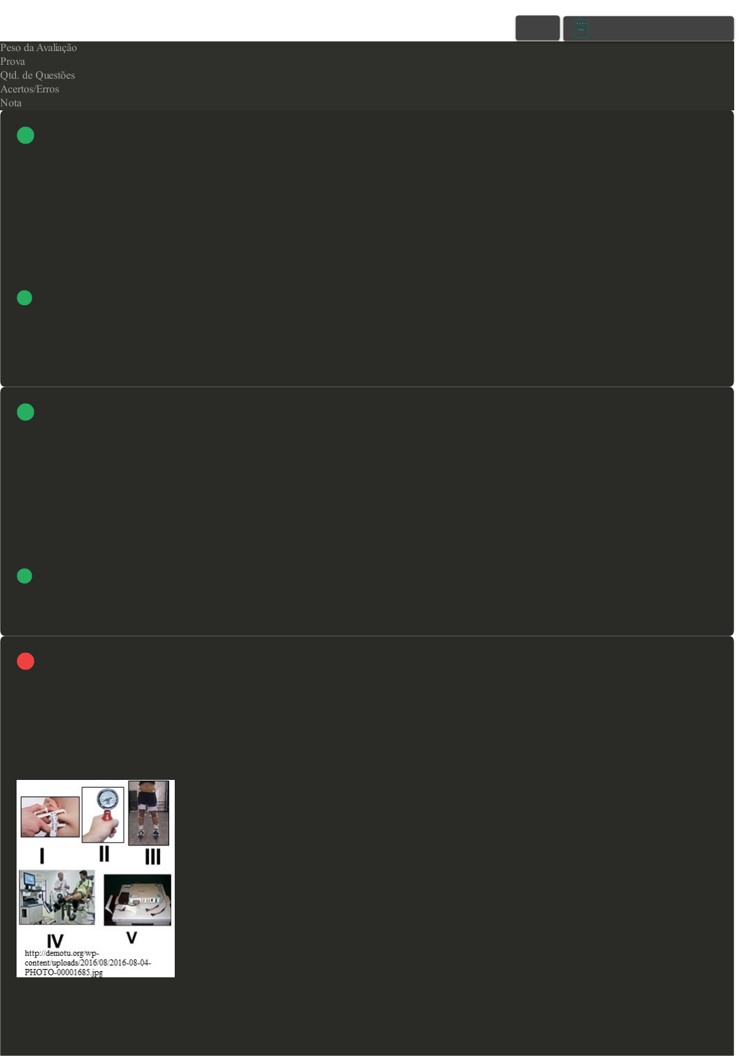30/10/2023, 16:37 Avaliação I - Individual about:blank 1/3 Prova Impressa GABARITO | Avaliação I - Individual (Cod.:884438) Peso da Avaliação 1,50 Prova 71987079 Qtd. de Questões 10 Acertos/Erros 5/5 Nota 5,00 A cinesiologia surgiu a partir do interesse dos homens em entender o comportamento motor dos animais. Estes movimentos eram relacionados aos movimentos do homem, como andar, nadar, correr etc. Sobre pontos importantes da História que influenciam direta e indiretamente a Cinesiologia e Biomecânica, analise as sentenças a seguir: I- Arquimedes, utilizando a diferenciação do volume, estipulou os princípios hidrostáticos dos corpos flutuantes. Estes ensinamentos são utilizados até os dias de hoje em esportes aquáticos. II- Newton foi o primeiro a acertar a forma dos diferentes órgãos do corpo humano, dando importância aos mais pequenos detalhes no estudo da Anatomia. III- Estudando animais em seus ambientes naturais, Aristóteles, através de análise geométrica, retirou os conceitos que descreviam a ação dos músculos. IV- Leonardo Da Vinci também foi um dos grandes contribuintes para o melhor conhecimento do centro de gravidade humana. Assinale a alternativa CORRETA: A As sentenças II e IV estão corretas. B As sentenças I, III e IV estão corretas. C As sentenças I, II e IV estão corretas. D As sentenças I e II estão corretas. Biomecânica é uma disciplina, entre as ciências provenientes das ciências naturais, que se ocupa com análises físicas de sistemas biológicos, consequentemente, análises físicas de movimentos do corpo humano. Estes movimentos são estudados através de leis e padrões mecânicos em função das particularidades específicas do sistema biológico humano, englobando conhecimentos anatômicos e fisiológicos. Assinale a alternativa CORRETA que se refere ao panorama atual da biomecânica (recursos usados pela biomecânica): FONTE: LEITE, Werlayne Stuart Soares. Biomecânica aplicada ao esporte: contribuições, perspectivas e desafios. Efdeportes.com, Buenos Aires, v. 145, n. 15, p. 1- 1, maio 2010. Disponível em: . Acesso em: 19 abr. 2017. A Matemática, física, massagem, anatomia, fisiologia e controle motor. B Controle motor, quiropraxia, anatomia, fisiologia, computação e física. C Matemática, física, programação, anatomia, fisiologia e controle motor. D Matemática, física, programação, anatomia, fisiologia e terapia manual. Biomecânica é uma disciplina entre as ciências derivadas das ciências naturais, que se ocupa de análises físicas de sistemas biológicos. Através dela, torna-se possível analisar as causas e os fenômenos do movimento e, por sua vez, compreender a complexidade do movimento humano. A Biomecânica pode ser subdividida em duas áreas de estudo: biomecânica interna (consiste nas forças internas, como forças musculares, forças nos tendões, ligamentos e ossos) e biomecânica externa (estuda as grandezas observáveis externamente na estrutura do movimento). Sobre tipos de avaliações da biomecânica e comparando as imagens, analise as sentenças a seguir: I- A imagem I apresenta sensores para avaliação cinemática. II- A imagem V é um dinamômetro e a IV é um dinamômetro isocinético. III- A imagem III apresenta sensores para avaliação cinemática e a I medida de espessuras das dobras cutâneas. IV- A imagem V é um aparelho de eletromiografia e a II é um dinamômetro pneumático. Assinale a alternativa CORRETA: FONTE: VITAL, Jessica Patrícia Madureira. Biomecânica: Análise do Movimento Humano: Classificação Temporal de Ações Humanas. 2015. 92 f. Dissertação (Mestrado) - Curso de Engenharia, Departamento de Física e Matemática, Instituto Superior de Engenharia de Coimbra, Coimbra, 2015. Cap. 1. Disponível em: http://files.isec.pt/DOCUMENTOS/SERVICOS/BIBLIO/Teses/Tese_Mest_Jessica-Madureira-Vital.pdf. Acesso em: 2 maio 2017. A As sentenças II e IV estão corretas. VOLTAR A+ Alterar modo de visualização 1 2 3 30/10/2023, 16:37 Avaliação I - Individual about:blank 2/3 B As sentenças I e III estão corretas. C As sentenças II e III estão corretas. D As sentenças III e IV estão corretas. A Cinesiologia é o estudo do movimento humano, caracteristicamente no contexto do esporte, arte ou medicina. Diante deste conceito, no que retrata a finalidade da Cinesiologia, assinale a alternativa CORRETA: A A finalidade é aplicar as leis da física, leva ainda em consideração as características do aparelho locomotor. B A finalidade é procura medir, modelar, explicar, categorizar e catalogar. C A finalidade é trata lesões de atletas de alto nível. D A finalidade da cinesiologia é melhorar o desempenho humano, inclusive na prevenção de lesões, por meio da compreensão das forças que atuam sobre um objeto ou o corpo humano. [Laboratório Virtual - Movimentos da articulação do quadril] O quadril, ou articulação coxofemoral, é formado pelos ossos da bacia (pelve) e pelo fêmur, o osso mais longo do corpo humano. O quadril proporciona movimento e estabilidade ao corpo, atuando de forma sincronizada durante a marcha com toda a musculatura dos membros inferiores, coluna e pelve (GONÇALVES et al., 2020). Sobre a articulação do quadril, assinale a alternativa CORRETA: Fonte: GONÇALVES, Kamila Caixeta et al. Principais patologias ortopédicas pediátricas do quadril: uma revisão de literatura. Brazilian Journal Of Health Review, Curitiba, v. 3, n. 2, p. 3218-3230, 1º jan. 2020. Disponível em: https://ojs.brazilianjournals.com.br/ojs/index.php/BJHR/article/view/8888/7633. Acesso em: 12 jan. 2023. A Os movimentos do quadril em amplitudes maiores estão também intrinsecamente ligados à biomecânica da coluna lombar. B Para realizar a abdução do quadril é necessária uma combinação de todos os movimentos que são executados pelo quadril, em todos os planos. C O movimento de quadril necessário para outras atividades costuma exigir amplitude de movimento