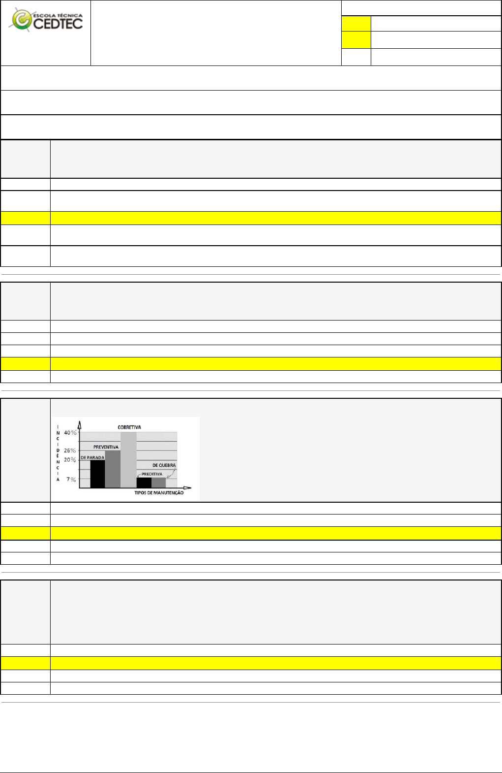Pincel Atômico - 30/10/2023 20:59:46 1/1 WASHINGTON RODRIGUES DO PRADO Exercício Caminho do Conhecimento - Etapa 4 (13754) Atividade finalizada em 30/10/2023 20:50:30 (1301485 / 1) LEGENDA Resposta correta na questão # Resposta correta - Questão Anulada X Resposta selecionada pelo Aluno Disciplina: MANUTENÇÃO ELÉTRICA [926138] - Avaliação com 4 questões, com o peso total de 13,00 pontos [capítulos - 112] Turma: Curso Técnico: Eletrotécnica - Grupo: EAD - 05/23 - EAD ELE [99779] Aluno(a): 91146911 - WASHINGTON RODRIGUES DO PRADO - Respondeu 4 questões corretas, obtendo um total de 13,00 pontos como nota [350060_1536 14] Questão 001 No uso de multímetros em medidas elétricas: Um multímetro analógico requer uma pequena bateria interna para operar na escala de tensão ou corrente. A ligação de um multímetro analógico na escala de corrente, em série com um circuito, cuja corrente DC se deseja medir, pode ser feita independentemente da polaridade dos terminais. X Na função de medidor de resistência (ohmímetro), caso a resistência esteja energizada, o multímetro pode ser danificado. Os multímetros digitais, quando utilizados para a medição de tensão, caso sejam colocados em série com um circuito a ser medido, podem causar danos ao circuito elétrico e ao próprio multímetro. Os multímetros digitais, quando utilizados para a medição de corrente, não acarretam problemas se colocados em paralelo a um circuito elétrico, pois apresentam resistência interna muito elevada. [350060_1536 15] Questão 002 Durante a manutenção de uma instalação elétrica de baixa tensão, verificou-se que um cabo isolado, com isolação de PVC, estava sobrecarregado. O eletricista optou por trocar esse cabo por um outro de mesma bitola, porém com isolação de XLPE. A respeito dessa opção, conclui-se que a(o): Adoção de cabos com isolação de XLPE agrava o problema da sobrecarga. Adoção de cabos com isolação de XLPE não é indicada para instalação de baixa tensão. Troca da isolação não interfere na capacidade de condução do cabo elétrico. X Problema da sobrecarga é possível de ser solucionado com a isolação de XLPE. Problema da sobrecarga não é possível de ser solucionado mantendo-se a mesma bitola. [350061_1536 07] Questão 003 Os tipos de manutenção em uma fábrica foram distribuídos, conforme o gráfico a seguir. Os tipos de manutenção em uma fábrica foram distribuídos, conforme o gráfico a seguir. O acompanhamento das condições dos equipamentos foi bem realizado. A distribuição dos tipos de manutenção indica o bom desempenho da manutenção X As manutenções preventiva, de parada e preditiva foram deficientes. Ela apresentou poucas paradas. A manutenção de quebra indica que a manutenção corretiva foi bem realizada. [350061_1536 09] Questão 004 Na garantia de uma instalação elétrica de qualidade e segurança, devem ser utilizados materiais e componentes adequados, devidamente dimensionados e necessários. Alguns componentes são indispensáveis na proteção dos circuitos e das pessoas. Em relação aos dispositivos de proteção, “o disjuntor termomagnético tem como função garantir a manobra e proteção dos circuitos contra sobrecarga de ____________. Quanto ao ________, é responsável por proteger a instalação elétrica contra surtos de ______________ causados por __________________. Por fim, o(a) __________ é um dispositivo com função de garantir a proteção das pessoas contra ______________________ por contatos direto ou indireto.” Assinale a alternativa que completa correta e sequencialmente a afirmativa anterior. Corrente / DR / tensão / descargas atmosféricas / DPS / choques elétricos X Corrente / DPS / tensão / descargas atmosféricas / DR / choques elétricos Corrente / DR / choques elétricos / DPS / tensão / descargas atmosféricas Tensão / DPS / corrente / descargas atmosféricas / DR / choques elétricos