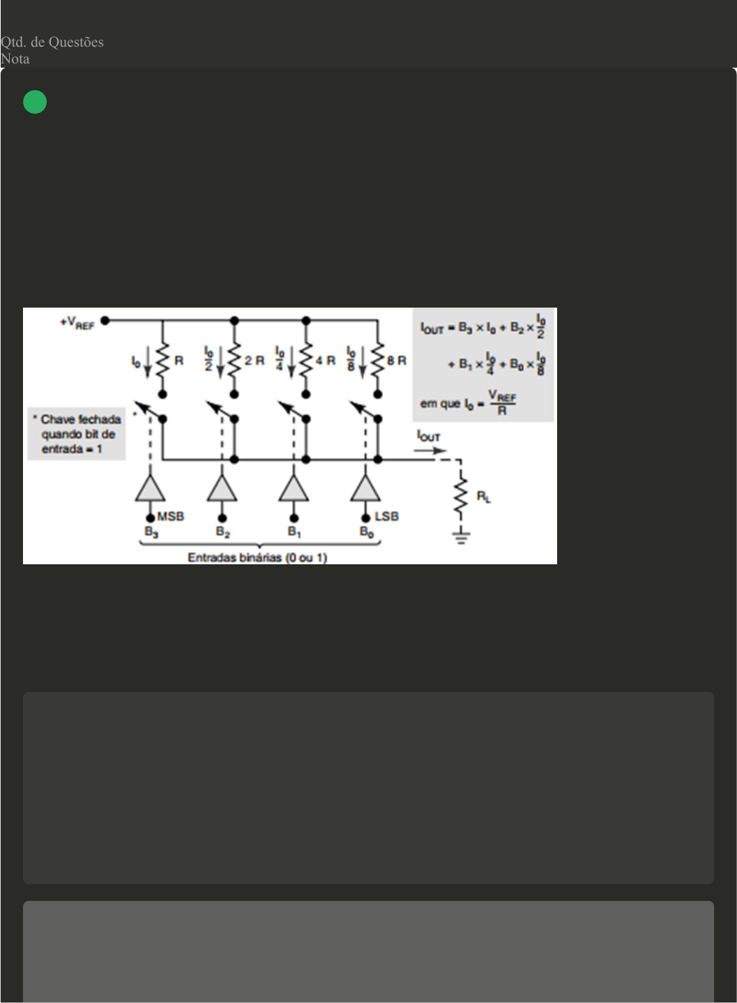 Qtd. de Questões 2 Nota 10,00 A figura a seguir mostra um circuito básico que gera uma corrente de saída (valor analógico) cujo valor é proporcional à entrada binária. Este circuito é um DAC de 4 bits que utiliza ponderação binária por resistores. Este circuito utiliza quatro ramos de corrente, sendo cada um destes controlado por uma chave semicondutora. O estado de cada chave (ligado/desligado) é controlado pelos níveis lógicos das entradas binárias. Considere Vref = 5V e R = 5k Omhs. FONTE: TOCCI, Ronald J. Sistemas digitais: princípios e aplicações. 11. ed. São Paulo: Pearson Prentice Hall, 2011. Determine a resolução e a saída de fundo de escala para o DAC abaixo. Considere RL muito menor que R. Resposta esperada Temos que Iout = Vref/R = (5 V)/(5 k ohms) = 1 mA Que é o peso do MSB. As outras três correntes são dadas por 0,5 mA, 0,25 mA e 0,125 mA. Portanto o LSB = 0,125 mA. Resolução = 0,125 mA. A saída de fundo de escala ocorrerá quando as entradas binárias estiverem em nível alto, portanto, Iout = 1+0,5+0,25+0,125 = 1,875 mA. Minha resposta A saída de fundo de escala ocorrerá quando as entradas binárias estiverem em nível ALTO, de maneira que cada chave de corrente seja fechada, chave fechada quando o bit de entrada do DAC for = 1. a corrente de 1 saída é proporcional a VREF. Se for aumentada ou diminuída, a resolução e a saída de fundo de escala mudarão proporcionalmente. Logo mais para calcularmos Iout precisamos saber Io= Vref/R Io= 5V / 5k Ôhms Io = 1mA Esse é o peso do MSB, as outras correntes serão Io/2, Io/4 e Io/8 = 0,5, 0,25 e 0,125 mA, o LSB é 0,125mA. Como já sabemos a corrente para cada chave, podemos simplesmente somar as correntes para ter a Corrente de saída Fundo de escala para corrente para um DAC de 4 bits correspondente ao dígito 1111; Iout= 1 + 0,5 + 0,25 + 0,125 = 1,875 mA. Para Iout ser precisa, RL deveria estar em curto com GND. Uma maneira comum de implementar isso é usando um amplificador operacional na configuração de conversor corrente-tensão, Iout do DAC é conectada a entrada negativa do AMP-OP, virtualmente no potencial GND. A realimentação negativa do amplificador operacional força uma corrente igual a Iout a fluir por RF para gerar Vout = -Iout x RF. Assim, Vout será uma tensão analógica proporcional a entrada binária do DAC. Essa saída analógica pode acionar uma ampla variedade de cargas sem ficar sobrecarregada. Retorno da correção Parabéns, acadêmico, sua resposta atingiu os objetivos da questão e você contemplou o esperado, demonstrando a competência da análise e síntese do assunto abordado, apresentando excelentes argumentos próprios, com base nos materiais disponibilizados. Considerando que um sensor de pressão trabalhe com uma área de atuação que varie entre 10 PSI e 330 PSI, caso utilize uma saída de 4 mA a 20 mA. Encontre a equação da reta que apresenta a resposta do sensor e calcule o sinal, em corrente, para uma pressão de 115 PSI. Resposta esperada O coeficiente angular da reta: m=(20-4)/(330-10)=16/320=0,05 A equação da reta é dada por: y=0,05(x-10)+4=0,05.x-0,5+4= y=0,05.x+3,5 Para uma entrada de 115 PSI: y=0,05.115+3,5=9,25 mA Minha resposta Para calcular a equação da reta; m = (20-4) mA / (330-10 ) PSI ~= 0,05 Para calcular o valor da corrente, para uma pressão de 115 PSI Y = 0,05 . (115-10) + 4 Y = 0,05 . 105 + 4 Y = 9,25 mA Assim, encontramos que uma saída de 9,25mA corresponde a 115 PSI. Retorno da correção Parabéns, acadêmico, sua resposta atingiu os objetivos da questão e você contemplou o esperado, demonstrando a competência da análise e síntese do assunto abordado, apresentando excelentes argumentos próprios, com base nos materiais disponibilizados. 2 Imprimir