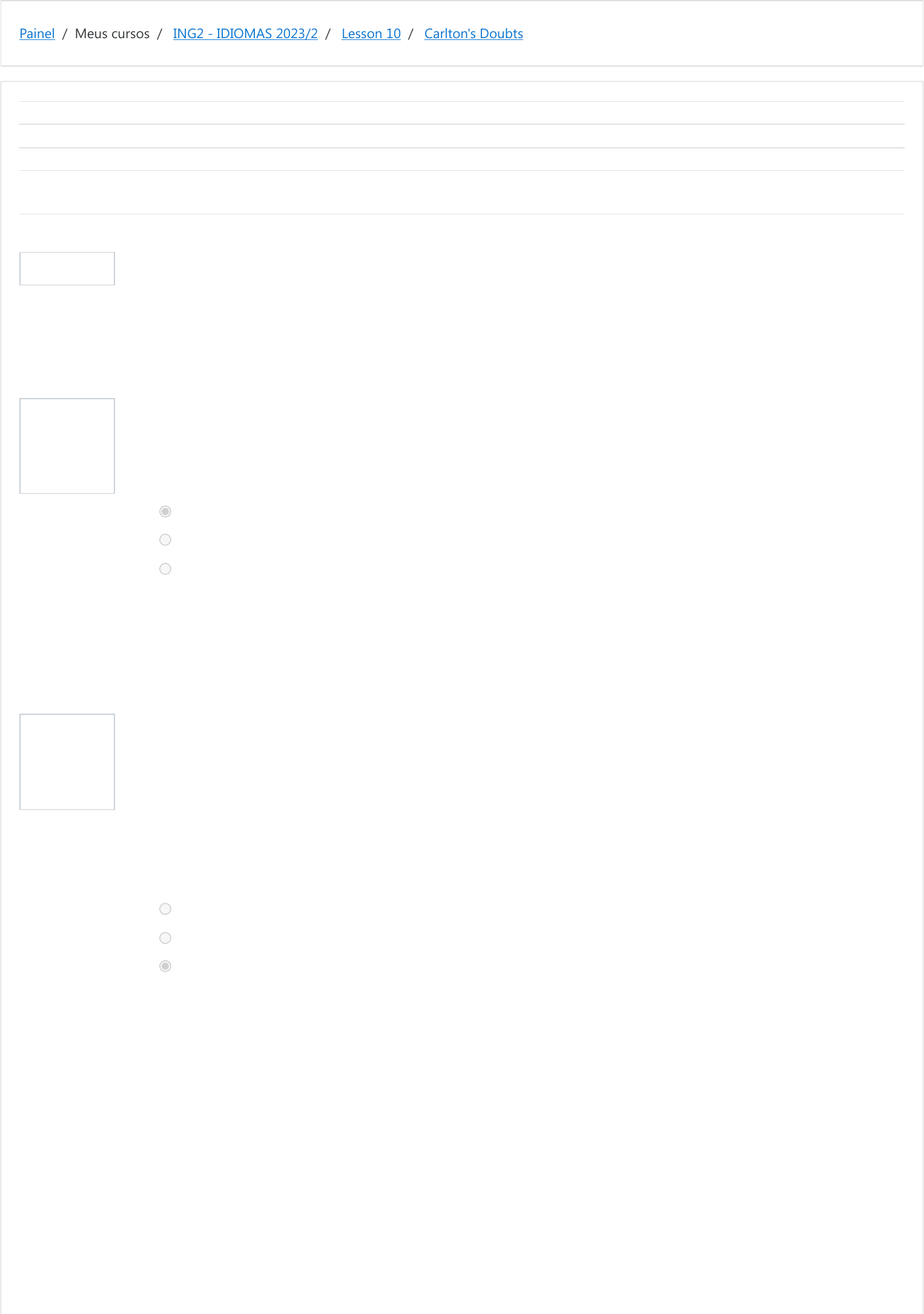 Painel / Meus cursos / ING2 - IDIOMAS 2023/2 / Lesson 10 / Carlton's Doubts Informação Questão 1 Correto Atingiu 2,00 de 2,00 Questão 2 Correto Atingiu 2,00 de 2,00 Iniciado em terça, 31 out 2023, 09:02 Estado Finalizada Concluída em terça, 31 out 2023, 09:03 Tempo empregado 1 minuto 4 segundos Avaliar 10,00 de um máximo de 10,00(100%) In the Warming Up section you read a conversation between Carlton, Sarah and Bruno. Read the conversation again and check the best answer. Sarah: Oh my gosh! You're not gonna believe it, they stole the document! They took it with all of Jason's stuff! In the conversation, Carlton and Sarah mention an object that was stolen. What object do they talk about? Escolha uma opção: a document a wallet a motorcycle Sua resposta está correta. A resposta correta é: a document Carlton: I told you! Sarah: Told me what? Carlton: I'm not stupid, I know what's going on. Sarah: What do you mean? Carlton believes that Escolha uma opção: Steve is lying to Sarah. Sarah is lying to Jason. Sarah is lying to him. Sua resposta está correta. A resposta correta é: Sarah is lying to him. https://moodle.ifsul.edu.br/novohamburgo/my/ https://moodle.ifsul.edu.br/novohamburgo/course/view.php?id=357 https://moodle.ifsul.edu.br/novohamburgo/course/view.php?id=357#section-16 https://moodle.ifsul.edu.br/novohamburgo/mod/quiz/view.php?id=56817 Questão 3 Correto Atingiu 2,00 de 2,00 Questão 4 Correto Atingiu 2,00 de 2,00 Questão 5 Correto Atingiu 2,00 de 2,00 Bruno: Sarah, only Jason's stuff is not here? Sarah: Looks like it. Carlton found really strange that Escolha uma opção: only Sarah's money was stolen. only Sarah's things were stolen. only Jason's things were stolen. Sua resposta está correta. A resposta correta é: only Jason's things were stolen. Carlton: Isn't it weird that they didn't take any of YOUR stuff? Sarah: Wait a minute... The only thing I had was some money in the... No! They took all my money too! Actually, Sarah was also stolen. What was taken? Escolha uma opção: Her motorcycle. Her money. Her glasses. Sua resposta está correta. A resposta correta é: Her money. Bruno: Look, Sarah, do you really trust your boyfriend? Maybe you should consider the idea that HE did it. Sarah: What? (pause) Although Jason is a little crazy, he could never do that after all we've been through! Or could he? It is clear that Carlton doesn't believe Jason. How does Sarah feel about her boyfriend? Escolha uma opção: She believes him completely. She doesn't believe him. She believes him, but she starts getting suspicious of him. Sua resposta está correta. A resposta correta é: She believes him, but she starts getting suspicious of him. ◄ Someone stole the document (apostila) Seguir para... Languages In Canada ► https://moodle.ifsul.edu.br/novohamburgo/mod/resource/view.php?id=56815&forceview=1 https://moodle.ifsul.edu.br/novohamburgo/mod/quiz/view.php?id=56818&forceview=1