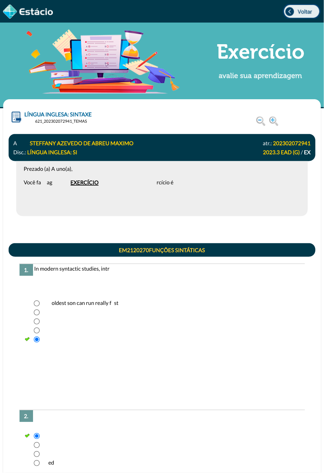 Exercício avalie sua aprendizagem In modern syntactic studies, intransitive verbs can be divided in two groups: unergative and unaccusative. There are many ways for distinguishing them and the subject semantic role is one of them: subjects of unergative verbs are usually agents, whereas subjects of unnacusative are not. Based on it, what is the option with an unaccusative verb? What is the syntactic function of the underlined term in the sentence "the number of vegetarians is growing in Brazil"? LÍNGUA INGLESA: SINTAXE Lupa DGT0621_202302072941_TEMAS Aluno: STEFFANY AZEVEDO DE ABREU MAXIMO Matr.: 202302072941 Disc.: LÍNGUA INGLESA: SI 2023.3 EAD (G) / EX Prezado (a) Aluno(a), Você fará agora seu EXERCÍCIO! Lembre-se que este exercício é opcional, mas não valerá ponto para sua avaliação. O mesmo será composto de questões de múltipla escolha. Após responde cada questão, você terá acesso ao gabarito comentado e/ou à explicação da mesma. Aproveite para se familiarizar com este modelo de questões que será usado na sua AV e AVS. EM2120270FUNÇÕES SINTÁTICAS 1. My oldest son can run really fast. My mother sang all night long. It¿s raining cats and dogs. I walked through the woods. His poor child fell. Data Resp.: 31/10/2023 13:03:18 Explicação: A resposta correta é: His poor child fell. 2. Predicate. Predicator. Subject. Predicative. javascript:voltar(); javascript:voltar(); javascript:voltar(); javascript:voltar(); javascript:diminui(); javascript:diminui(); javascript:aumenta(); javascript:aumenta(); Analyze the following excerpt and choose the option that best explains the relationship between the relative clause and its antecedent. An of�cial with the California Air Resources Board, [which oversees the state's carbon-offset program], declined to comment on CarbonPlan's �ndings. Source: Forests Used as Carbon Offsets Are Going Up in Wild�re Flames - The New York Times (nytimes.com) Mark the alternative presenting a relative pronoun that could replace which. Not all things which are old get replaced with new. Object. Data Resp.: 31/10/2023 13:03:42 Explicação: Aresposta correta é: Predicate. 03083AS ORAÇÕES SUBORDINADAS ADJETIVAS 3. The nonrestrictive relative clause contains essential information to de�ne its referent "of�cial", explaining his duties. The nonrestrictive relative clause provides omissible information on the function of its referent, "the California Air Resources Board". The restrictive relative clause re�nes its referent "of�cial", explaining his duties. The restrictive relative clause provides omissible information on the function of its referent, "the California Air Resources Board". The relative adverbial explains how its referent, "the California Air Resources Board", intends to reduce carbon emissions. Data Resp.: 31/10/2023 13:04:32 Explicação: The use of the relative pronoun "which" is indicative of the fact that the referent of the relative clause is non- human, in this case, "the California Air Resources Board". Besides, the use of comma or dash to set apart the relative clause from the main clause is a distinctive trait of nonrestrictive relative clauses. Nonrestrictive relative clauses provide additional information, that is, information that is omissible. The only correct option is thus: The nonrestrictive relative clause provides omissible information on the function of its referent, "the California Air Resources Board". 4. Who Whom Why That Whose Data Resp.: 31/10/2023 13:04:56 Explicação: When the referent is non-human, which or that should be preferred. Therefore, only that is the correct alternative. Who and whom refer to humans, while why refers to cause and whose to possession. Since this is a restrictive relative clause which and that are interchangeable. One case of inversion in English is formed by a group of clauses with opening auxiliary MAY used in a similar way to express a strong wish, as we see in the following: Sentences in English have interesting characteristics. In terms of word order patterns, it is correct to af�rm that: Read the text below: Virologist at Columbia University Angela Rasmussen suggests avoiding public transportation, if possible, especially if crowded. "Any type of public transportation that has a lot of people crowded together in an enclosed, poorly ventilated space is an environment with increased transmission risk," Rasmussen tells Newsweek. "This especially applies to packed subway cars or public buses." Feinberg says there is not an issue with ventilation within subway cars; in fact, MTA's numbers surpass the recommendation promoted by the CDC. [1] Though there are no standards for subway cars, the MTA has adapted the guidelines for the air exchange rates for health care facilities. She says that [2] while the recommendation from 02915A INVERSÃO 5. May I go home? May I help you? May I jump in? May it be said that we agree! May it eat now? Data Resp.: 31/10/2023 13:05:16 Explicação: The sentence "May it be said that we agree!" is the only case of inversion in English formed with opening auxiliary MAY used in a similar way to express a strong wish. In the other options MAY is expressing either permission or offer. 6. negative sentences follow the prototypical canonical VS Word order. negative sentences do not follow the prototypical canonical SV Word order. af�rmative sentences do not follow the prototypical canonical SV Word order. interrogative sentences follow the prototypical canonical SV Word order. interrogative sentences do not follow the prototypical canonical SV word order. Data Resp.: 31/10/2023 13:05:43 Explicação: In English interrogative sentences are the only ones not to follow the prototypical canonical SV word order. Af�rmative and negative sentences thus follow what is considered to be the canonical word order, that is, SV (subject-verb). Interrogative sentences are the exception to the rule. 03082AS ORAÇÕES SUBORDINADAS ADVERBIAIS 7. the CDC 